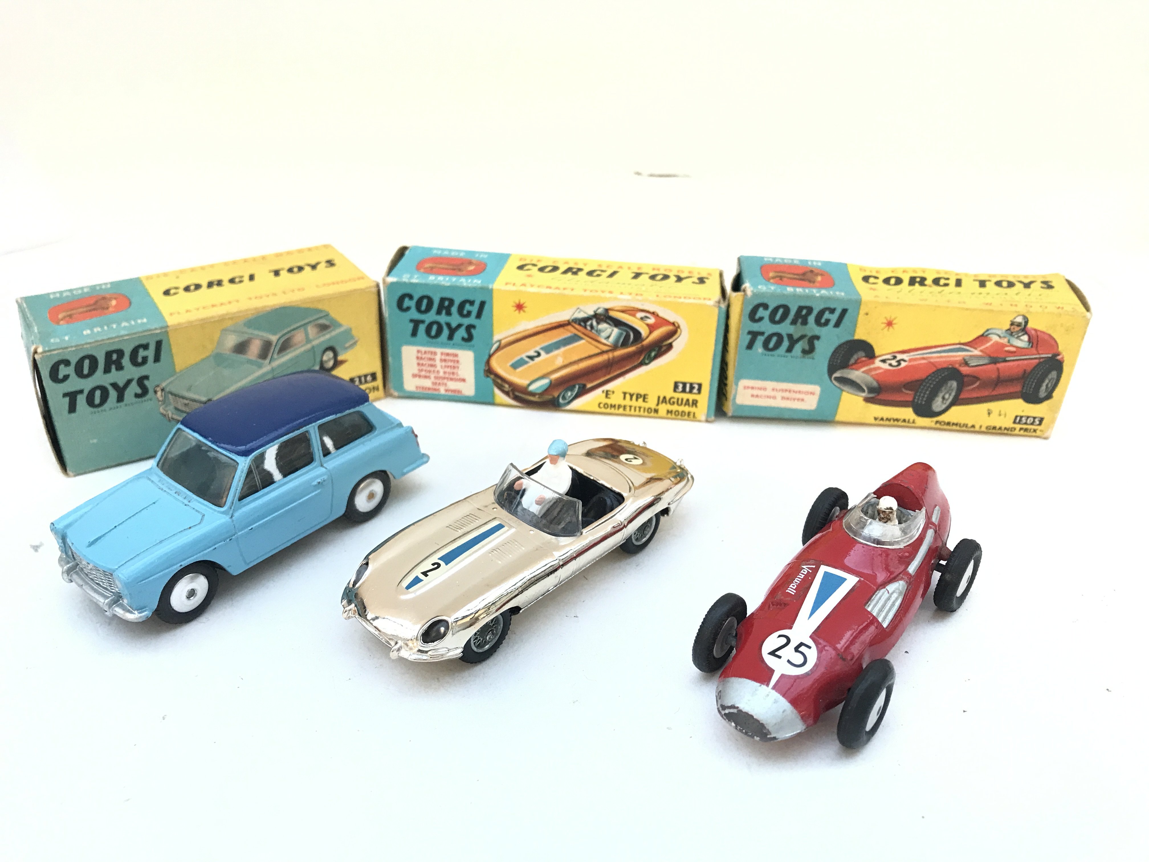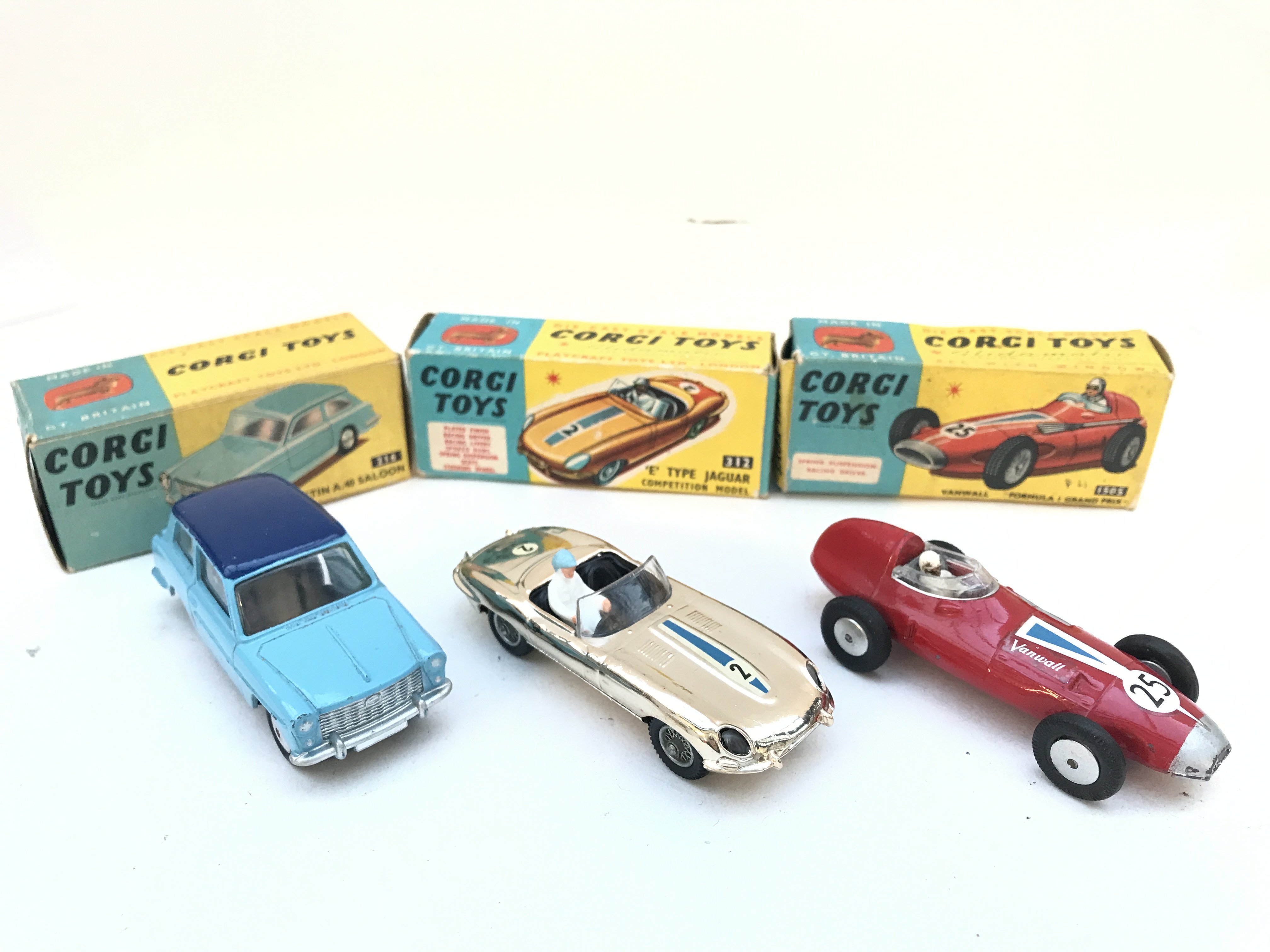 A Boxed Corgi Austin A.40 Saloon #216. A E Type Jaguar #312. And a Vanwall F1 Racing Car #150S.