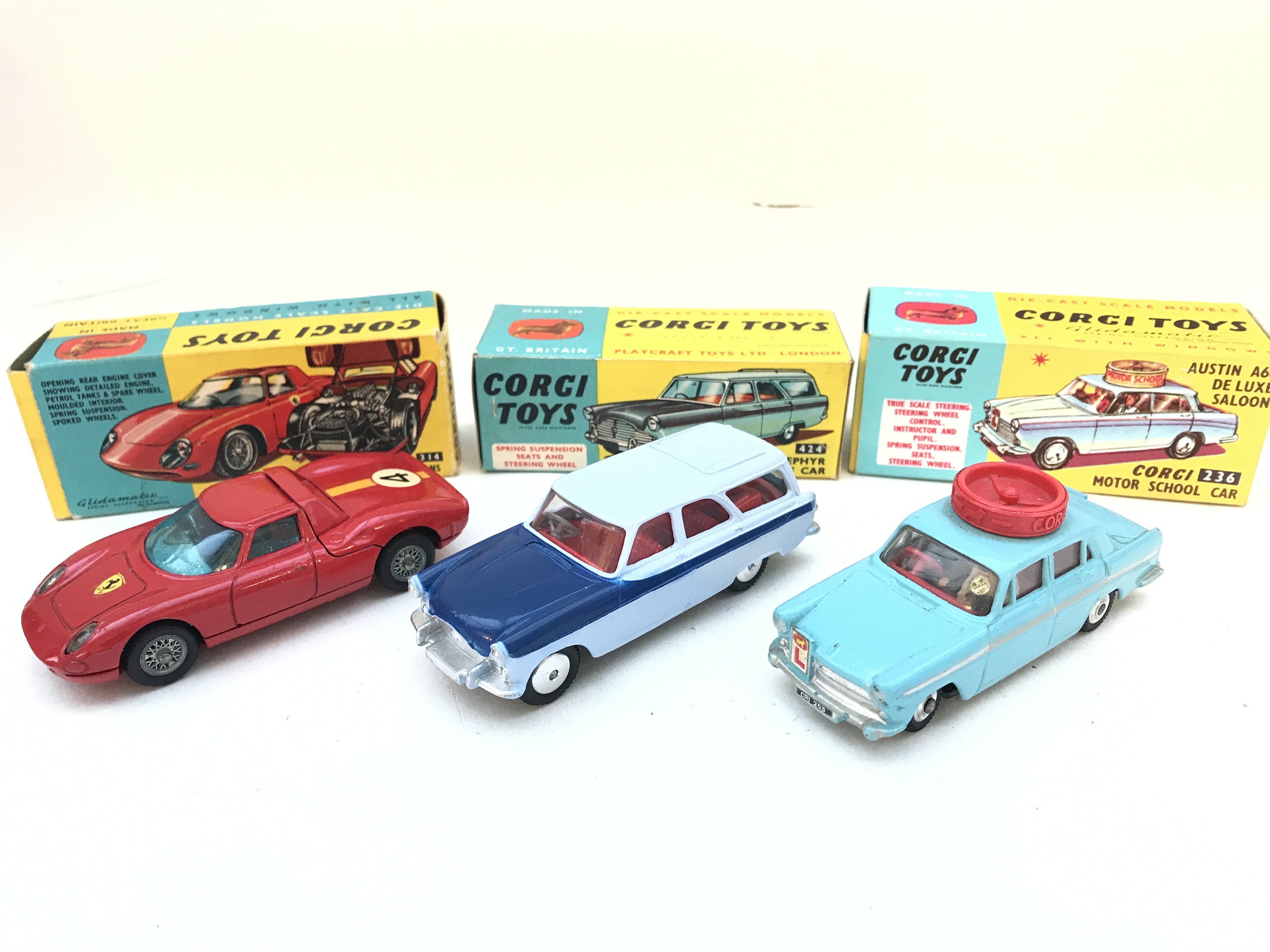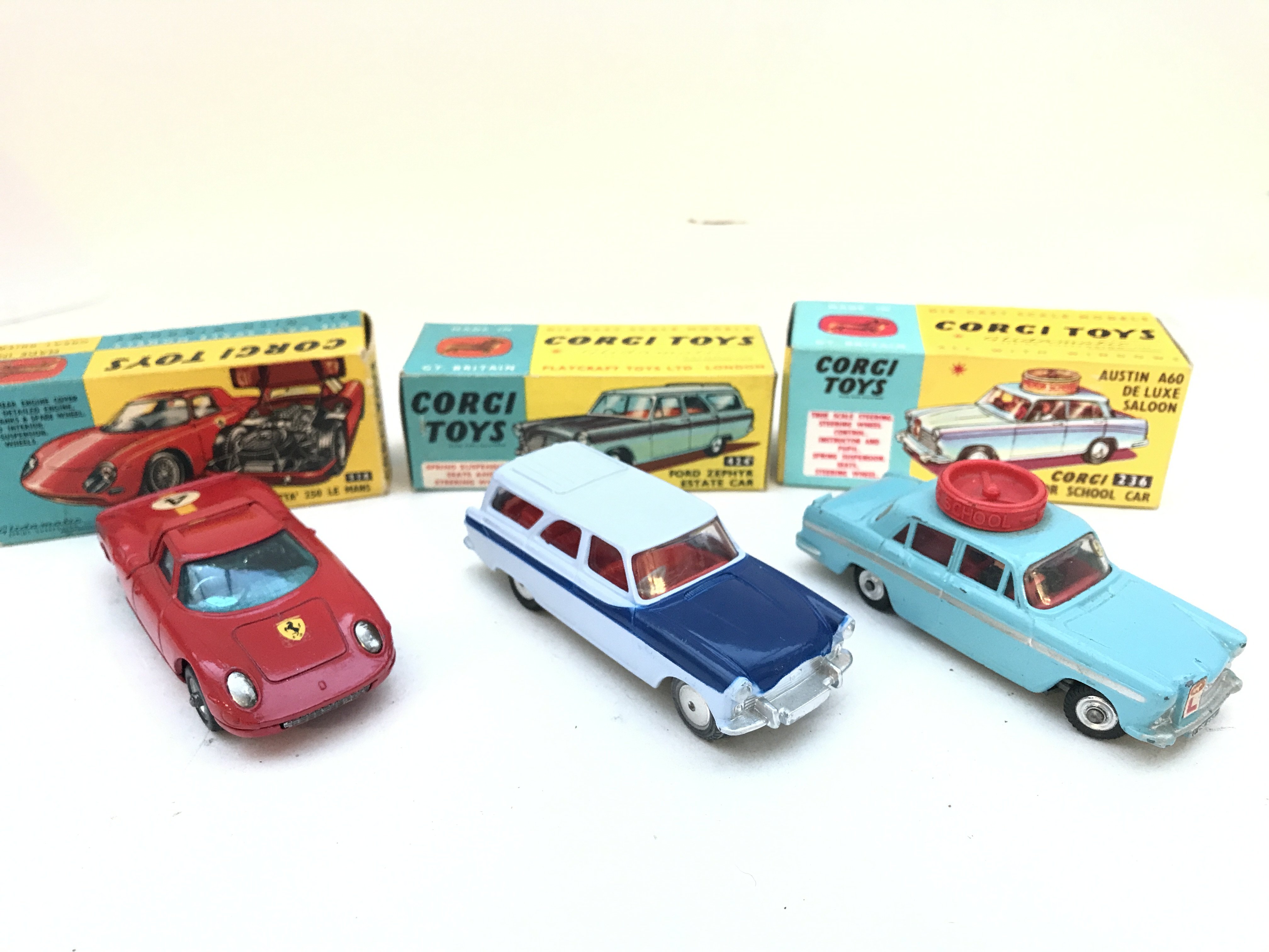 A Boxed Corgi Ferrari Berlinetta 250 Le Mans #324. A Ford Zephyr Estate Car #424 and an Austin A60 De Luxe Saloon #236 (Repro Box). No Reserve.