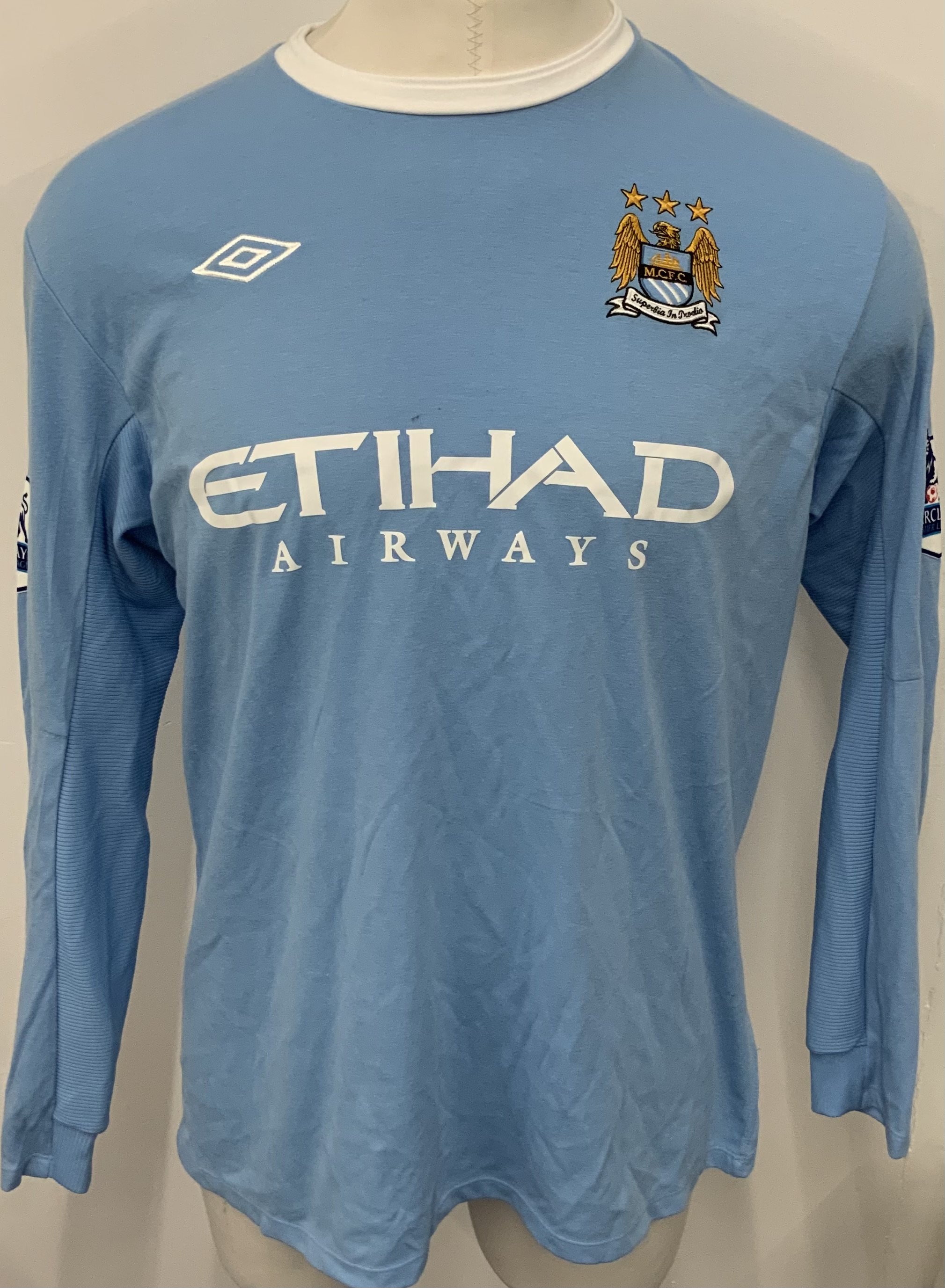 Manchester City 2009 - 2010 Lescott Match Worn Football Shirt: Blue long sleeve Umbro shirt from 1st season of Etihad Sponsorship. Premier League badging to sleeve and Lescott 19 to rear.