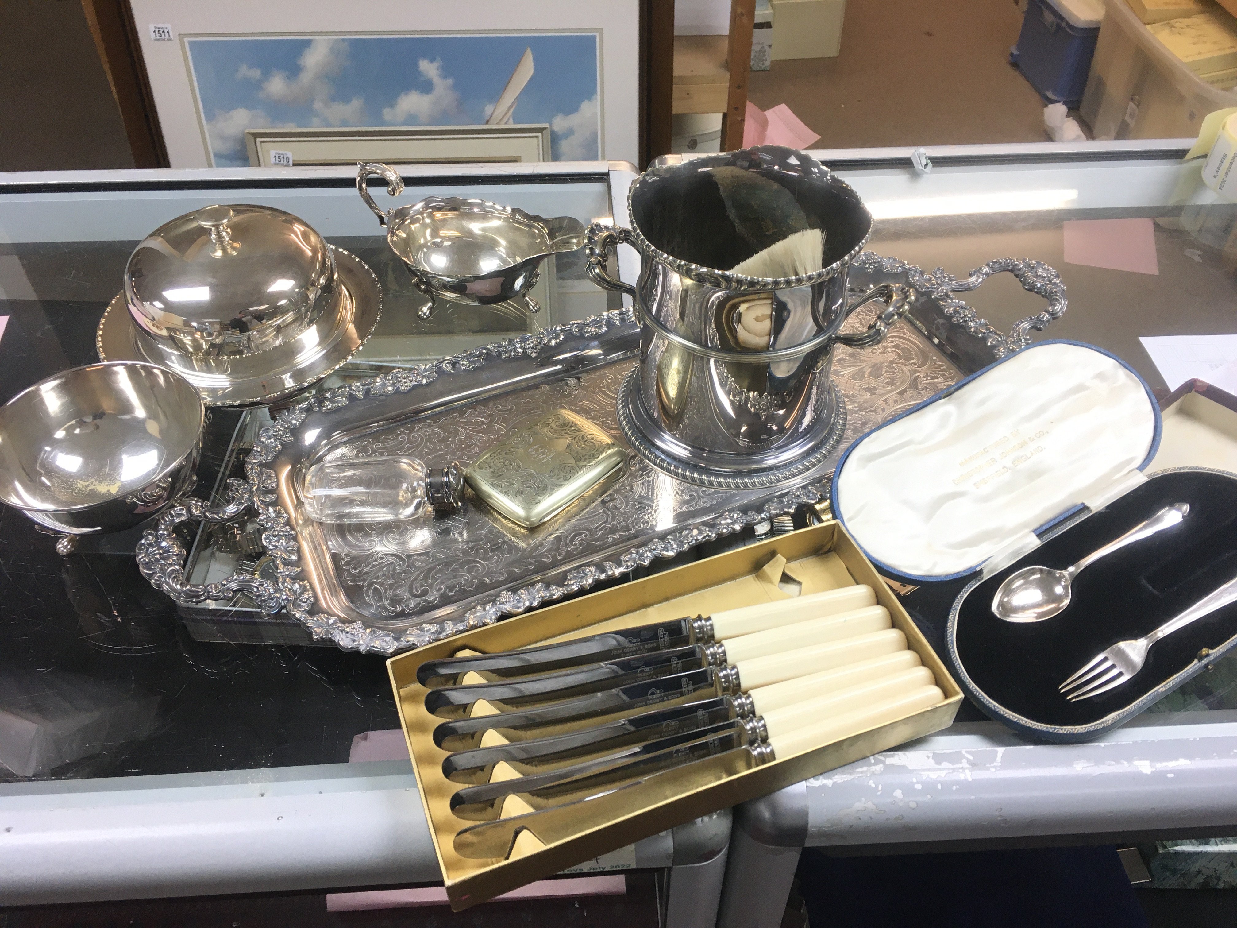 A Collection of silver plate including a tray, dishes, knives and a cased silver hallmarked spoon and fork. Postage category C