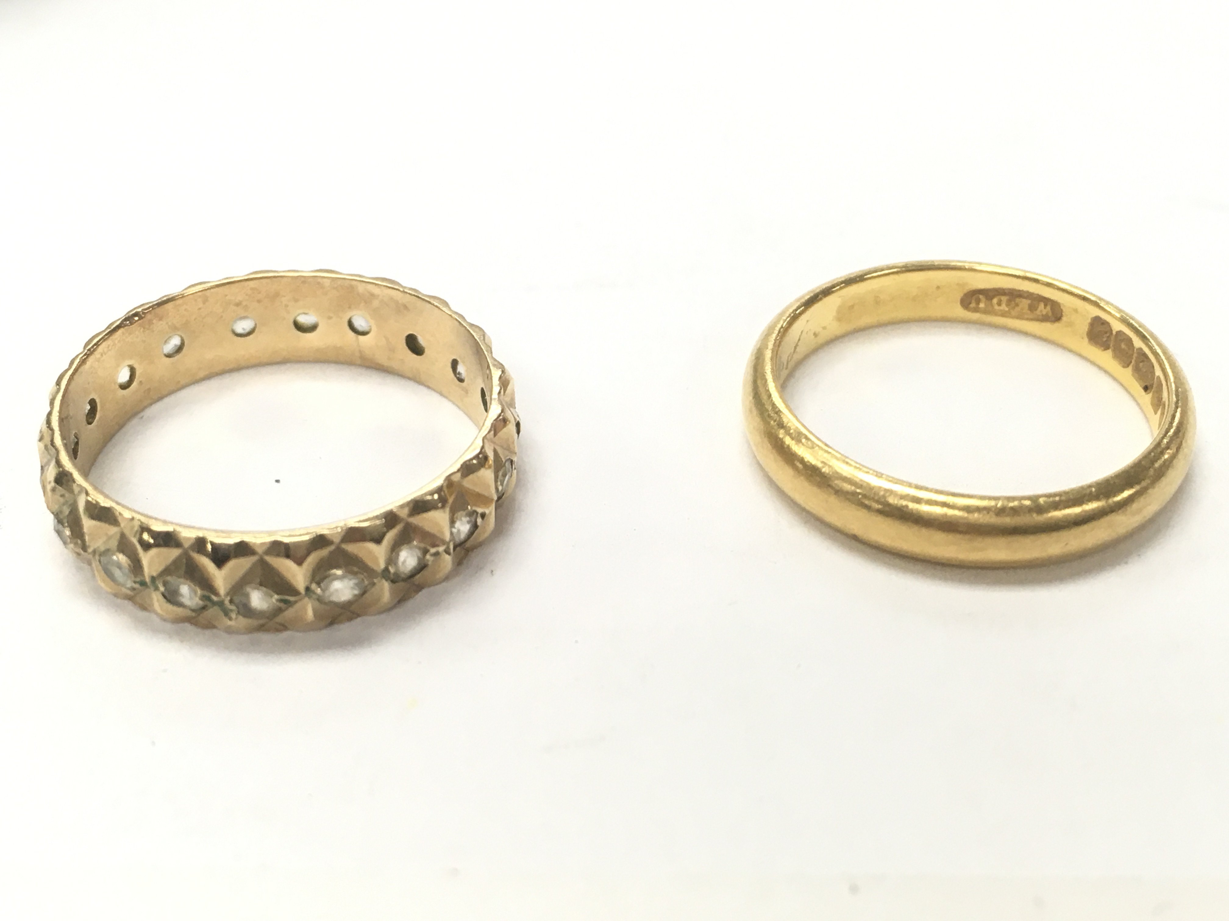 A 22ct gold band and a 9ct band (eternity). Total weight 5.6g. Size J and L. Postage category A