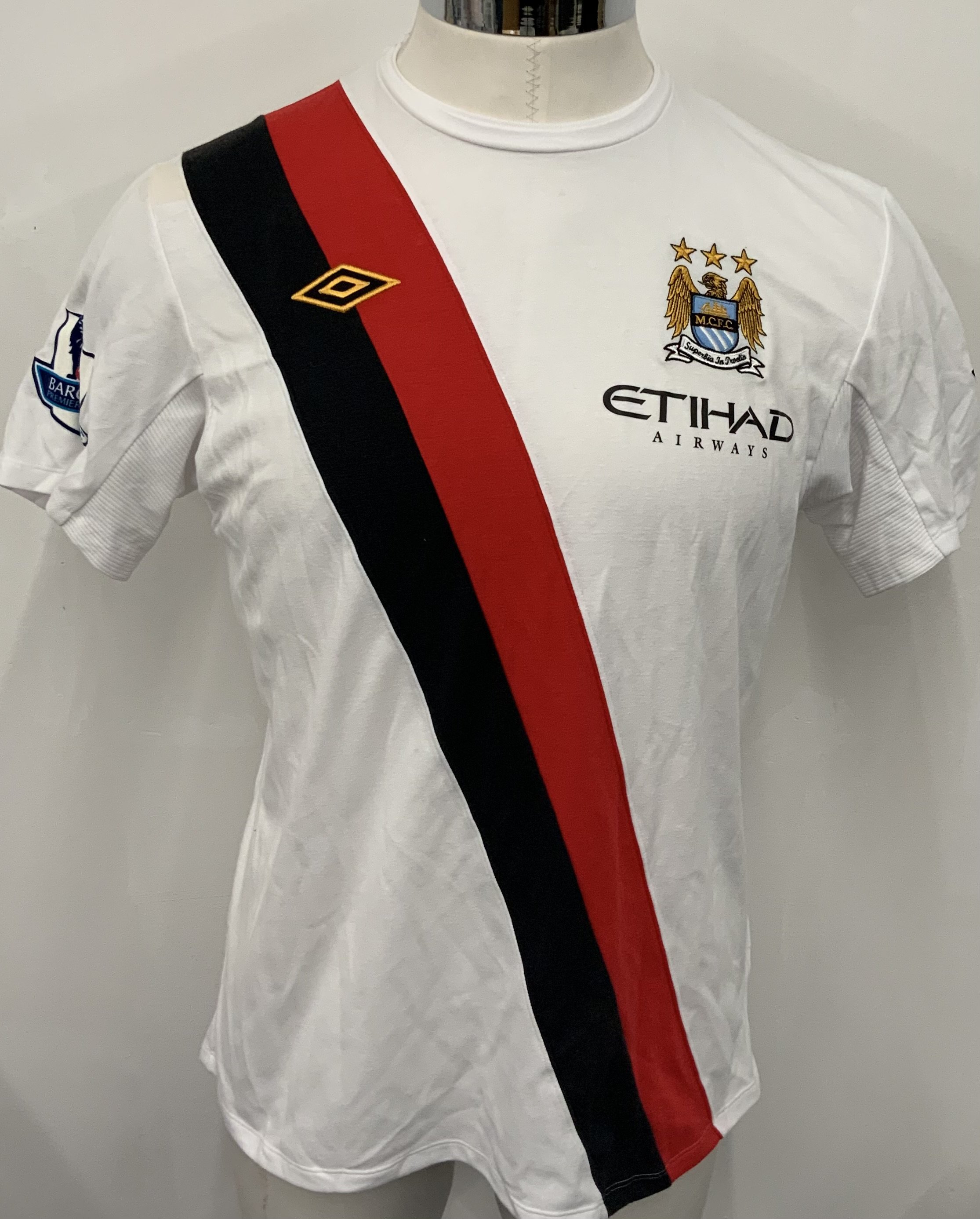 Manchester City 2009 - 2010 Kompany 3rd Kit Match Worn Football Shirt: White with red and black slash short sleeve Umbro shirt from 1st season of Etihad Sponsorship. Premier League badging to sleeve and Kompany 33 to rear.