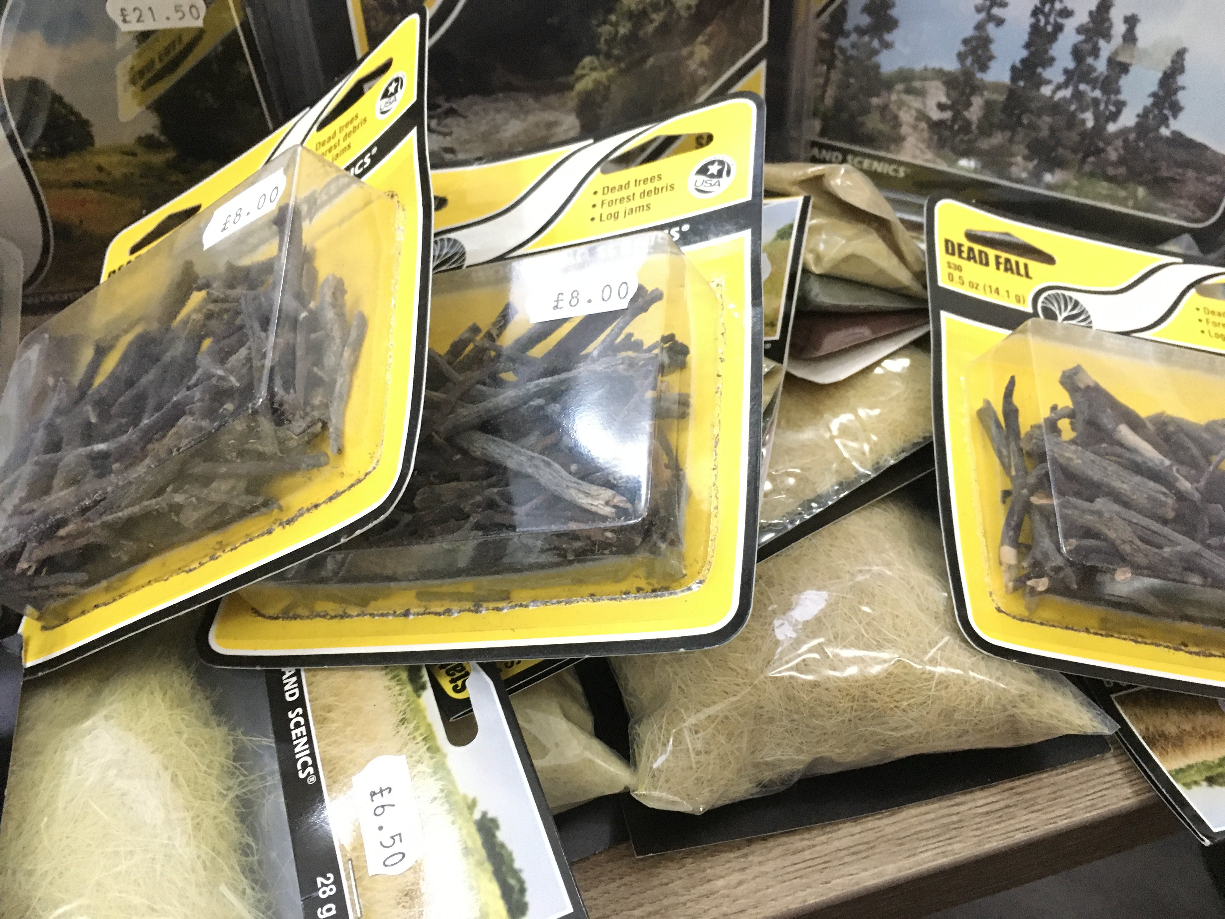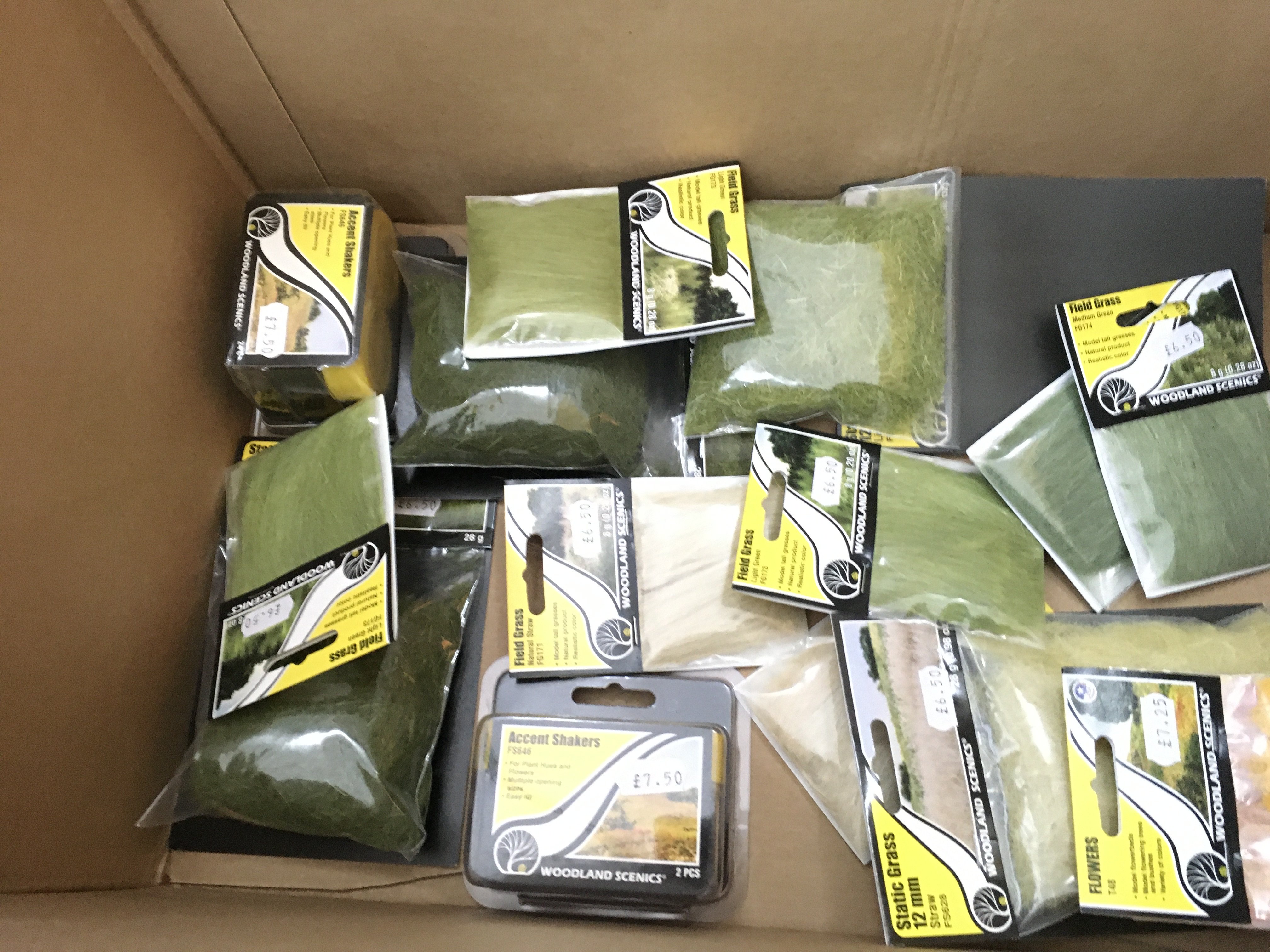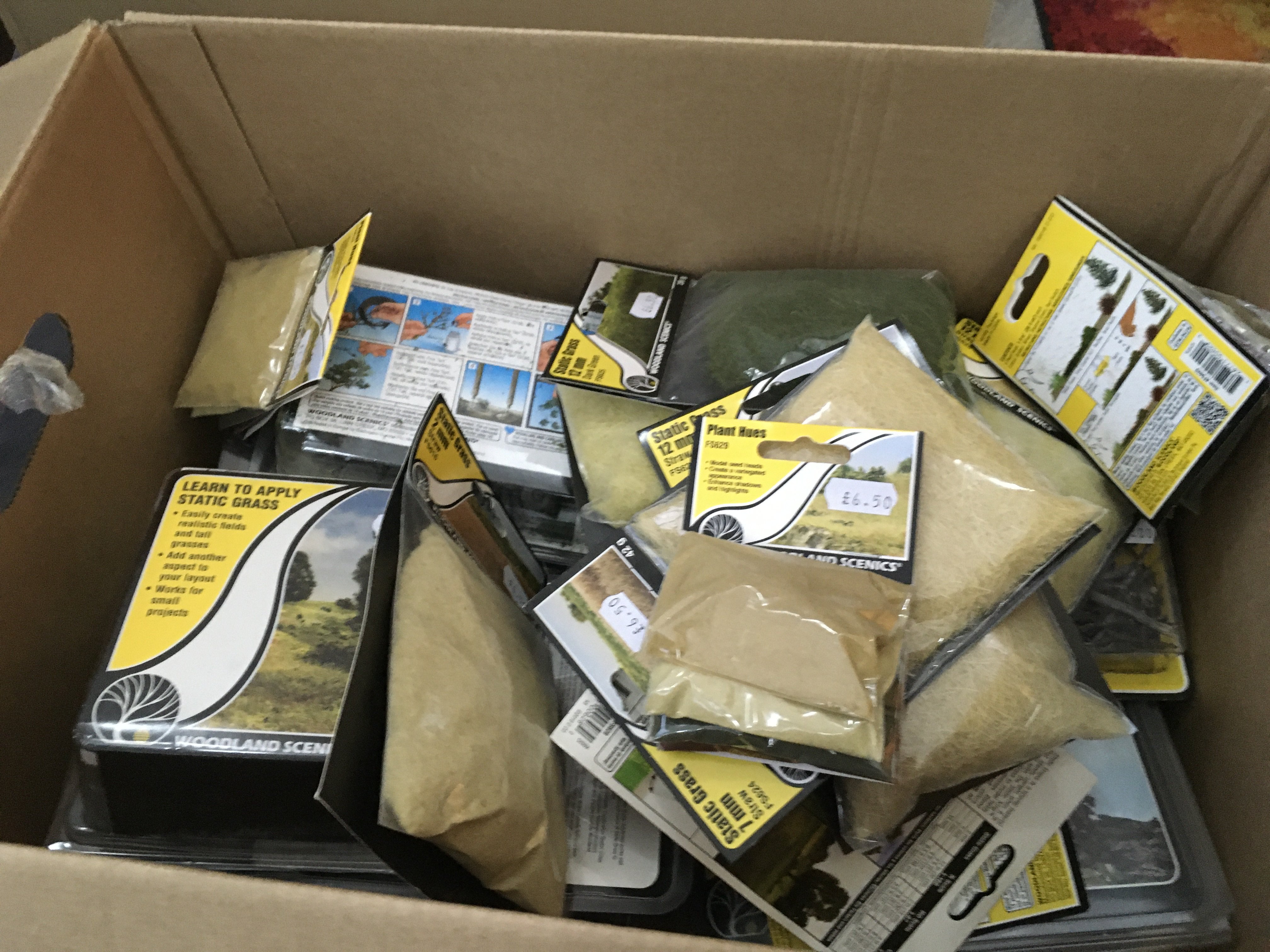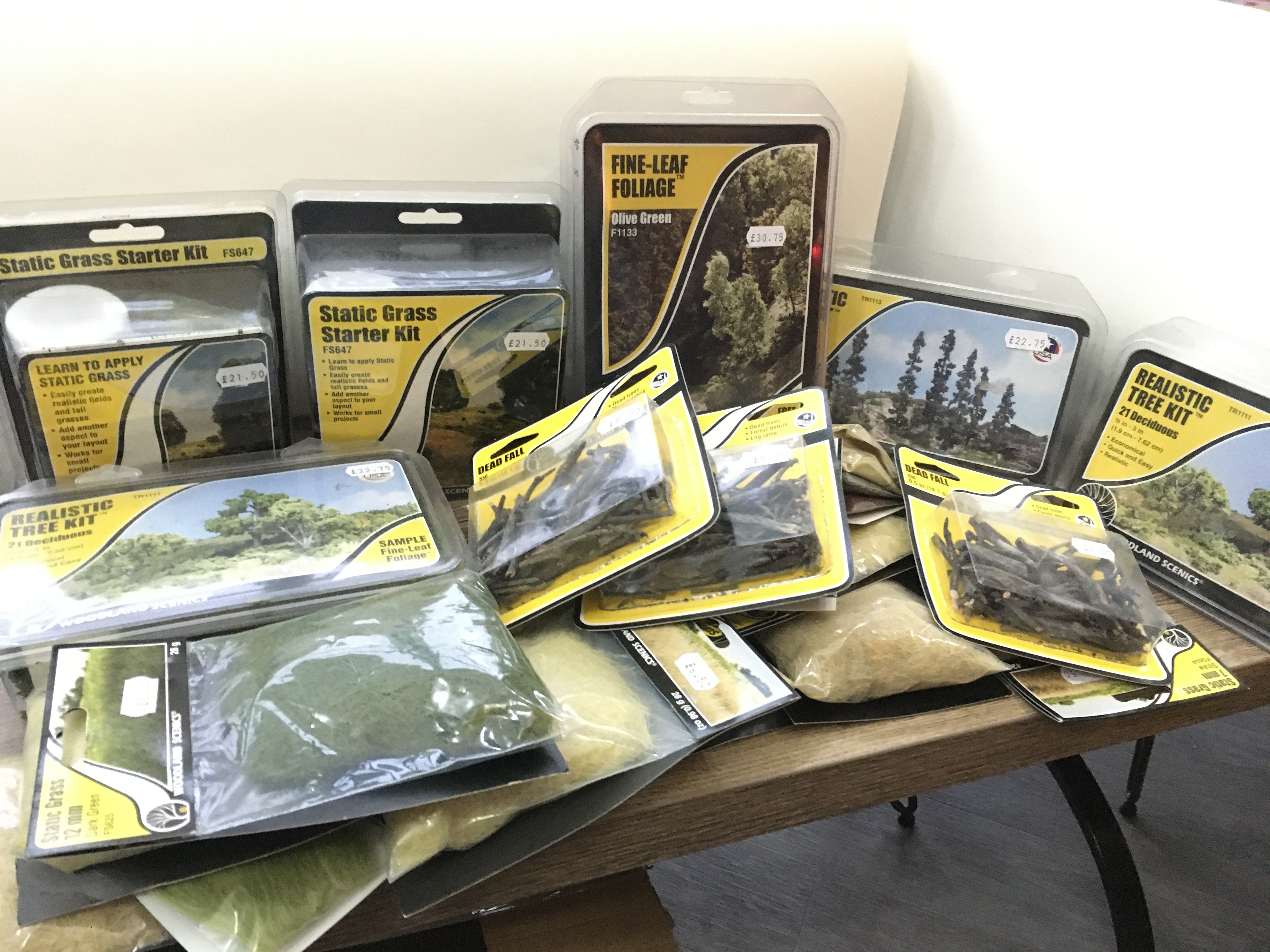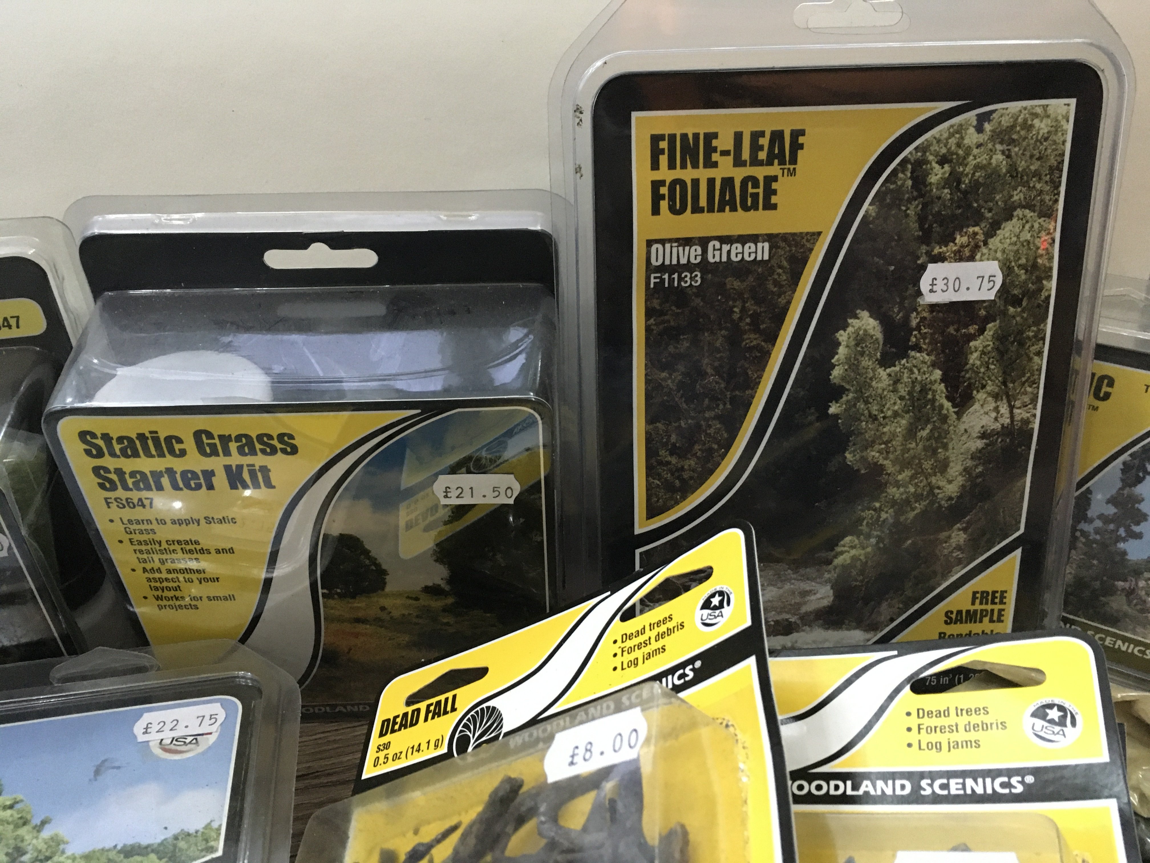 A collection of new sealed packages by Woodland Scenics for creating scenes for model layouts. No reserve