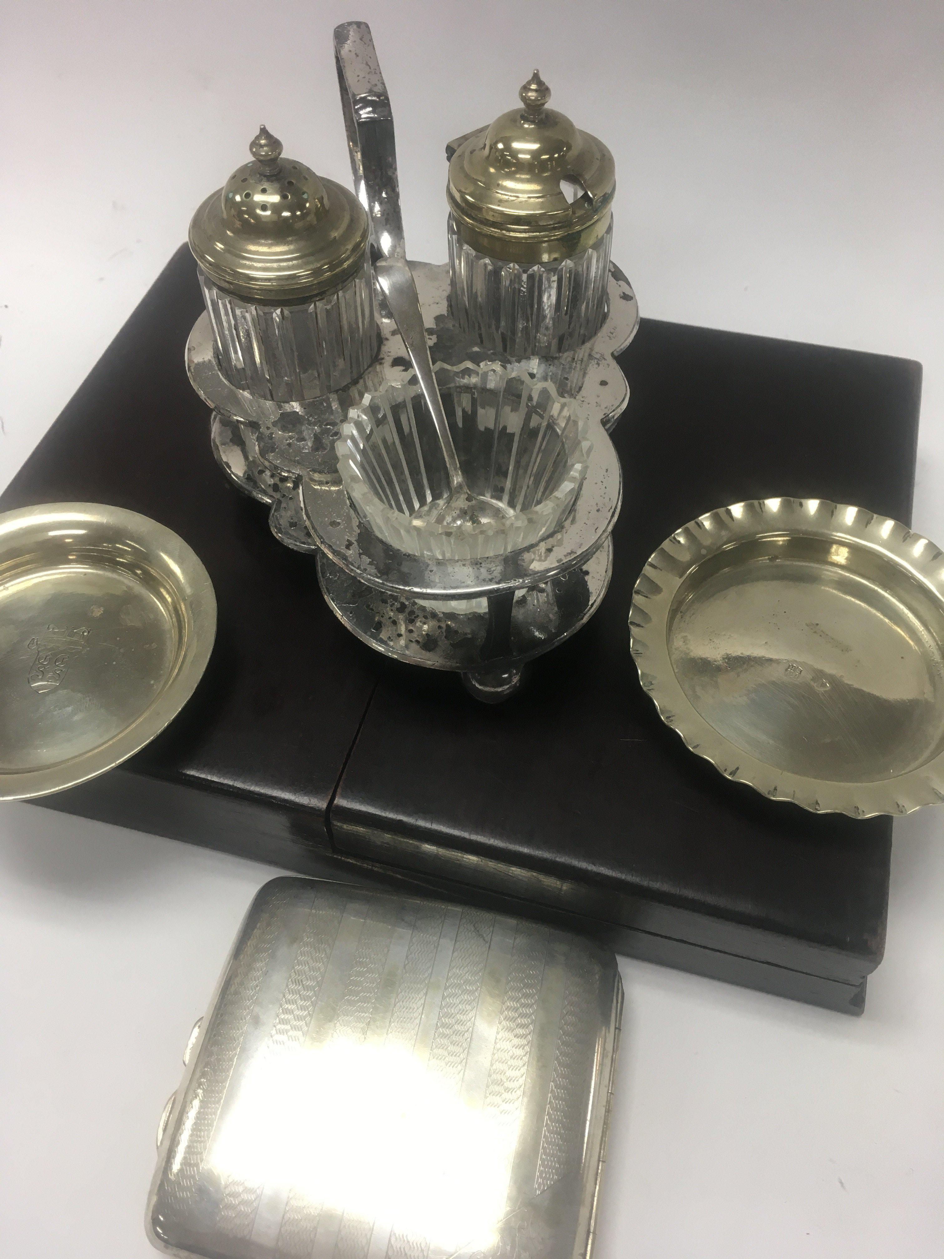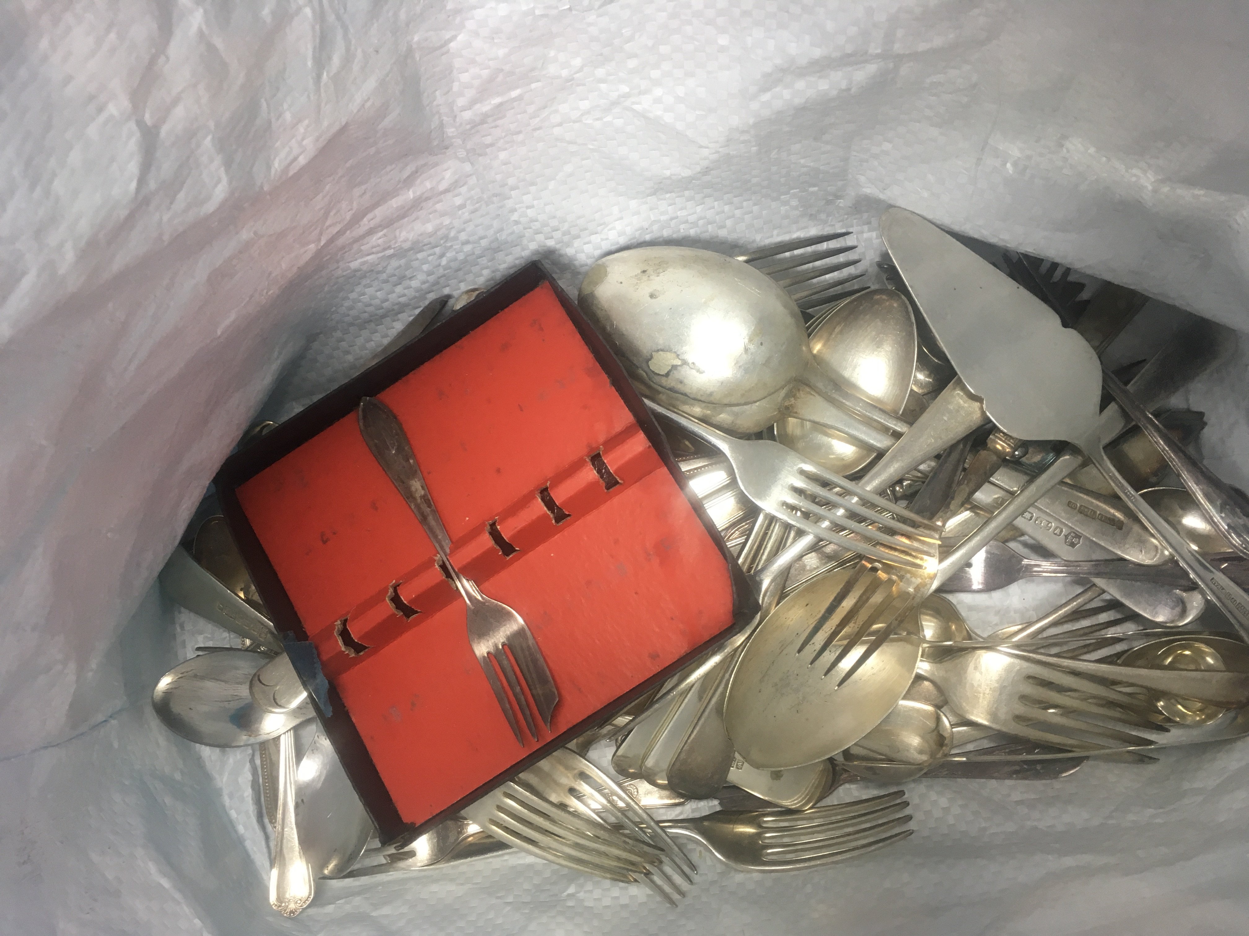 A bag containing silver plated ware various including cutlery a pair of small dishes and a cigarette case