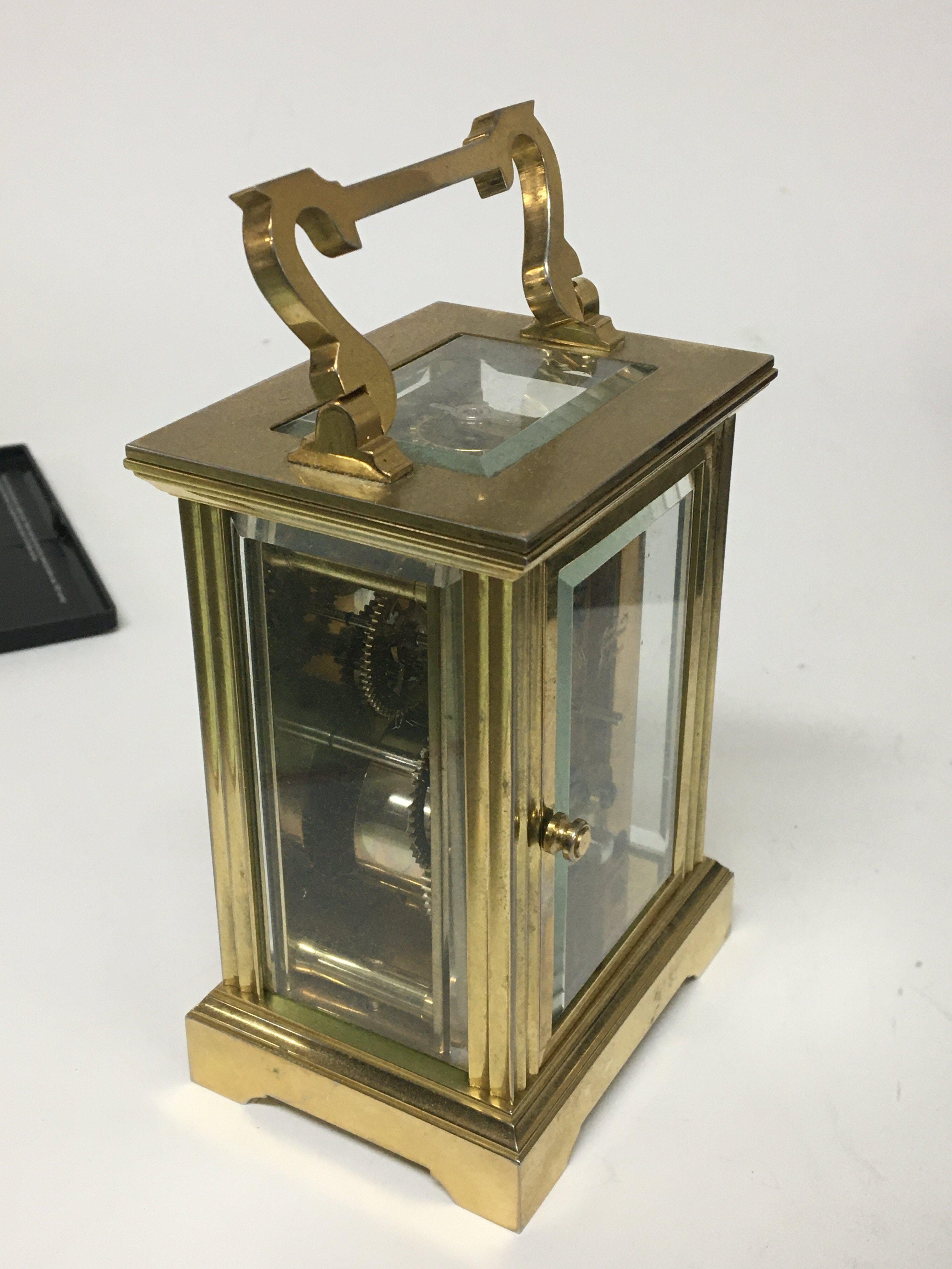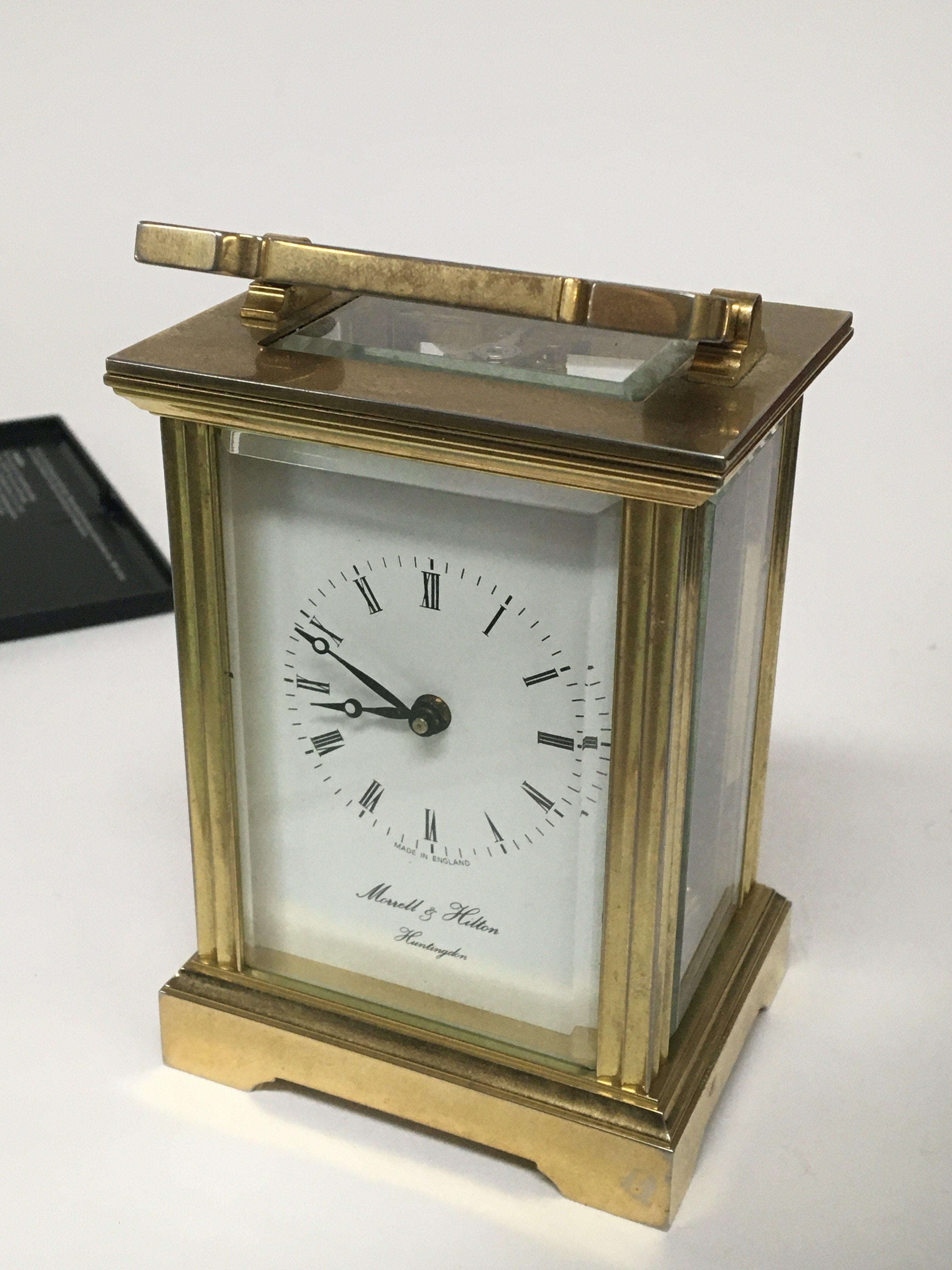 A brass cased carriage clock the rectangular dial maker Mowell & Hilton Huntingdon.