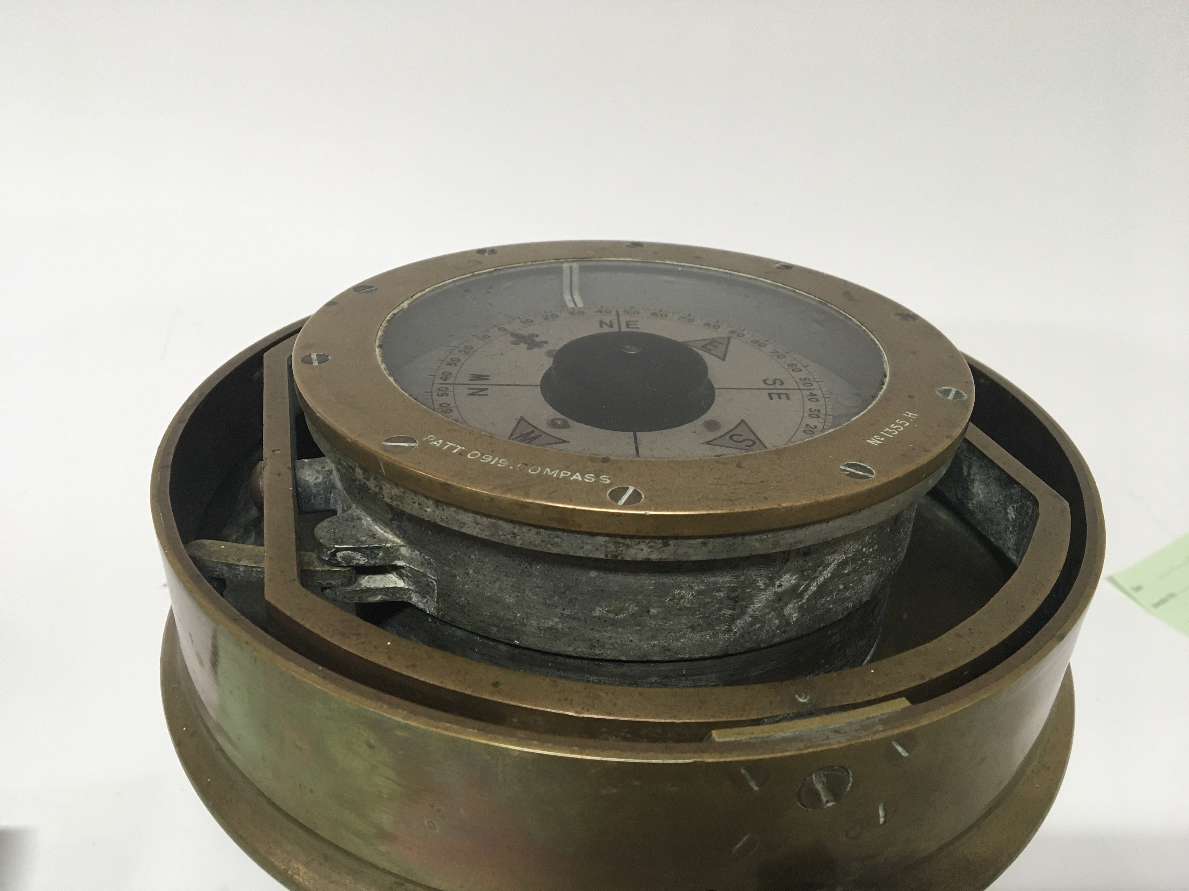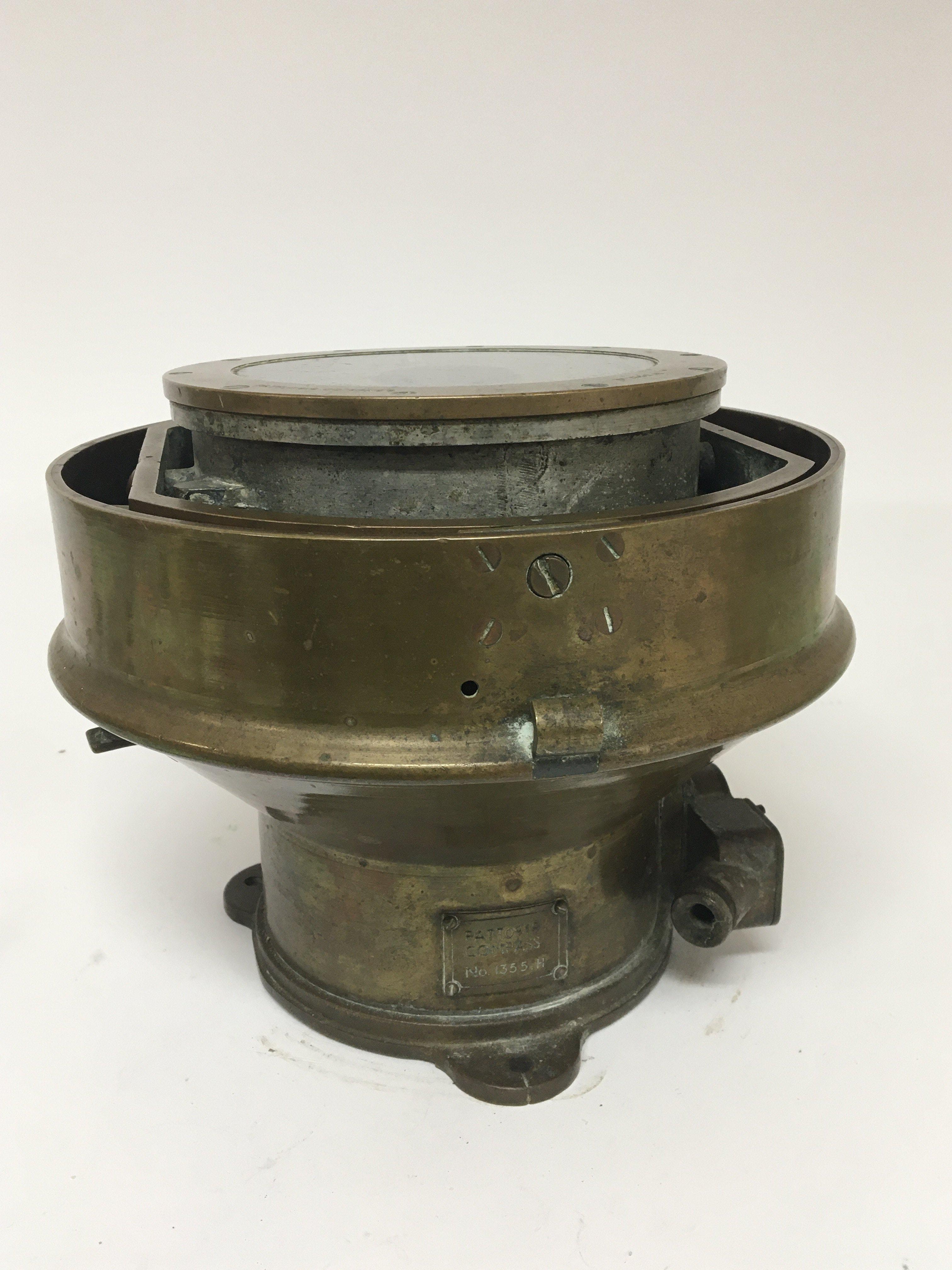 A Military gun metal or brass cased ships compass patt 0919 and numbered 1355 H. Diameter 24cm approximately.
