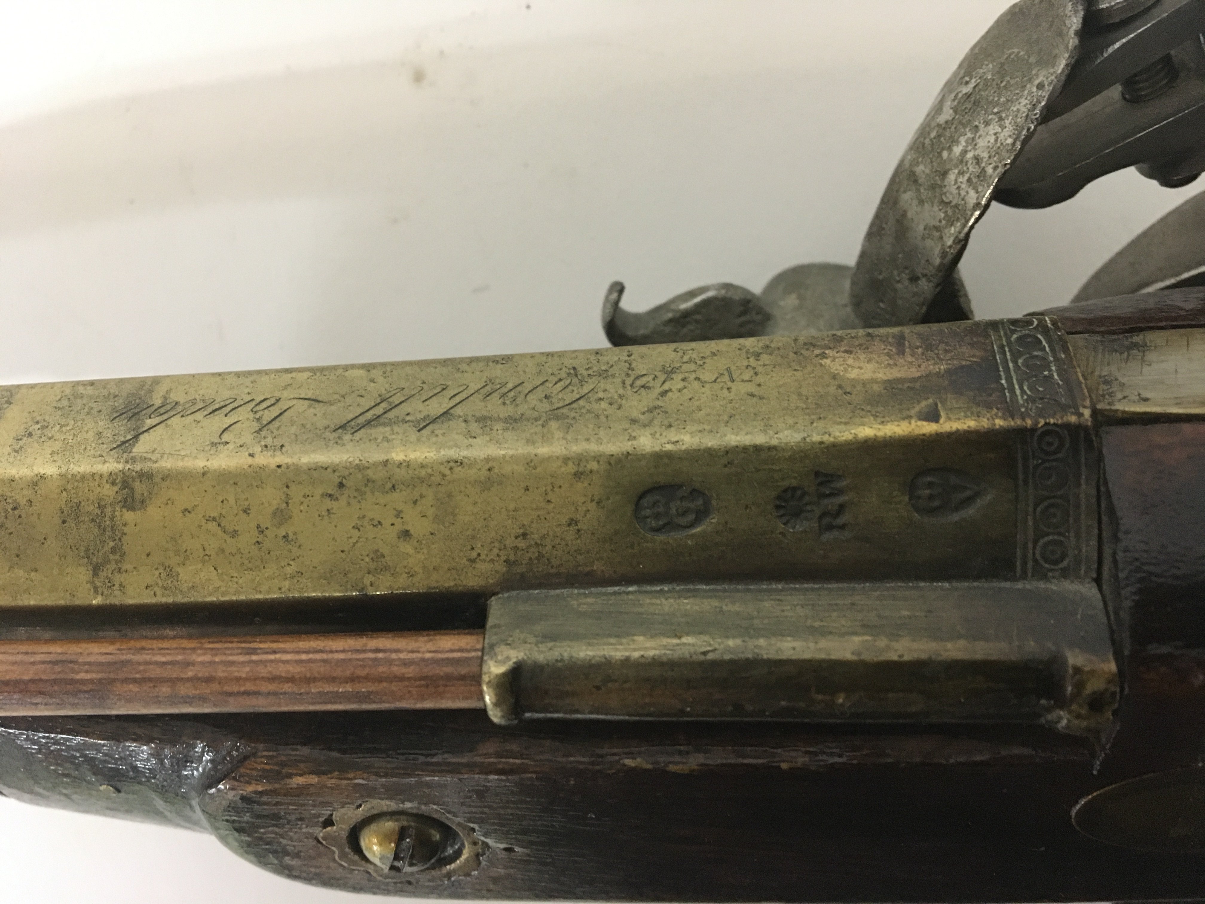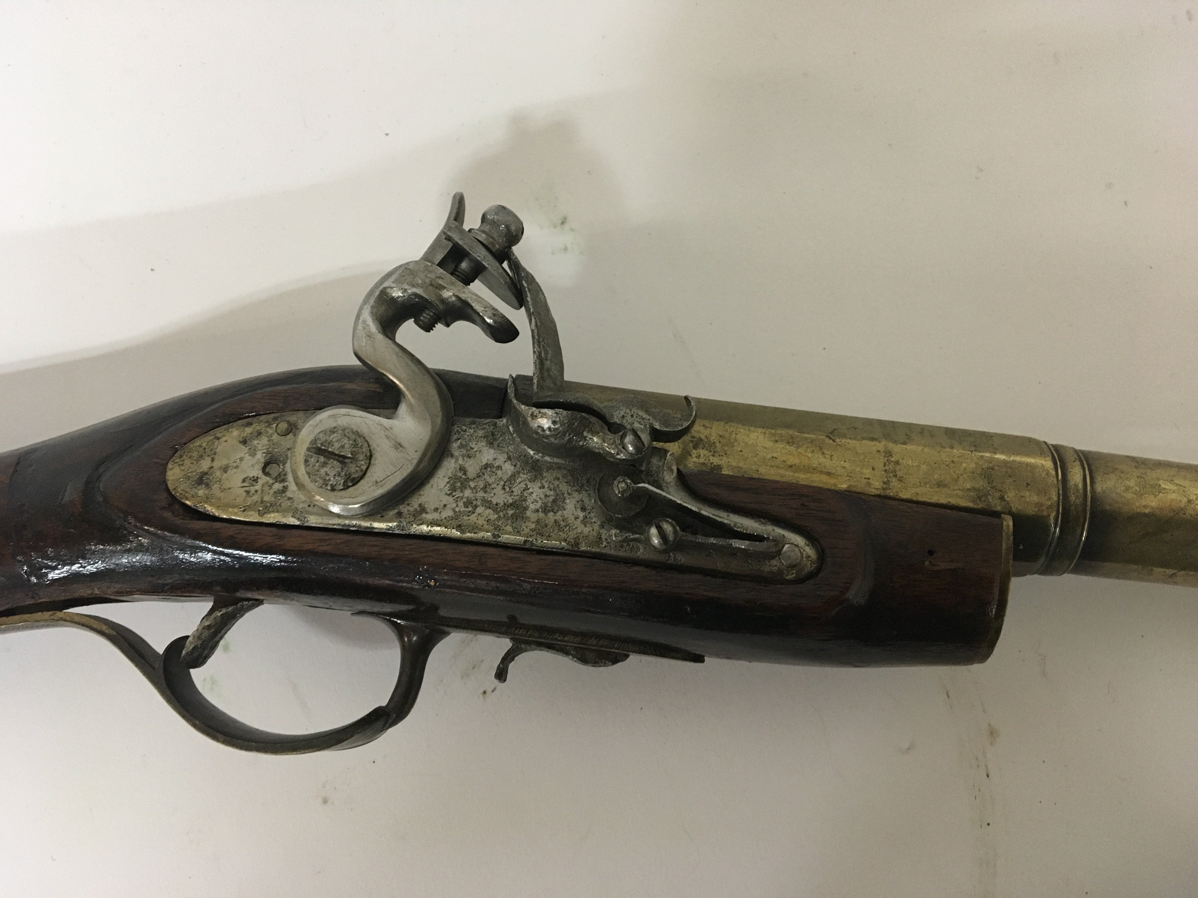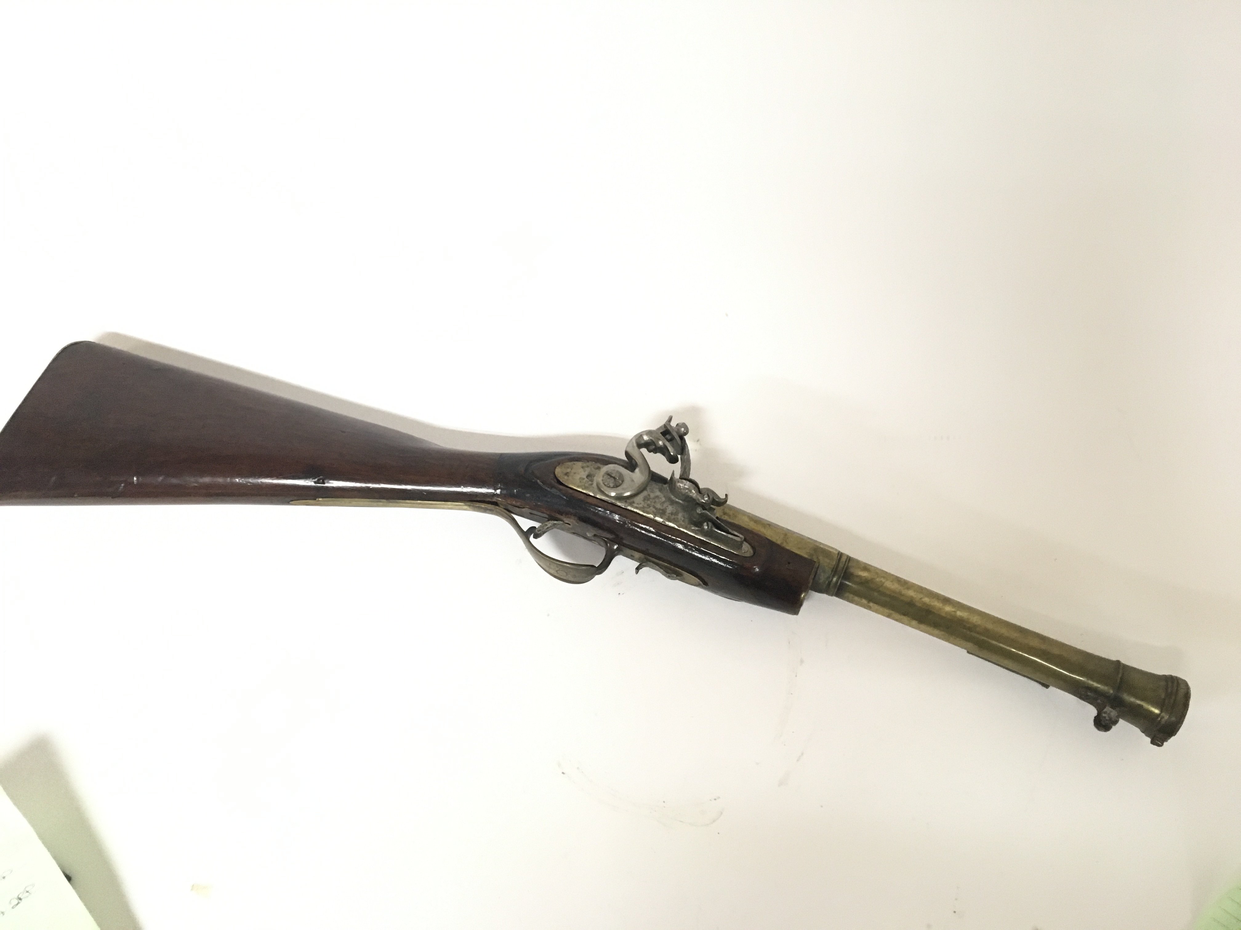 An 18th century flintlock Blunderbuss with a brass barrel with proof marks and inscribed Cornhill London. brass trigger guard. Some later alterations. length 69cm