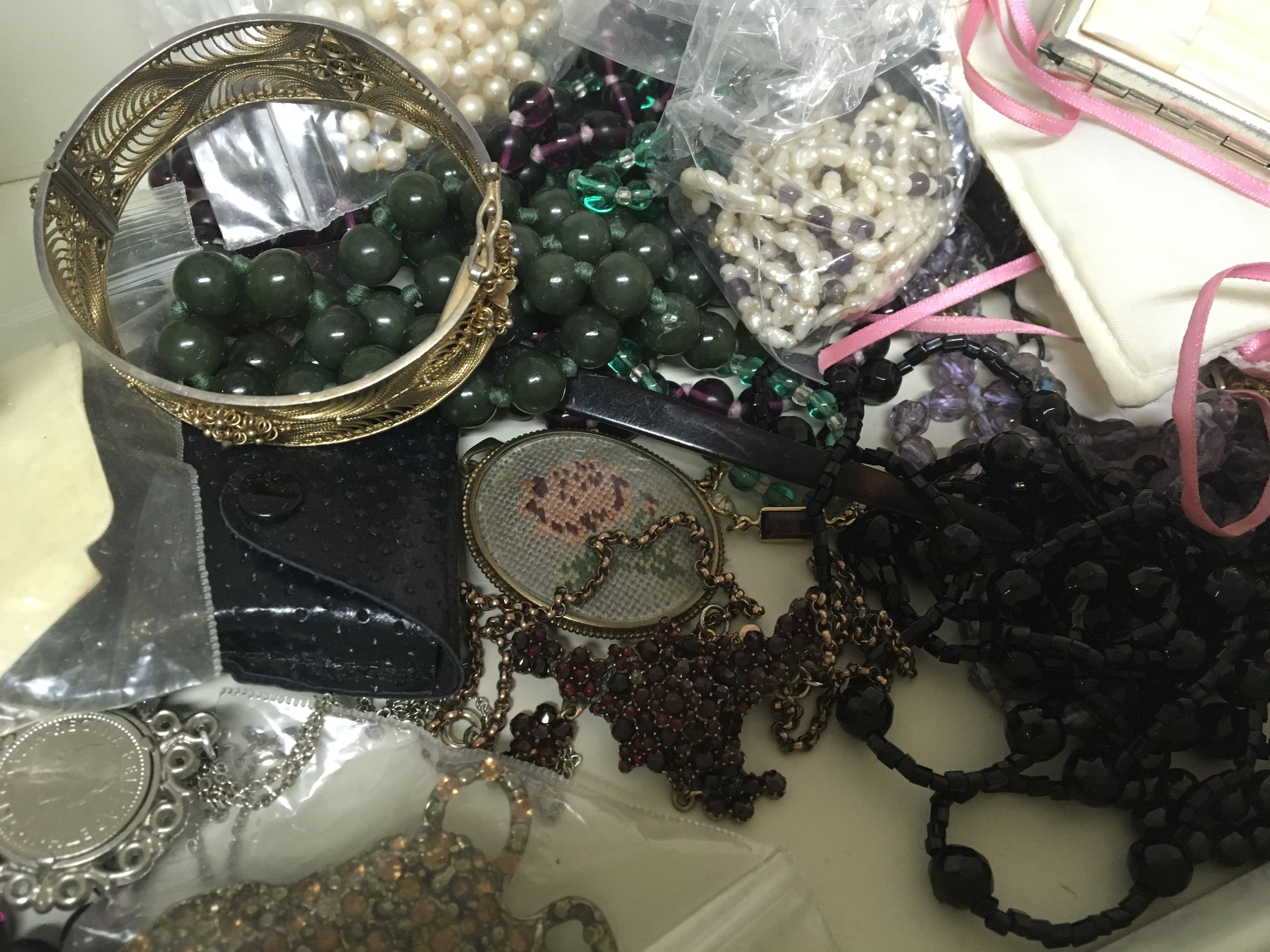 A box containing costume jewellery including a green jade necklace an antique garnet necklace pearl necklaces and other ornaments.
