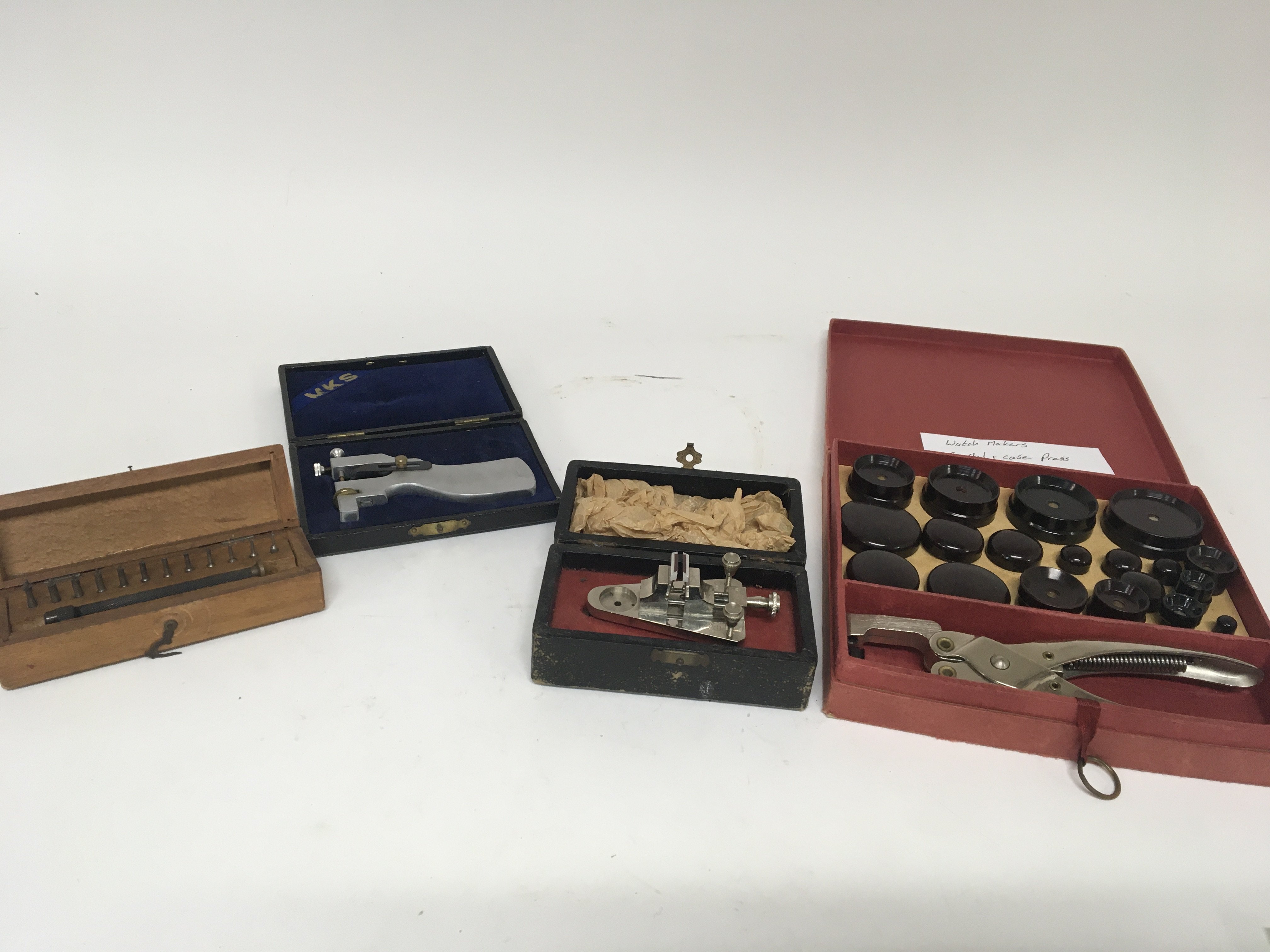 A collection of watch makers precision tools a cased Crystal and case press and other cased tools.