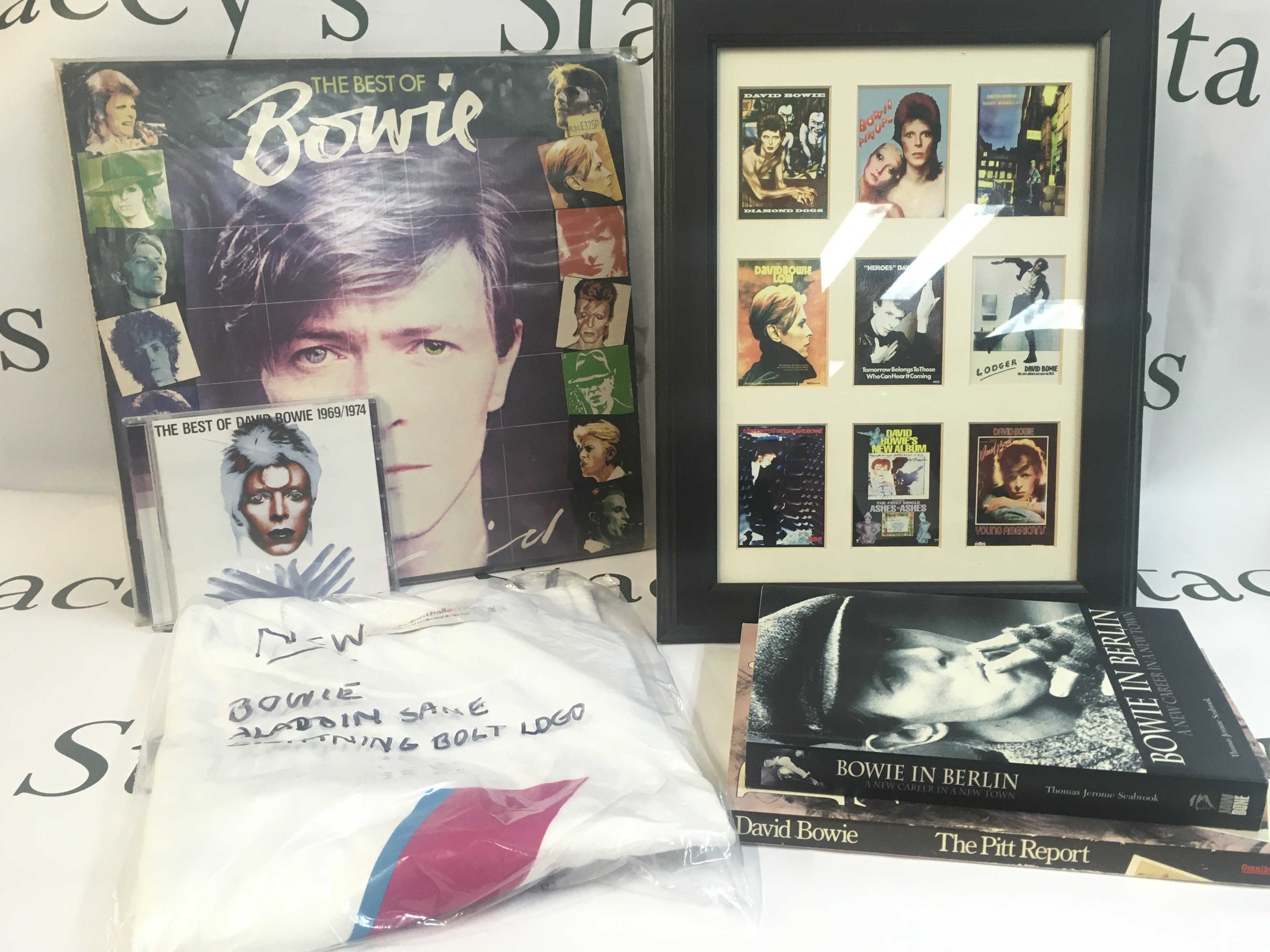 A Collection of David Bowie ephemera including book Bowie in Berlin, The Pitt Report, T-shirt, Best of Bowie record etc. this lot can be posted without the picture frame.