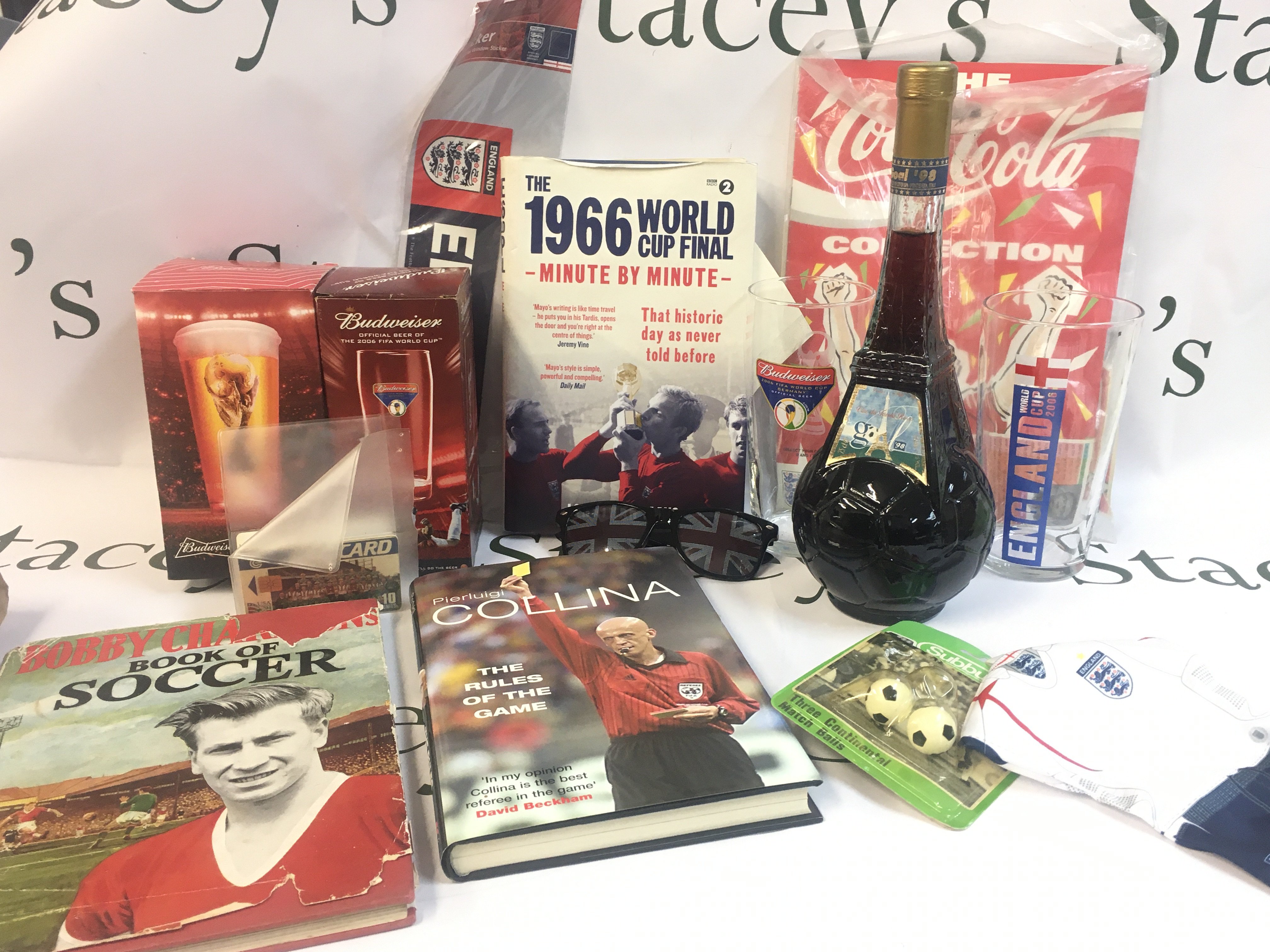 A Collection of various World Cup items including Bobby Charlton book of soccer, boxed beer glasses, Goal 98 bottled by Cevin Spa Pontedera Italy. This lot cannot be posted