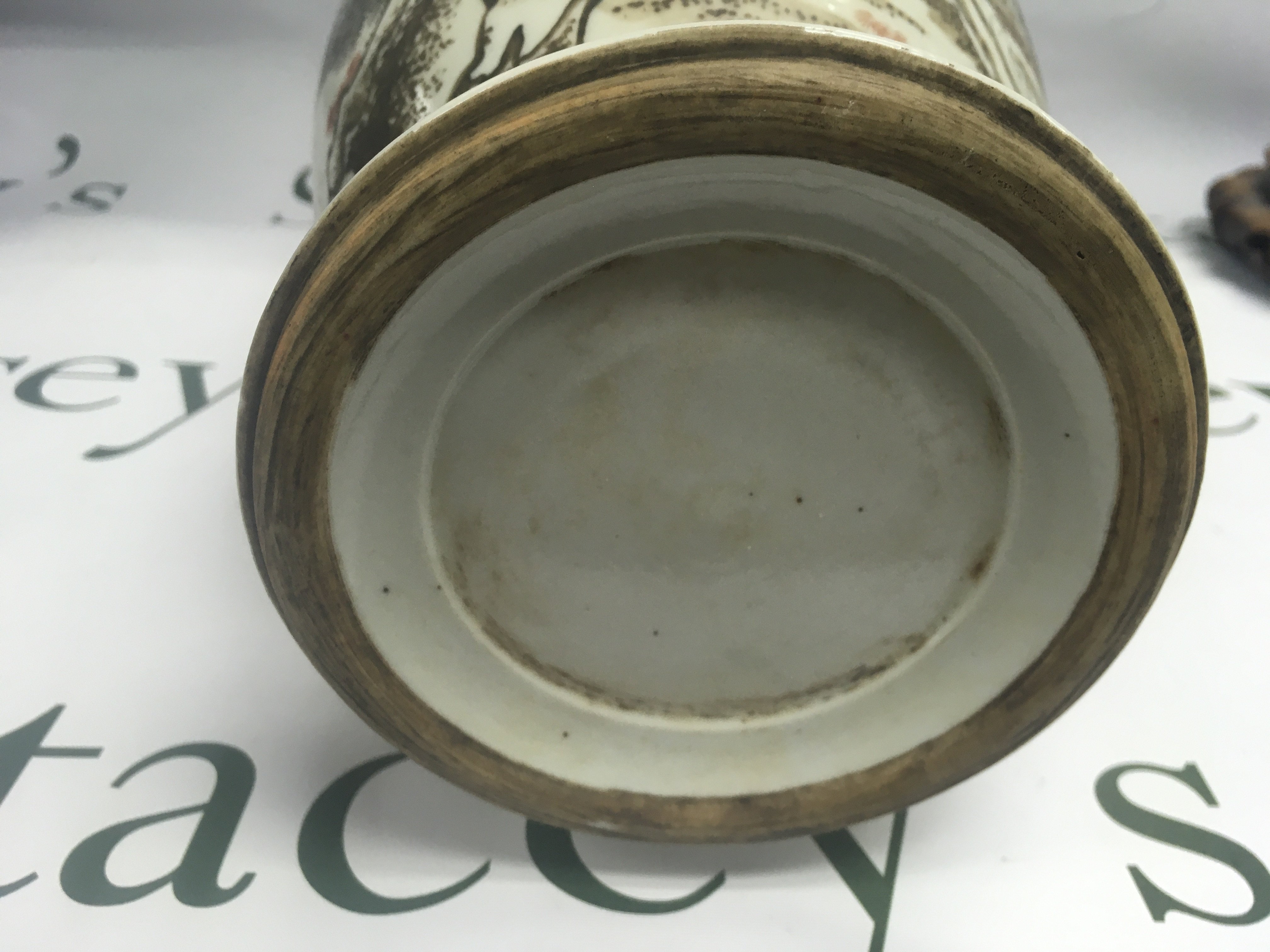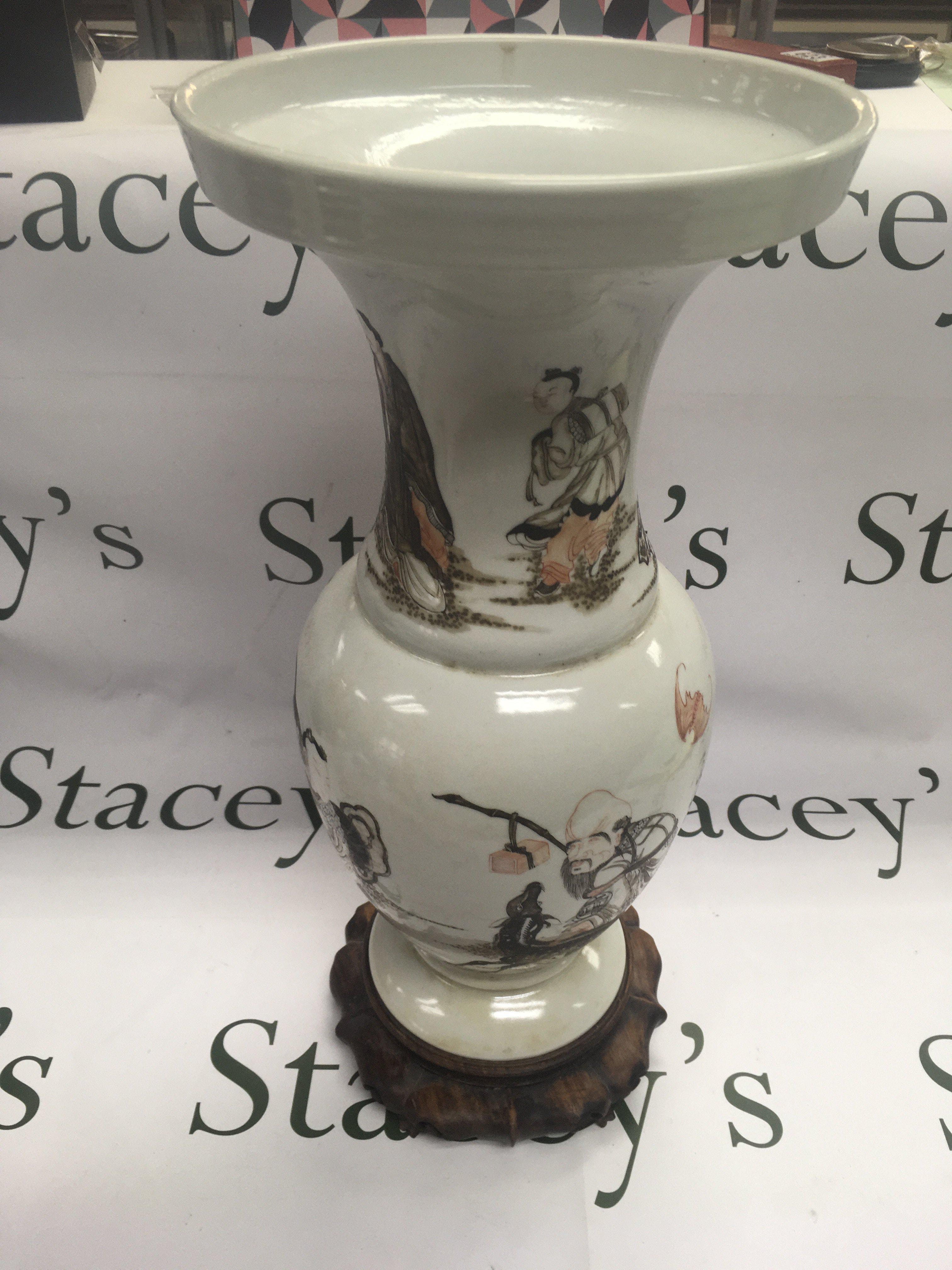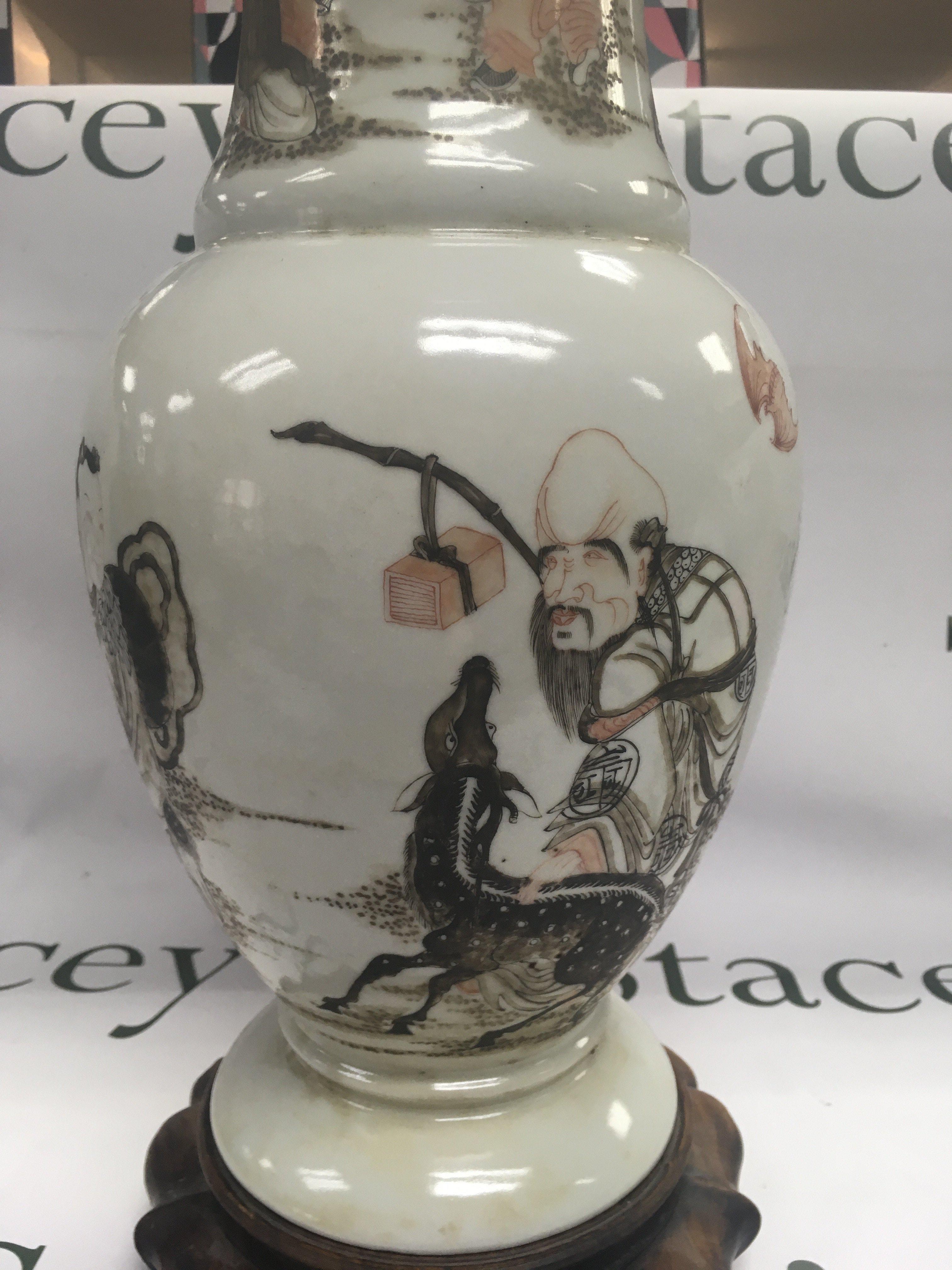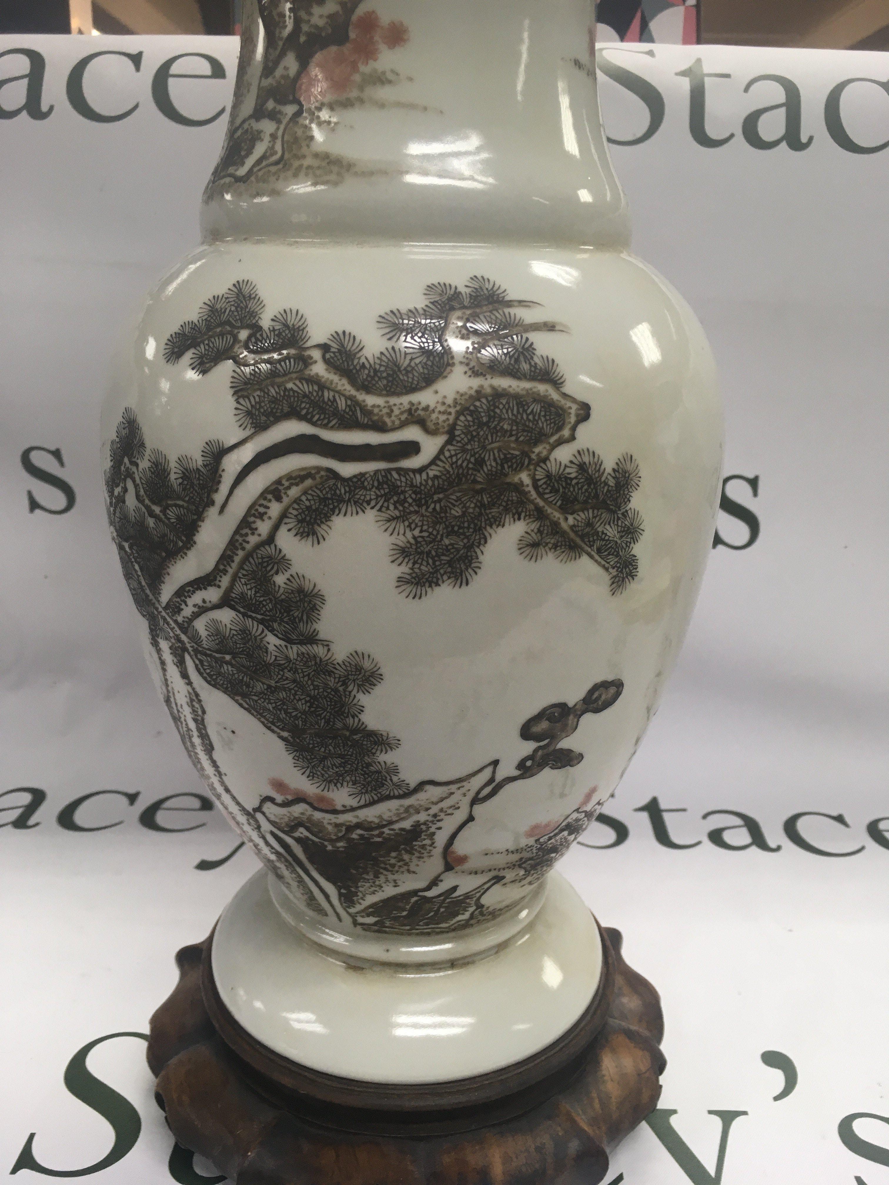 An Oriental vase of baluster form and decorated with figures in a landscape setting and raised on a carved hardwood base, approx total height 45cm. Shipping category D.