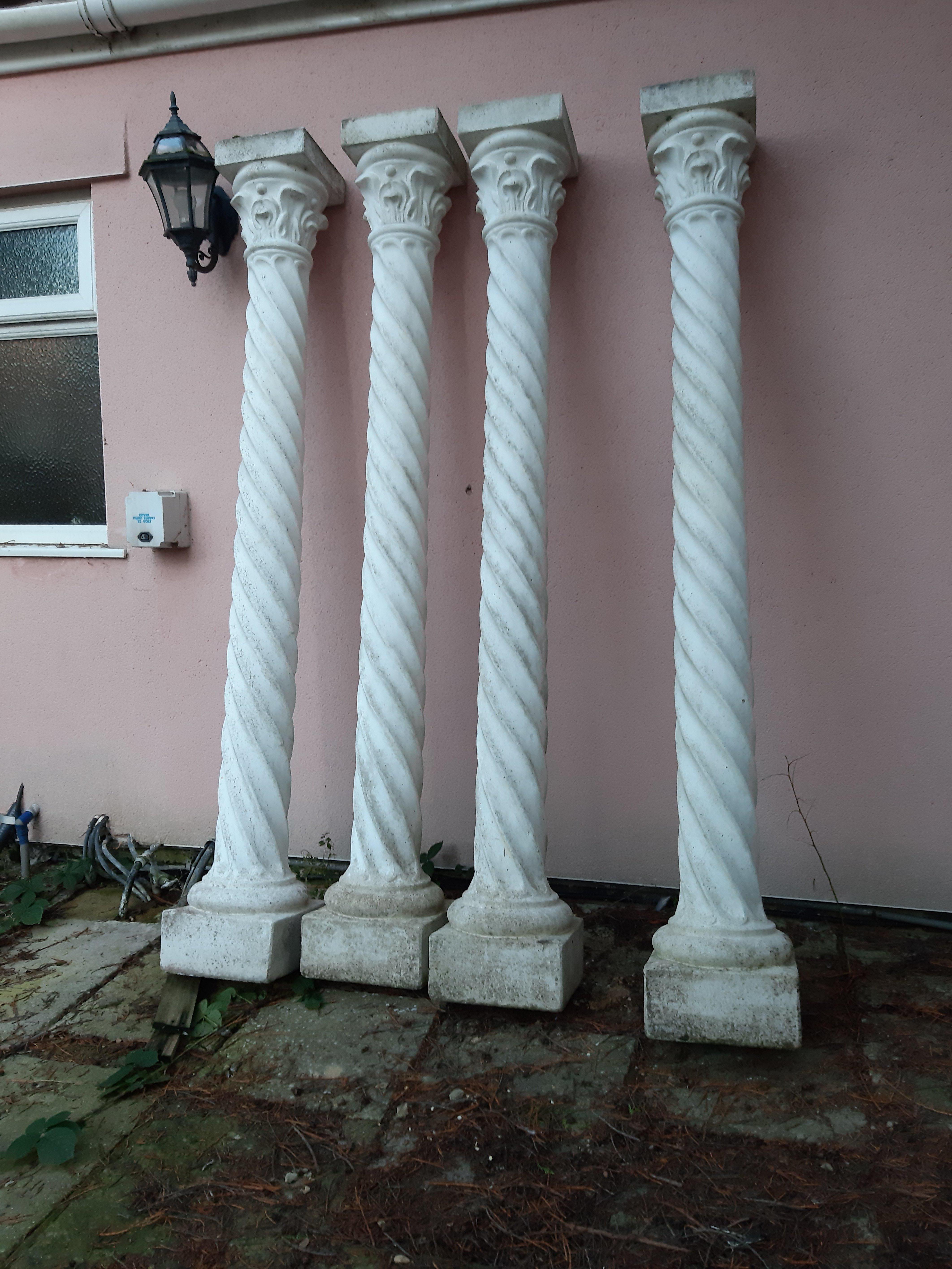 A set of six composition garden pillars free standing stylised Corinthian columns with acanthus leave capitals and spiral columns. Good condition not fixed to the ground so easy to collect sold in situ buyer to collect height 213cm high.