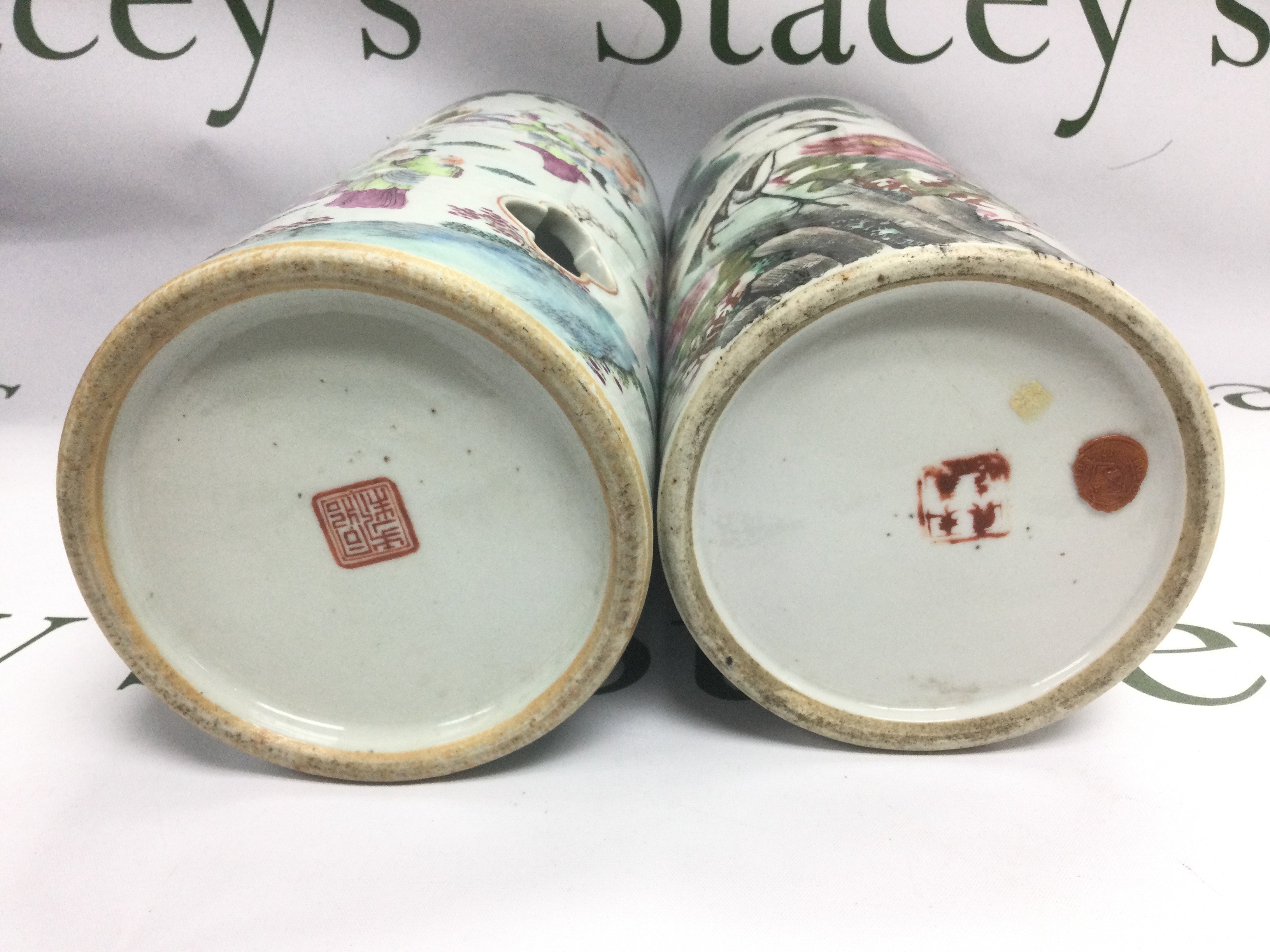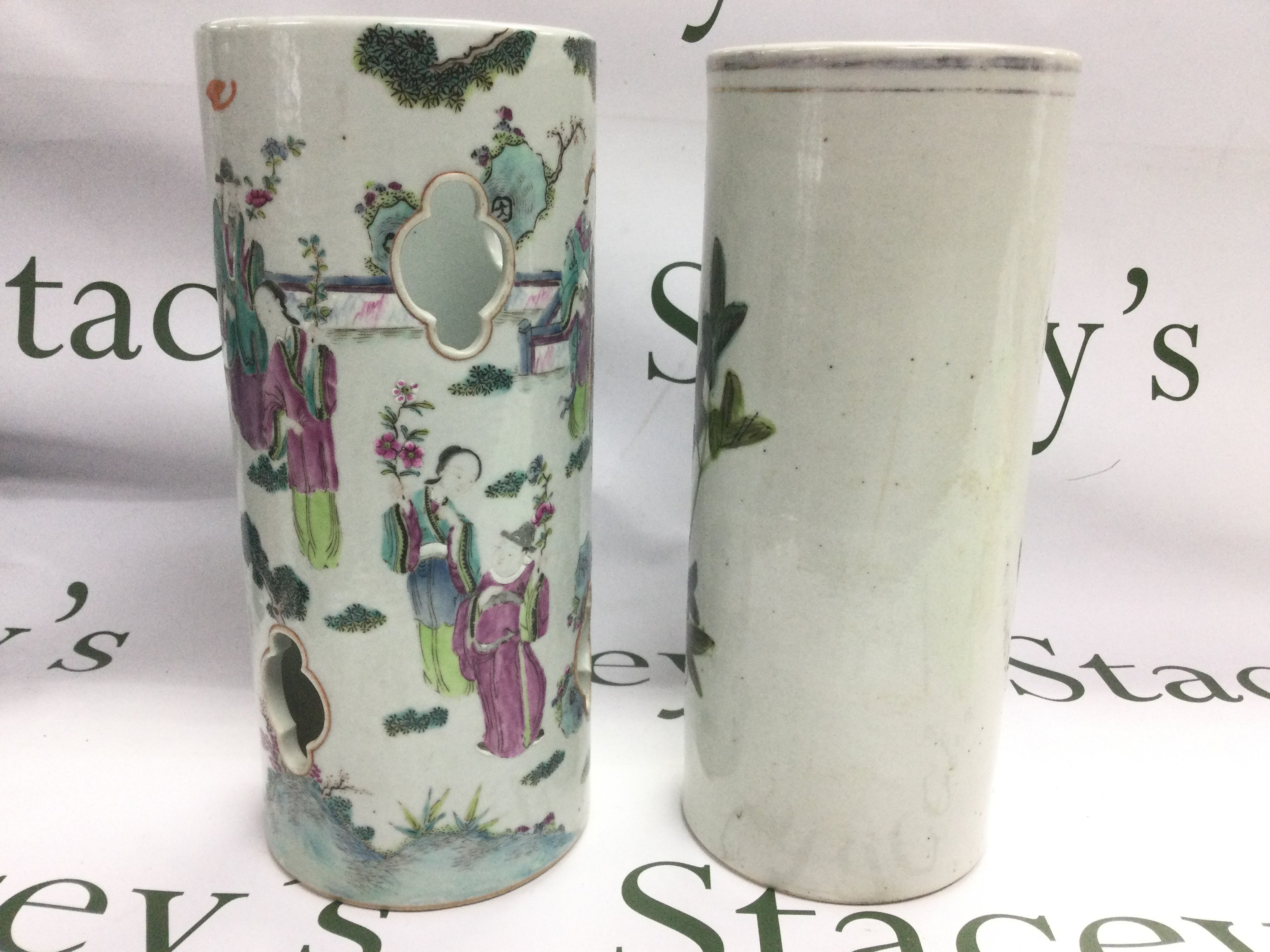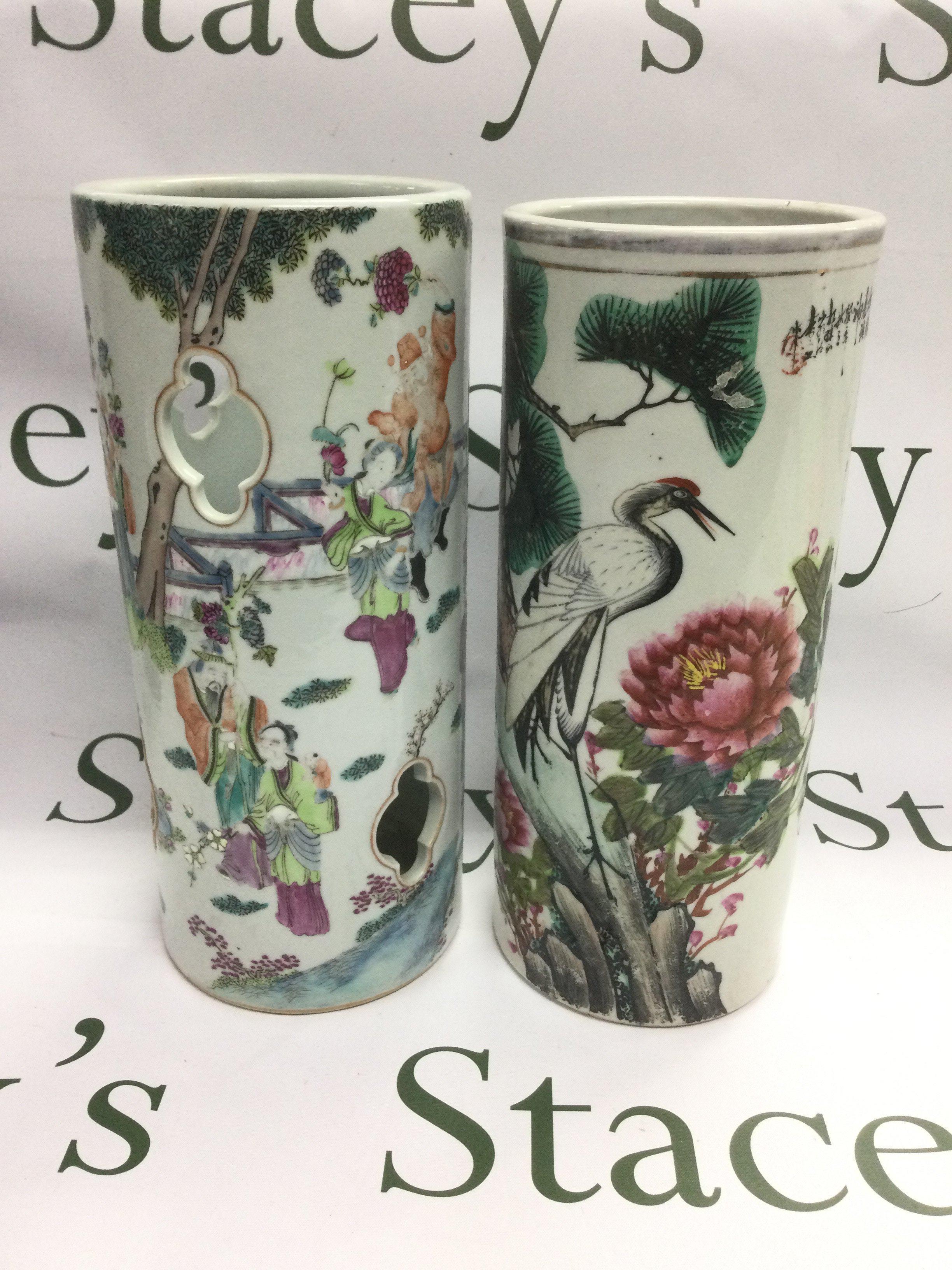 Two Chinese vases, one with piercework decoration and painted with figures in a garden setting, the other being painted with a heron among foliage, approx heights 28cm and 29cm. Shipping category D.