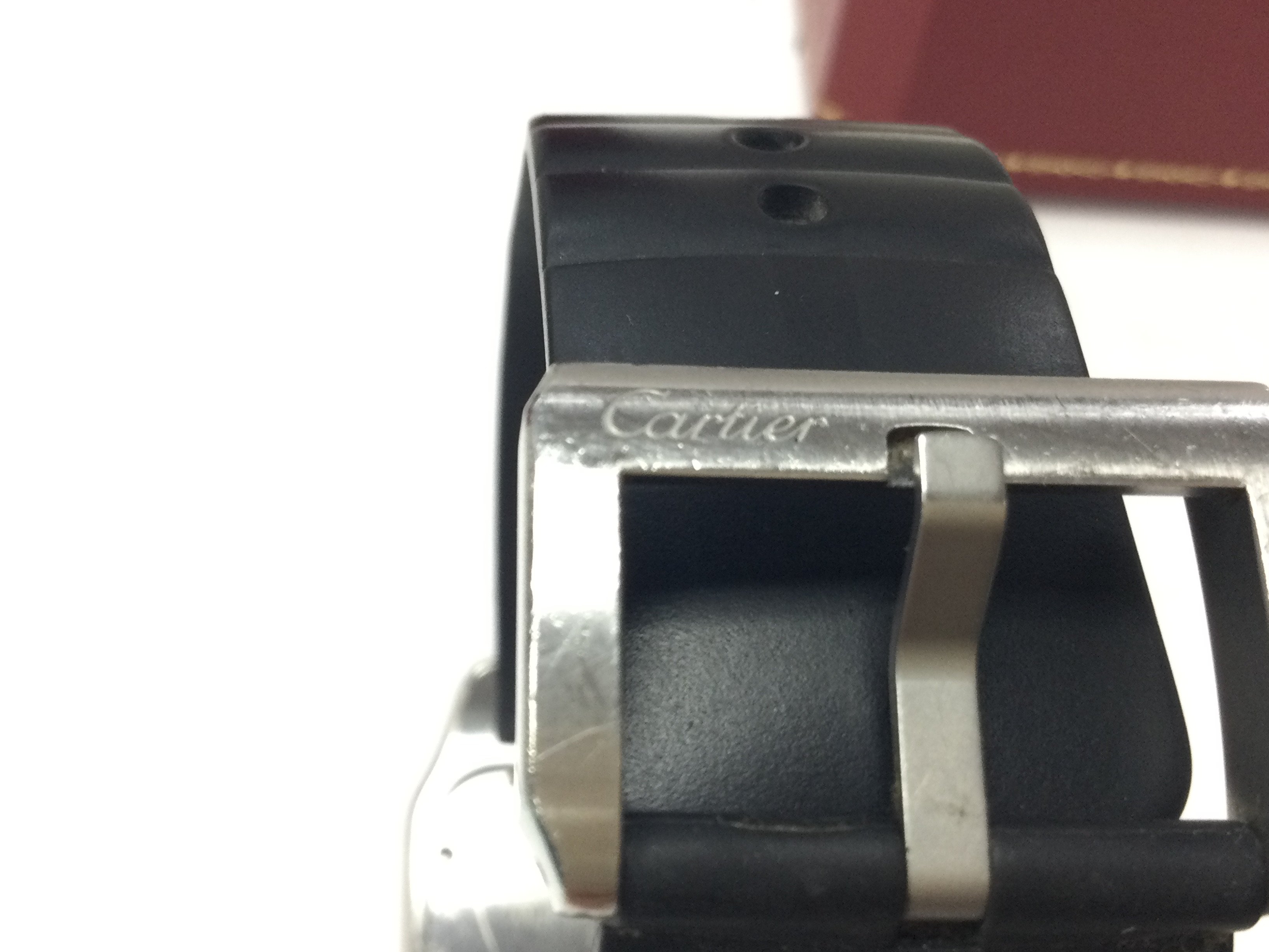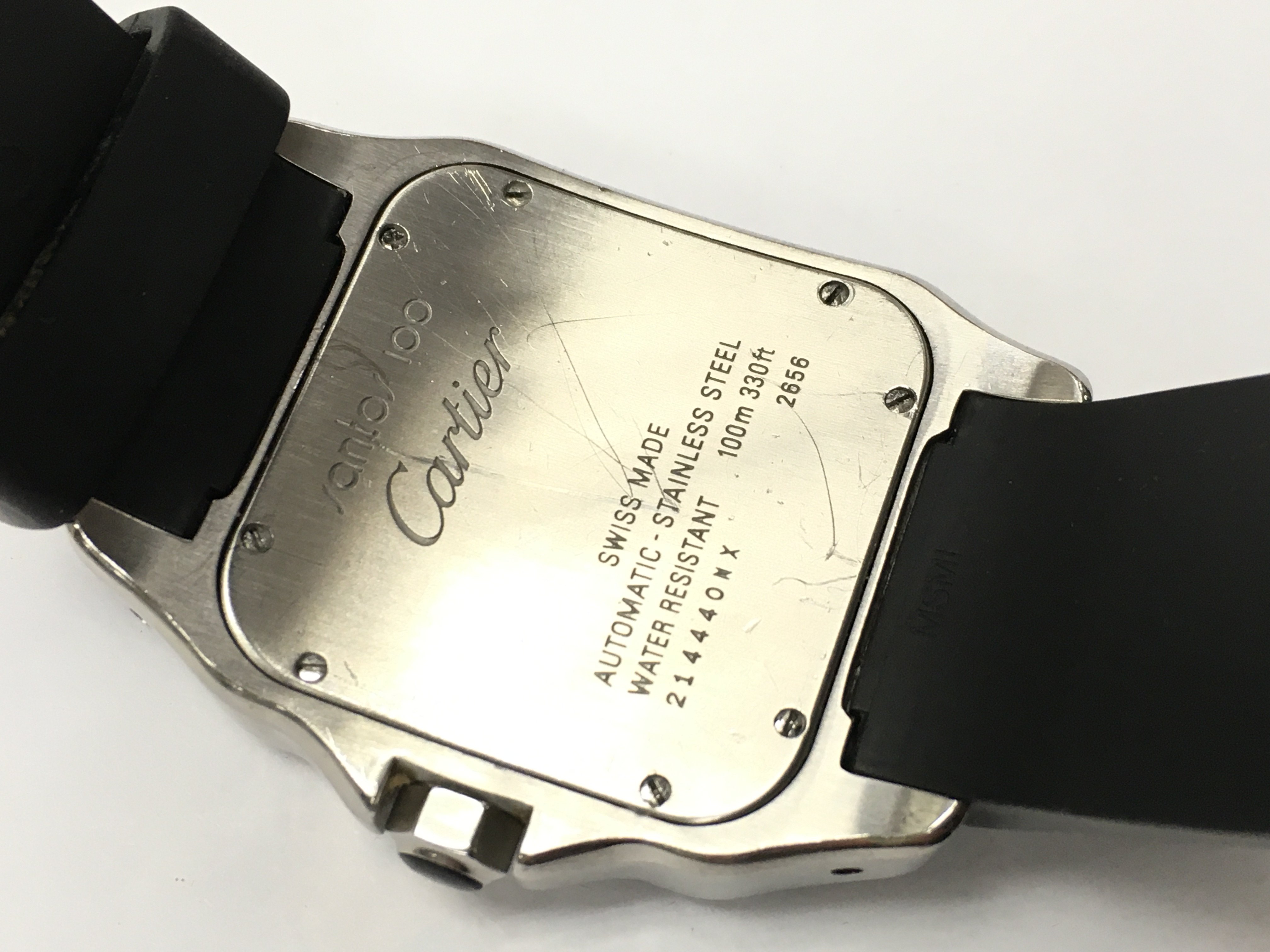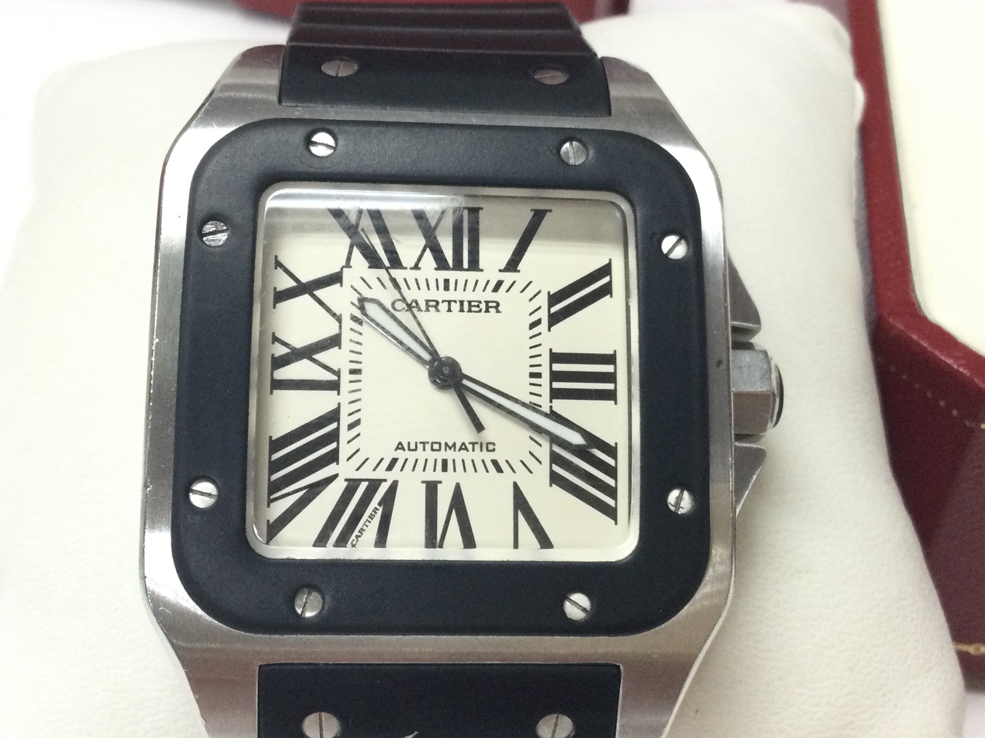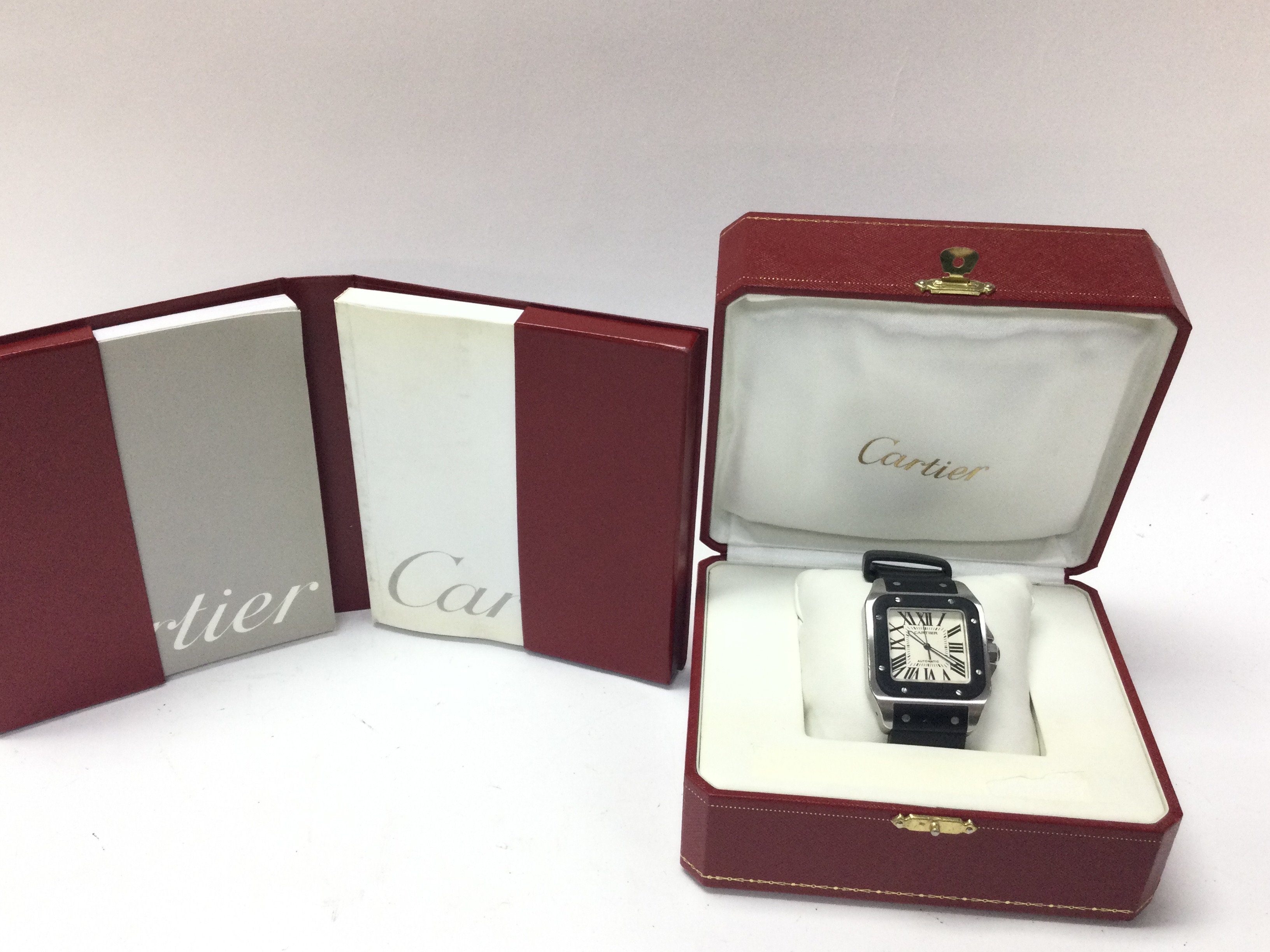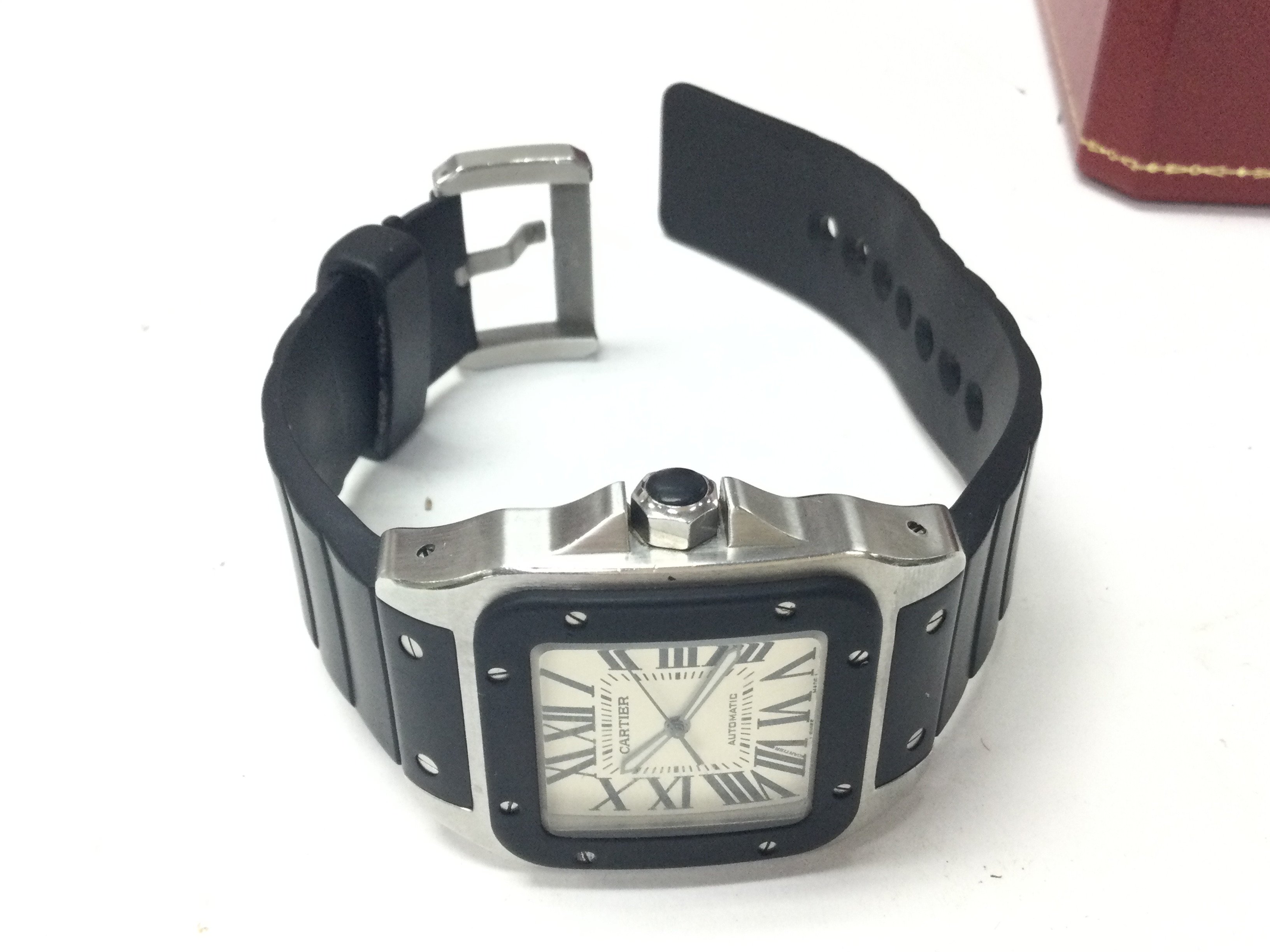 A gents Cartier Santos100 automatic wrist watch. Stainless steel case with black rubber strap. Case is 38mm wide excluding crown. Comes with box and papers. Seen running. Postage B
