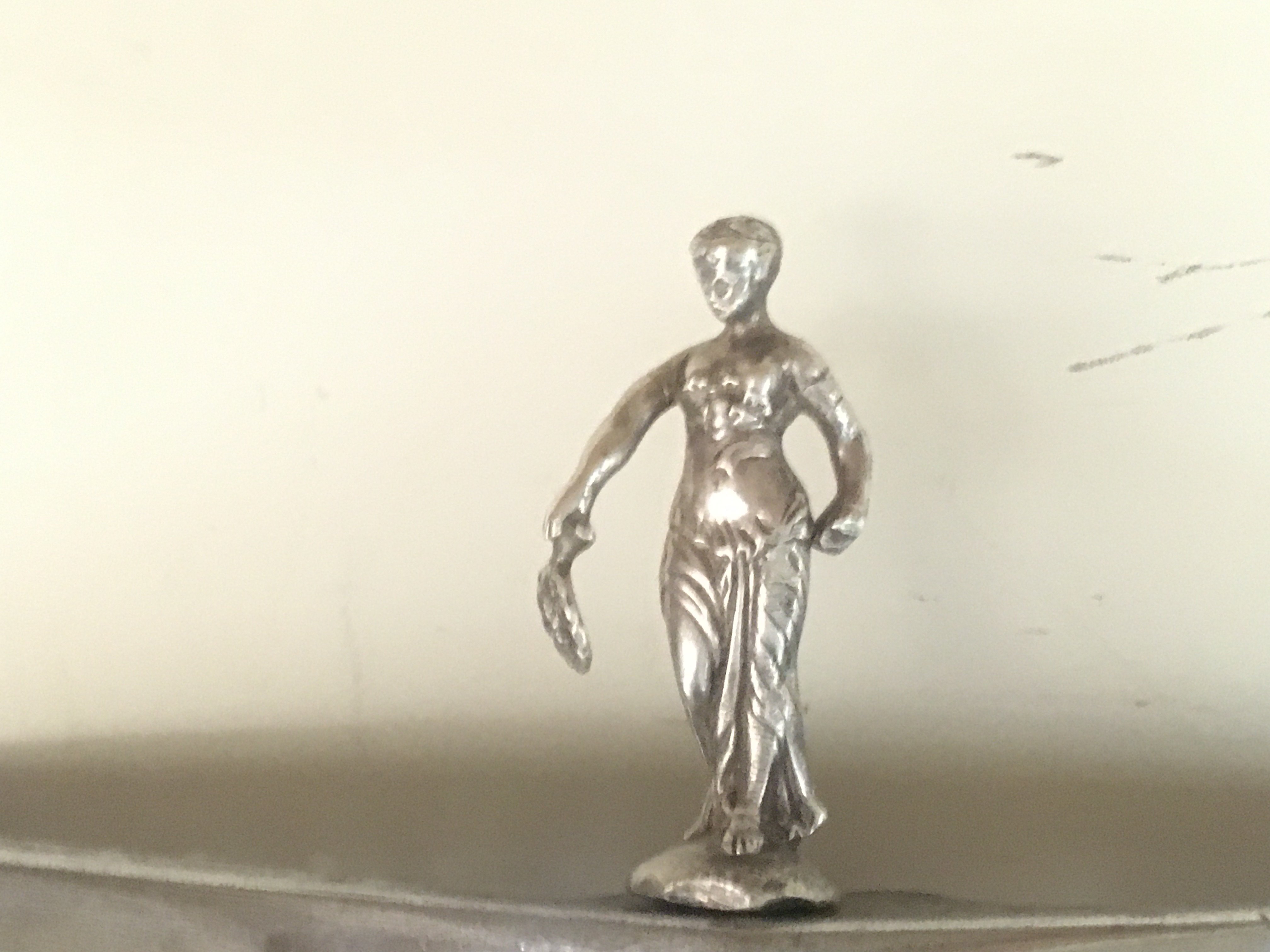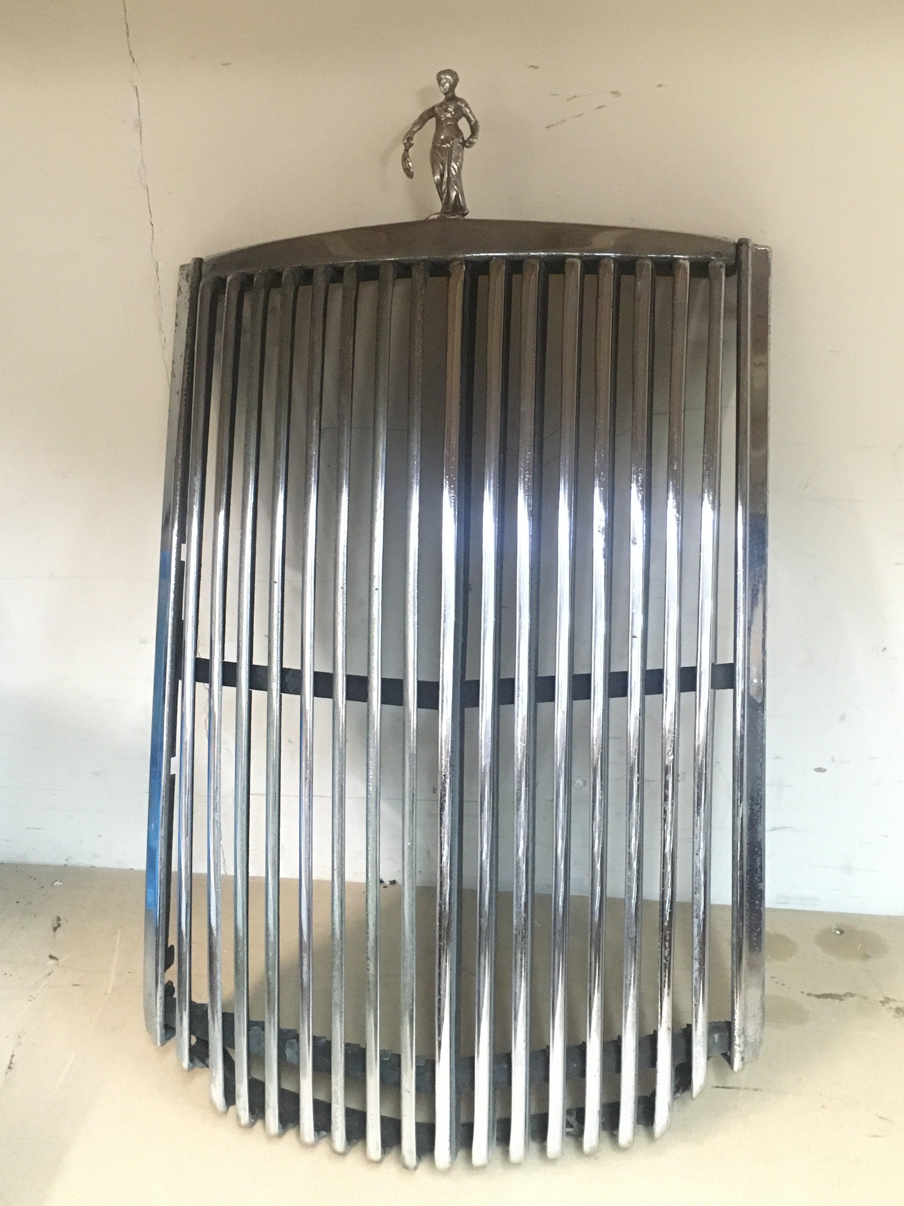 An unusual vintage chrome car grill with small chrome mascot holding victory wreath possibly from a sports car, 52cm tall. this lot cannot be posted