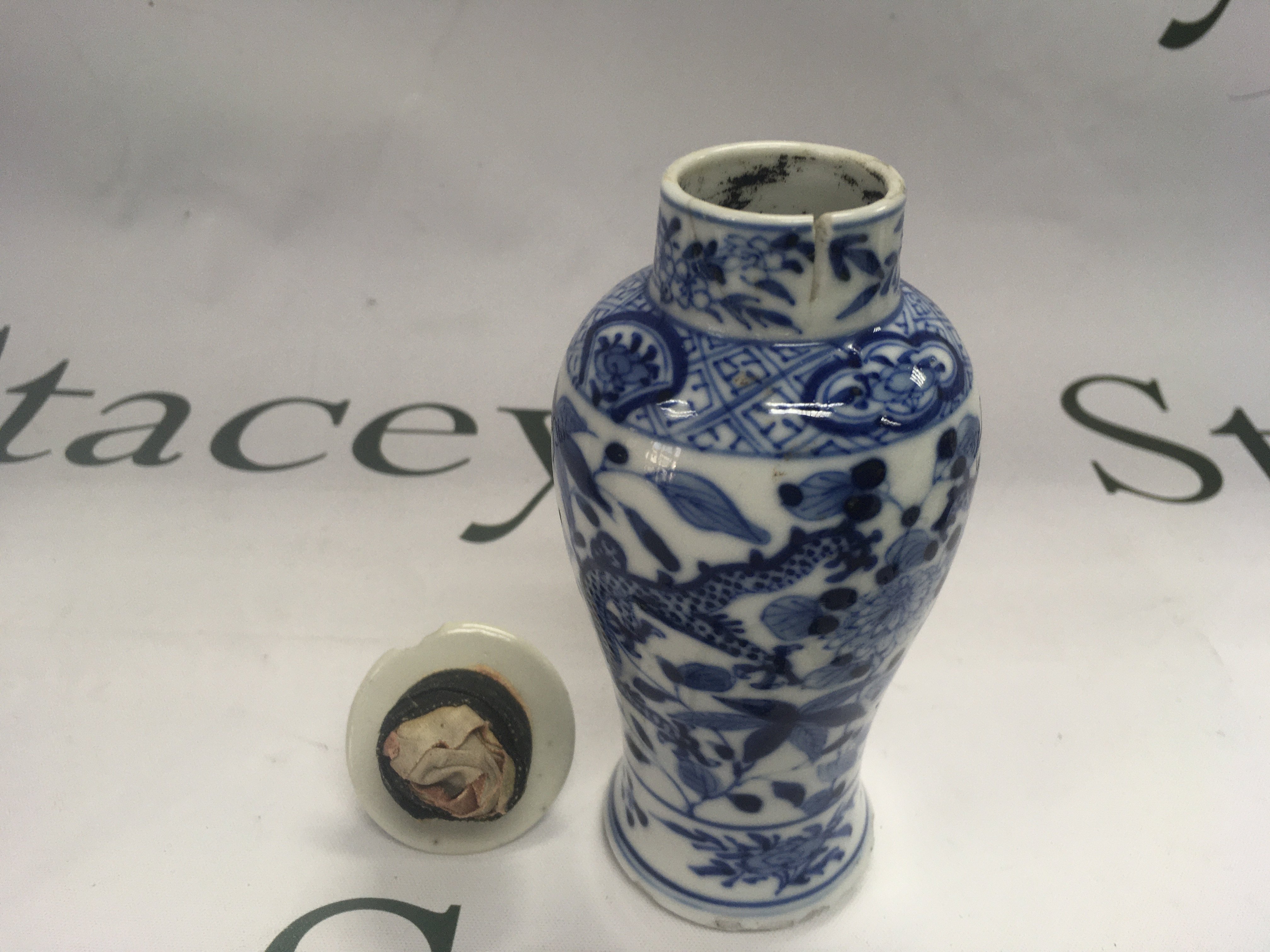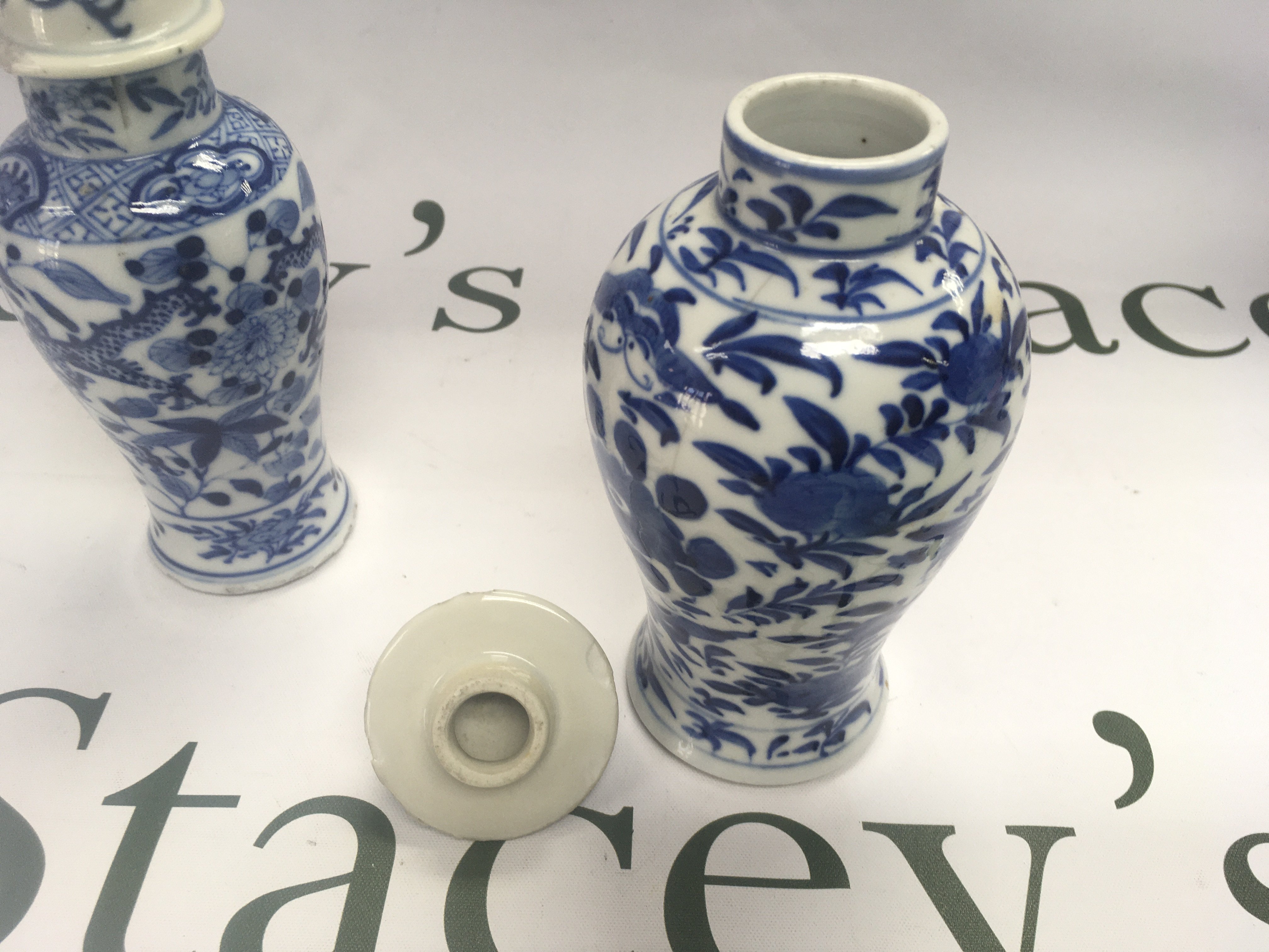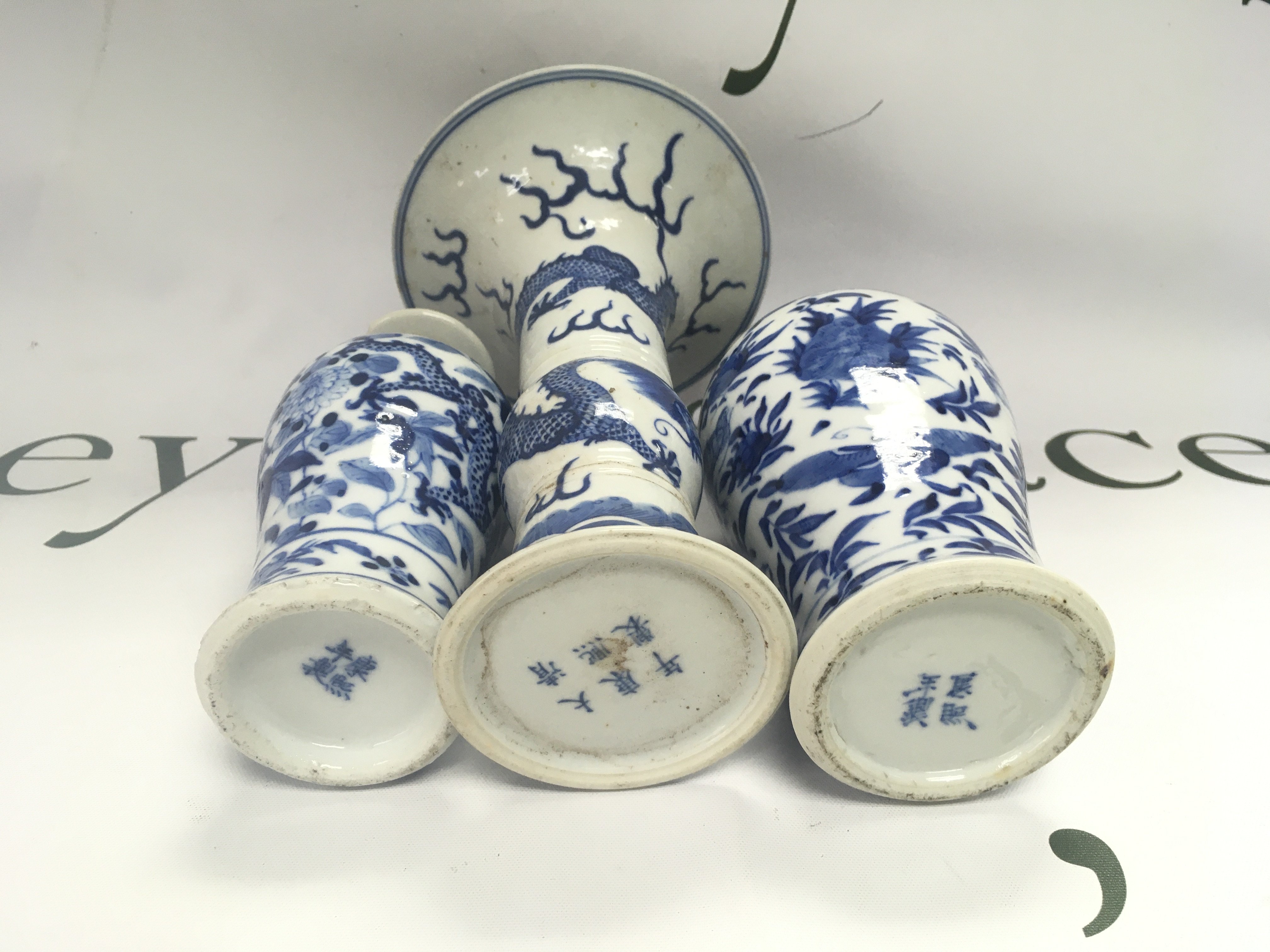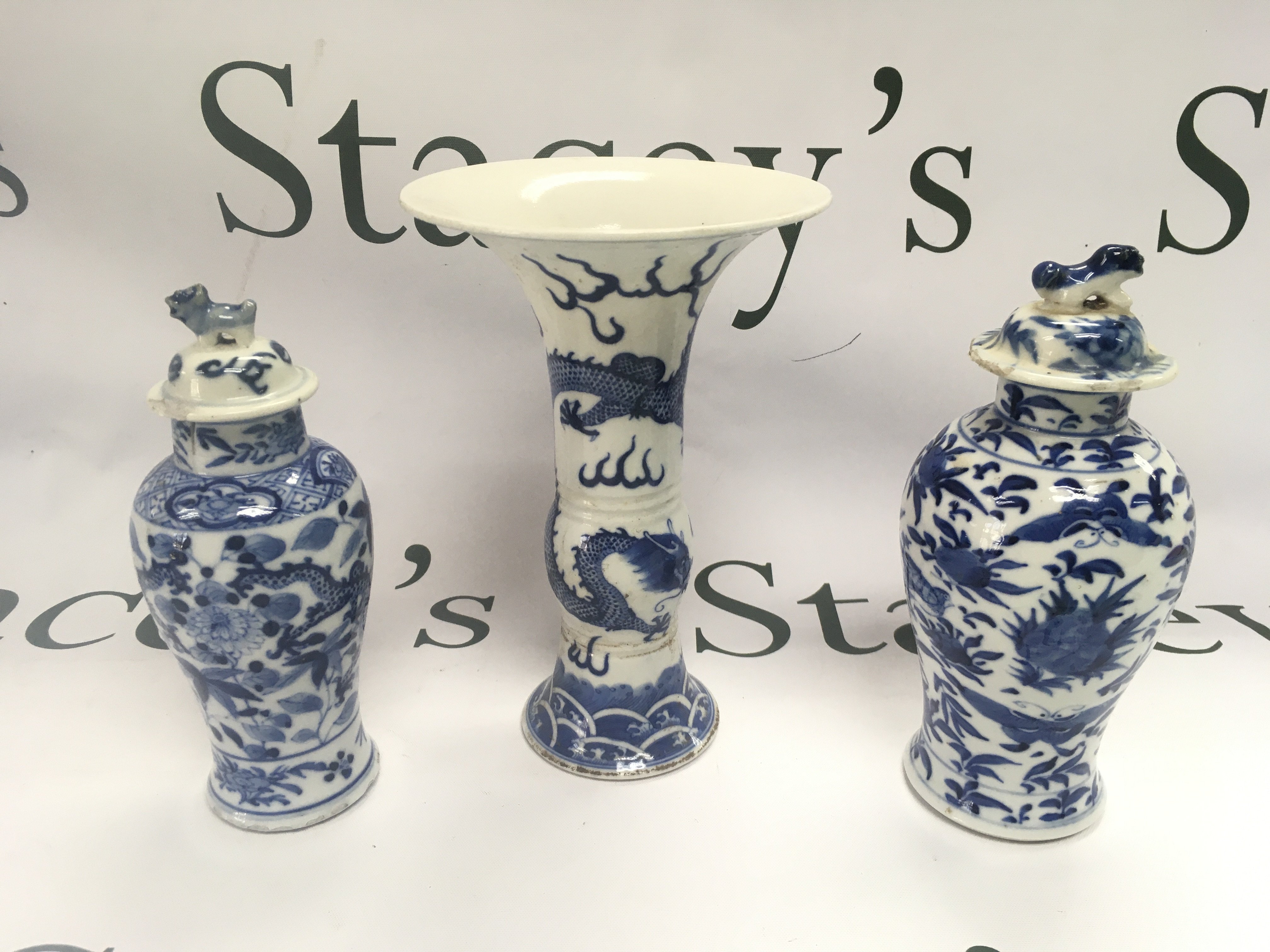Three blue and white Oriental vases, largest approx 17cm tall. Shipping category D.