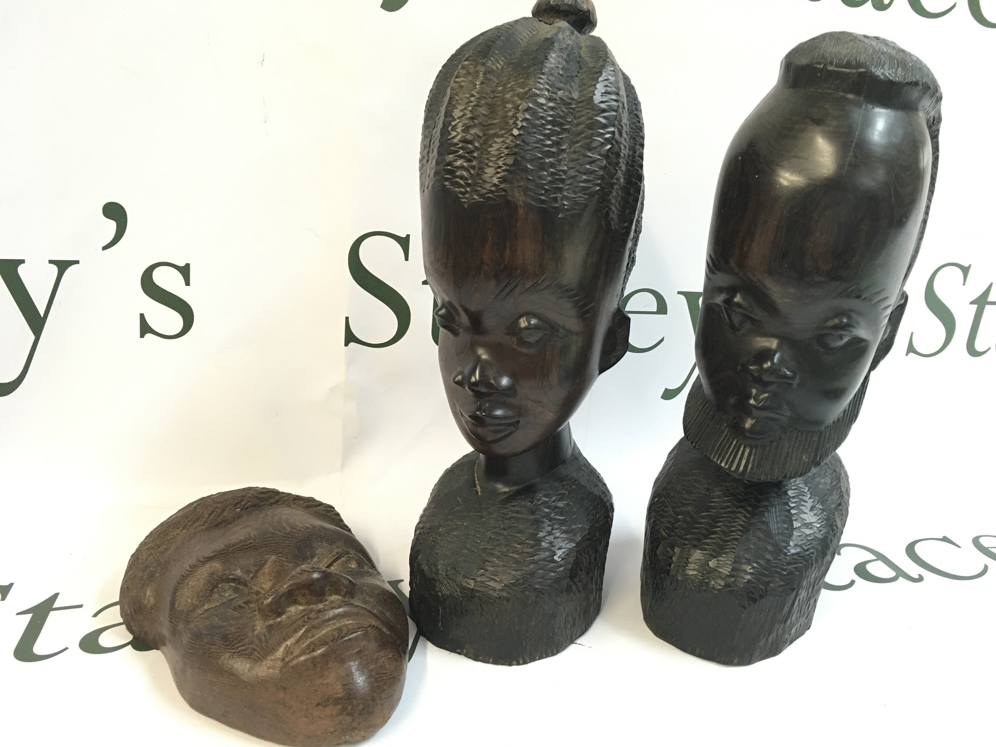 Vintage hardwood carved African Tribal heads and a wall mask. Postage cat B