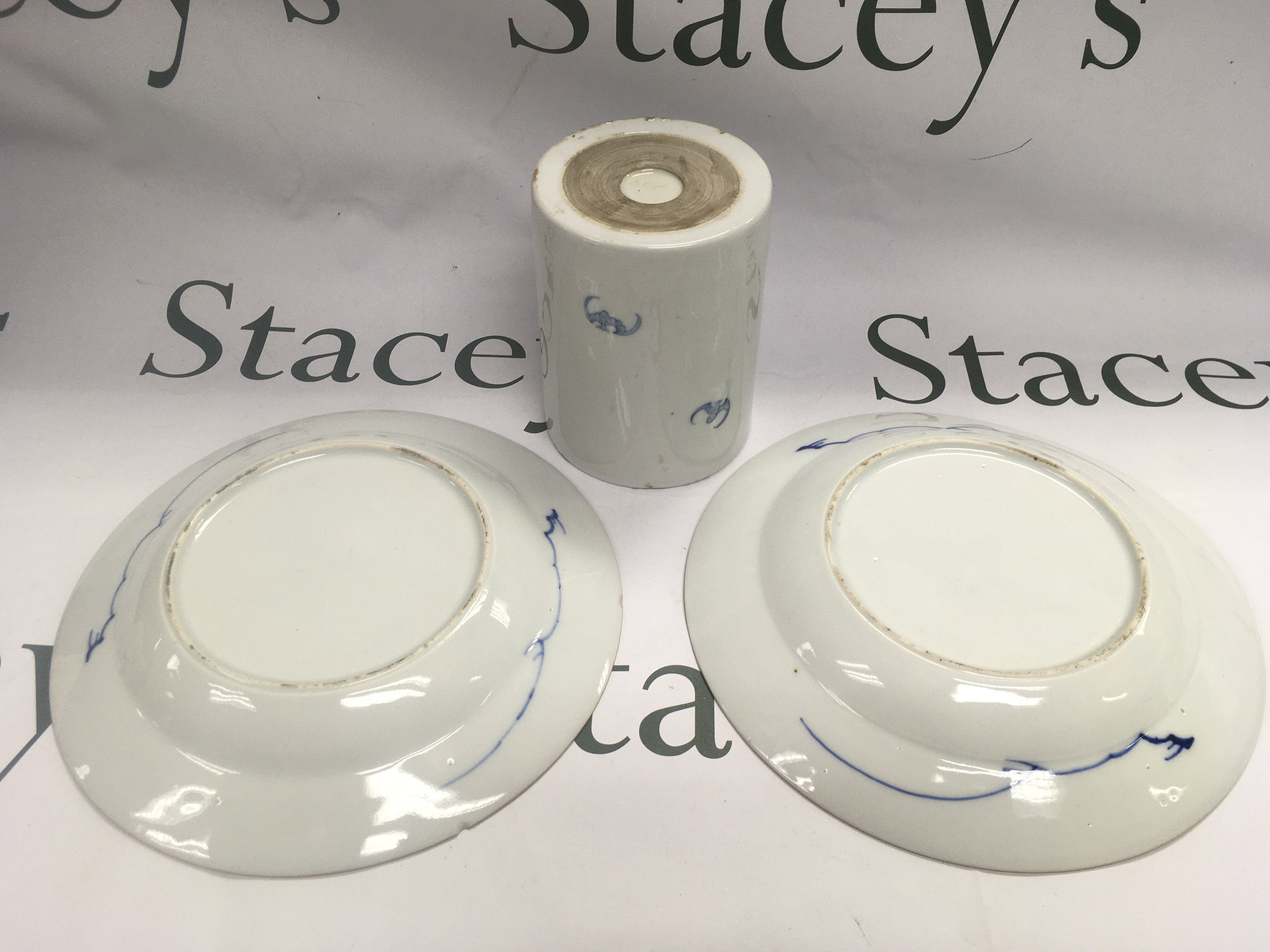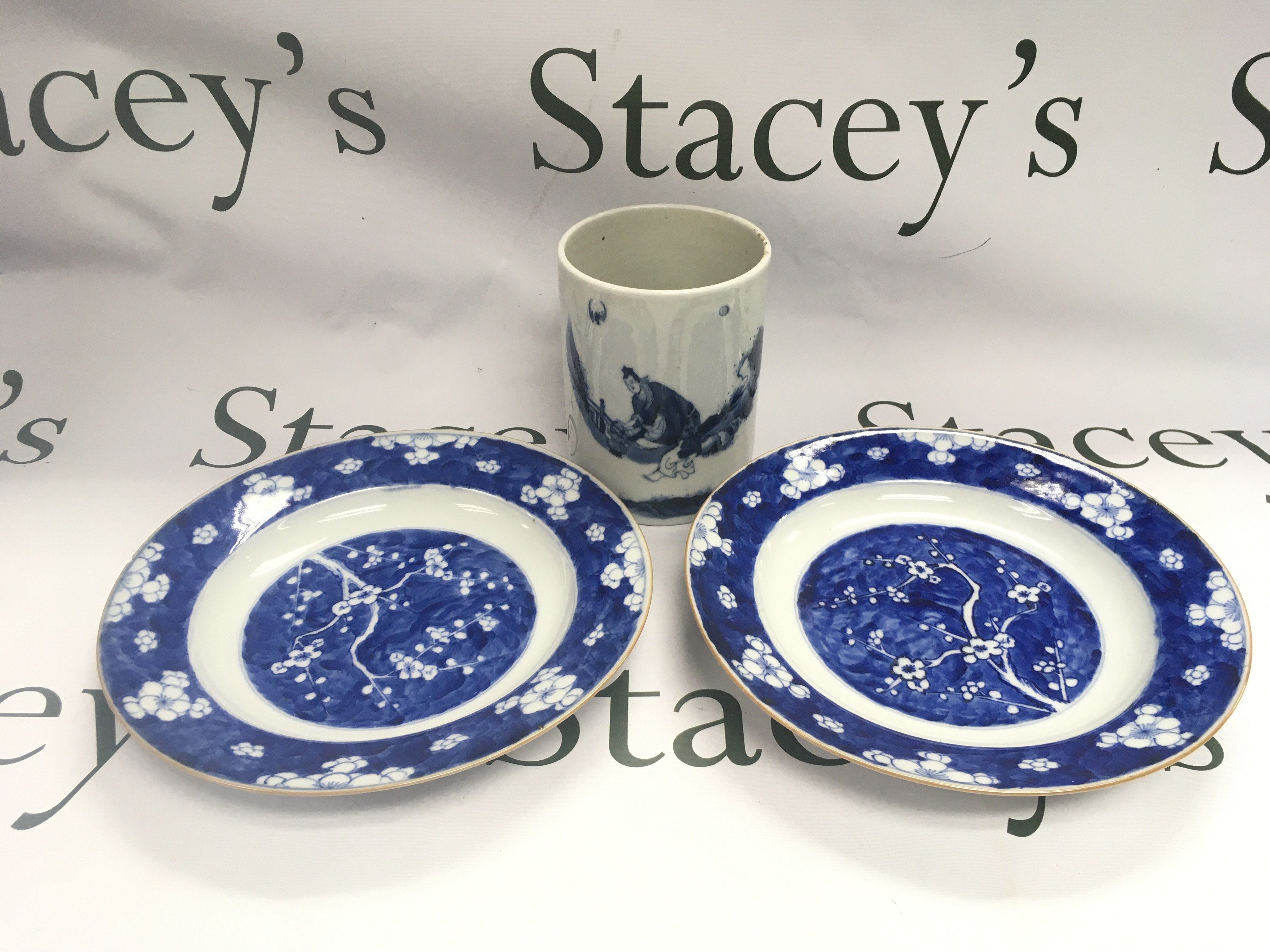 A blue and white brush pot and two dishes decorated with prunus blossom, approx diameter 23cm. Shipping category D.