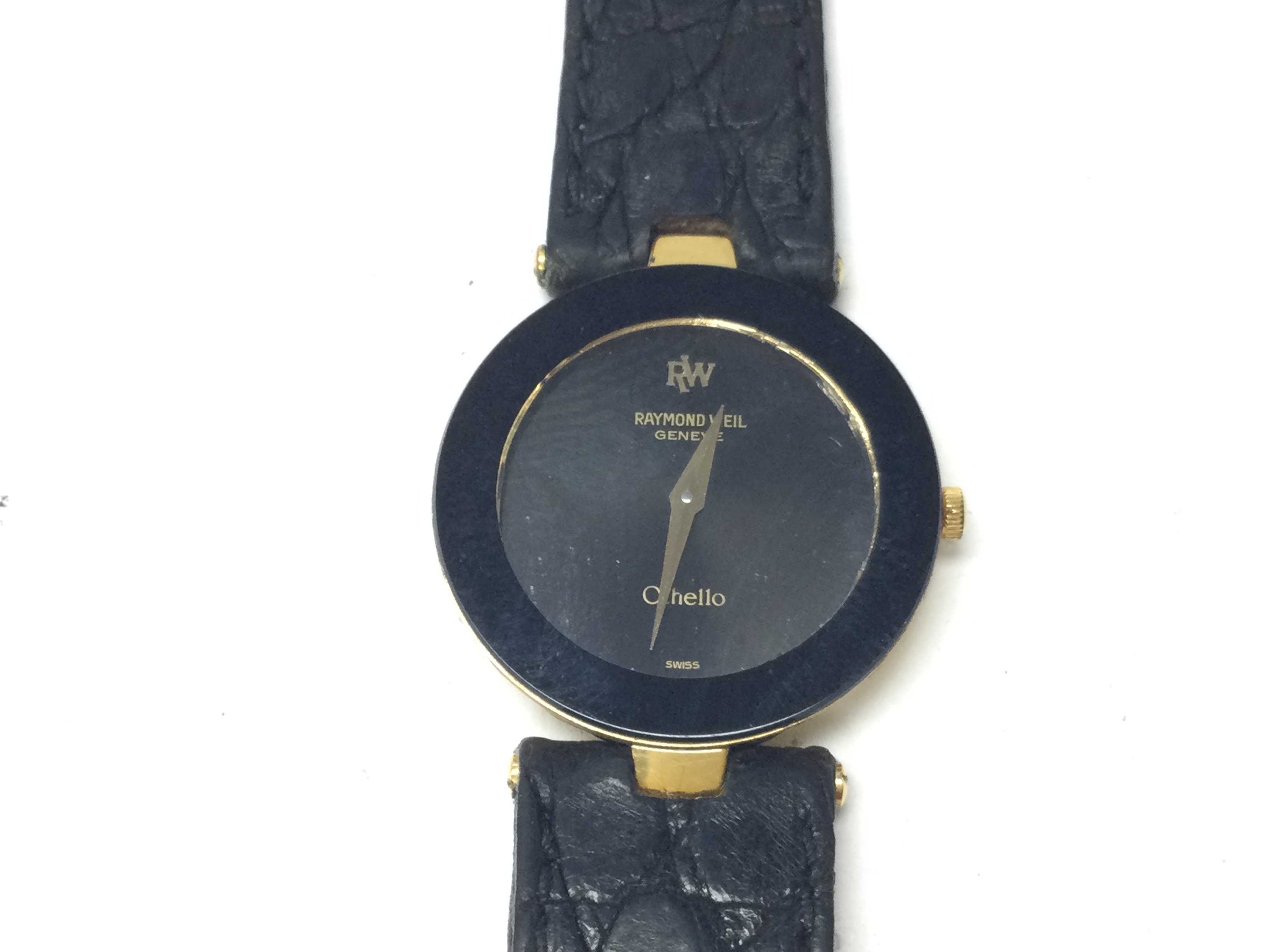 A ladies Raymond Weil othello 18ct gold plated watch on black leather strap. Approx 24mm vase with black dial. Postage B