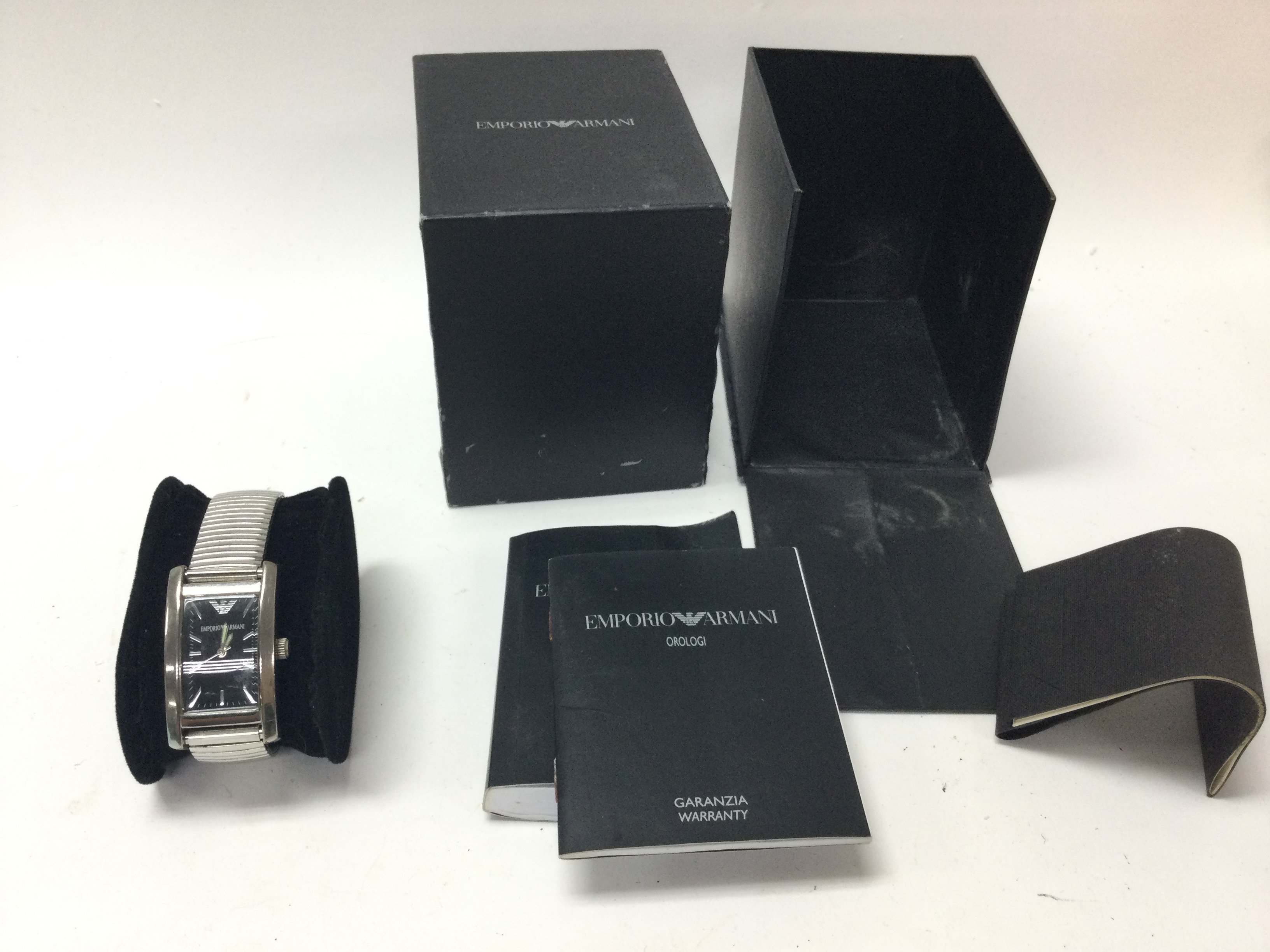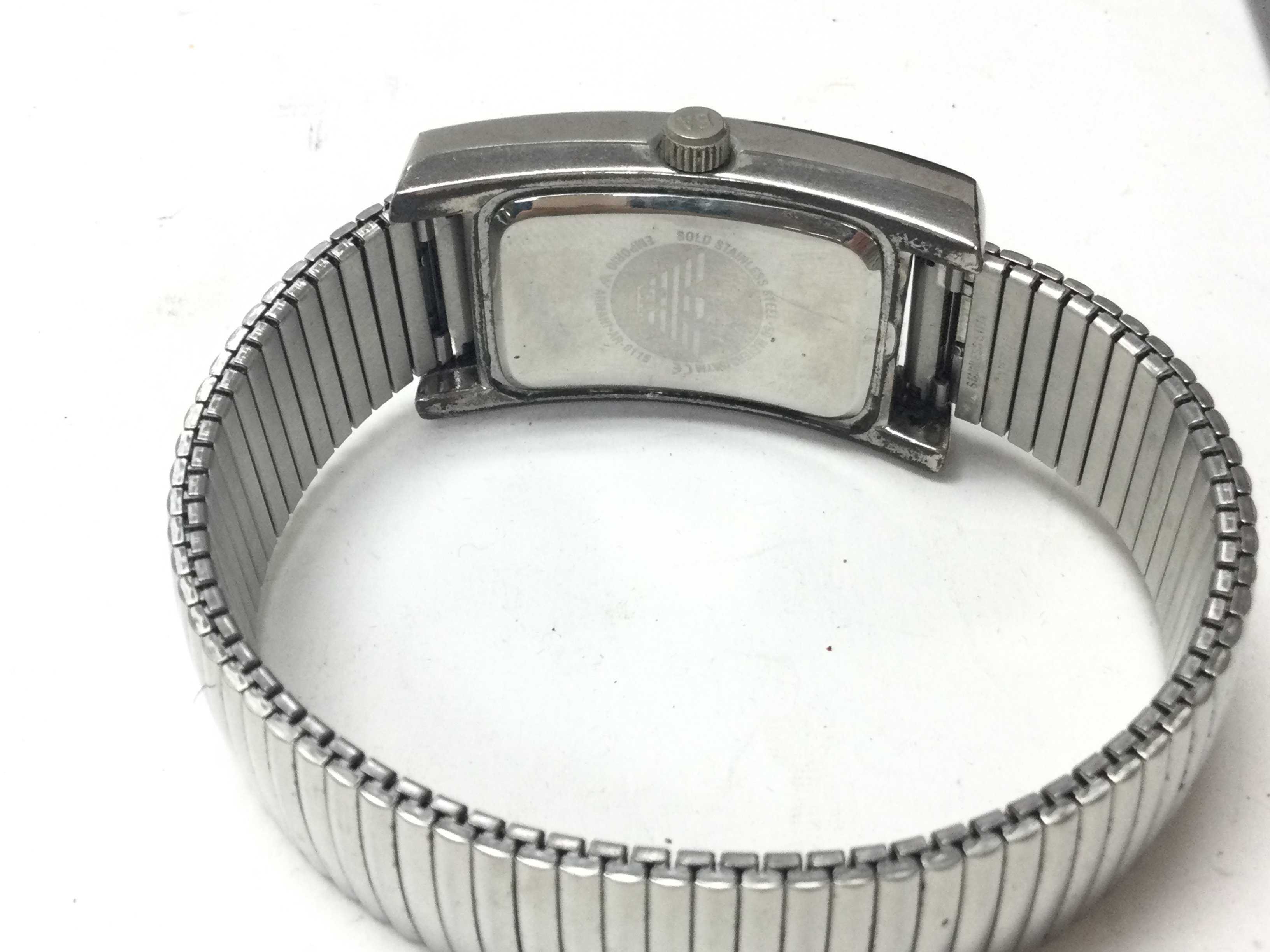 A stainless steel Emporio Armani watch on stretch bracelet. Seen running. Comes with box and papers. Postage B