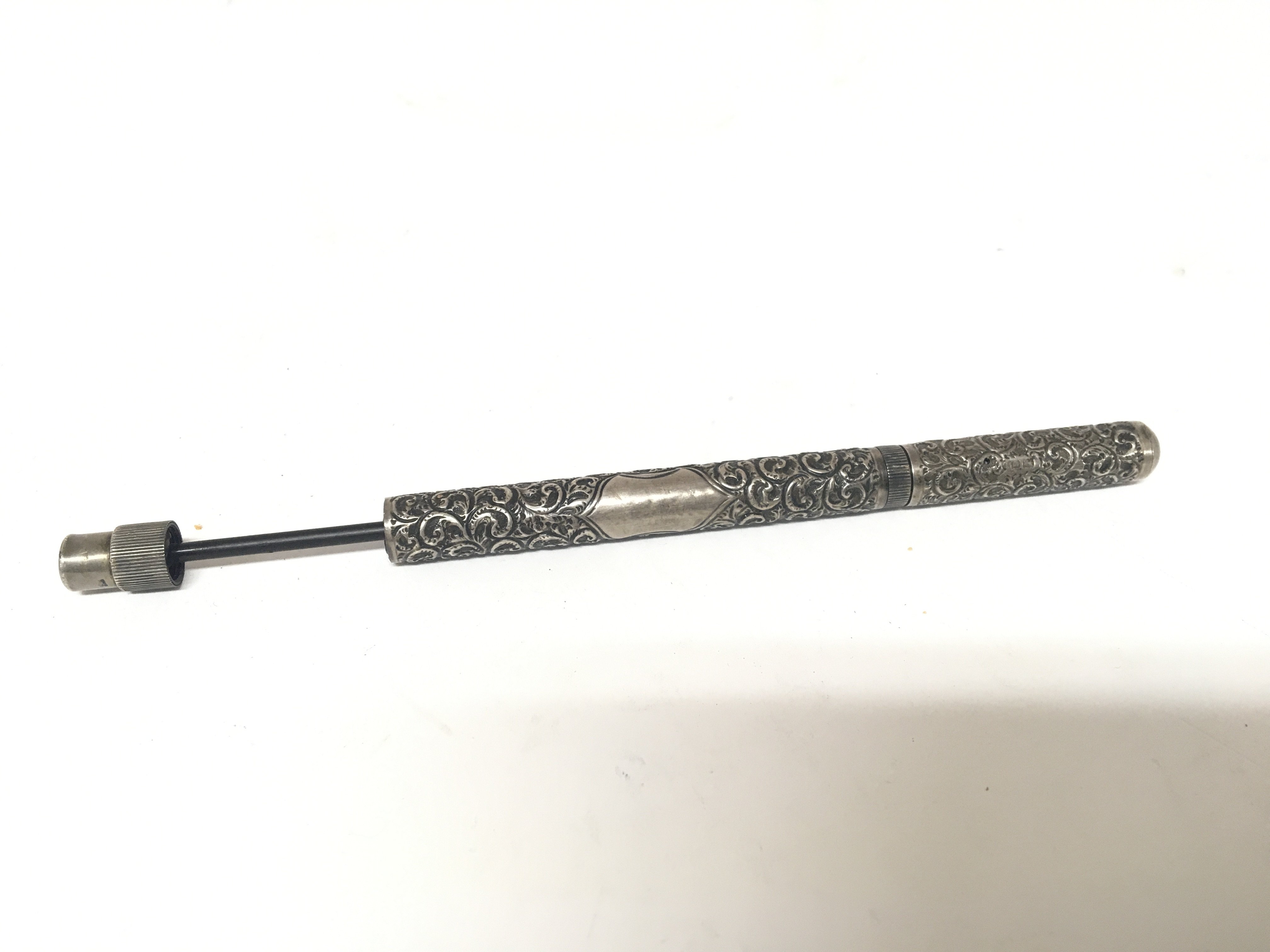 An early example of a silver cased fountain ink plunger pen onoto delerue with an outer silver case London 1912 hallmarks maker D L R Ltd.
