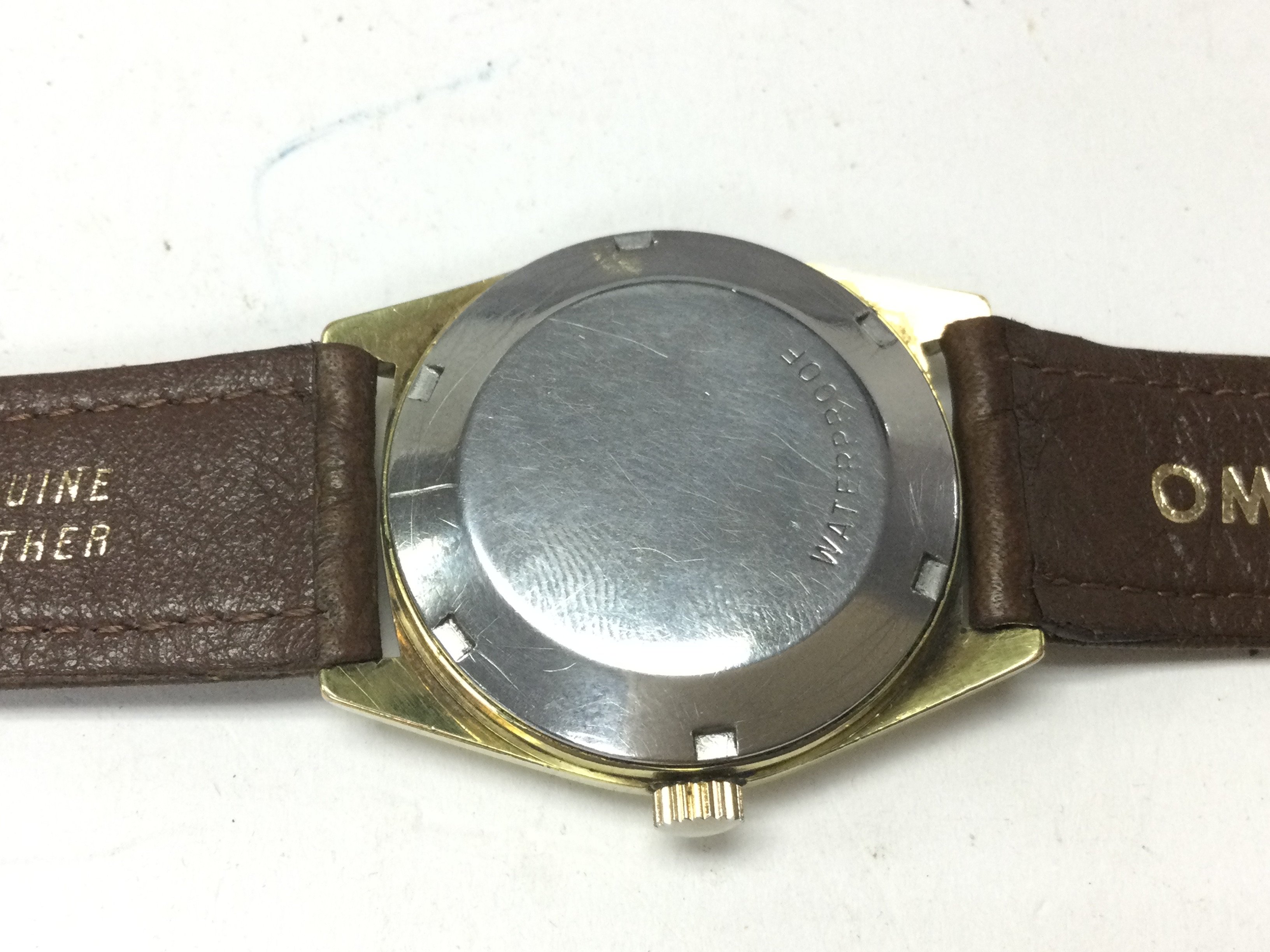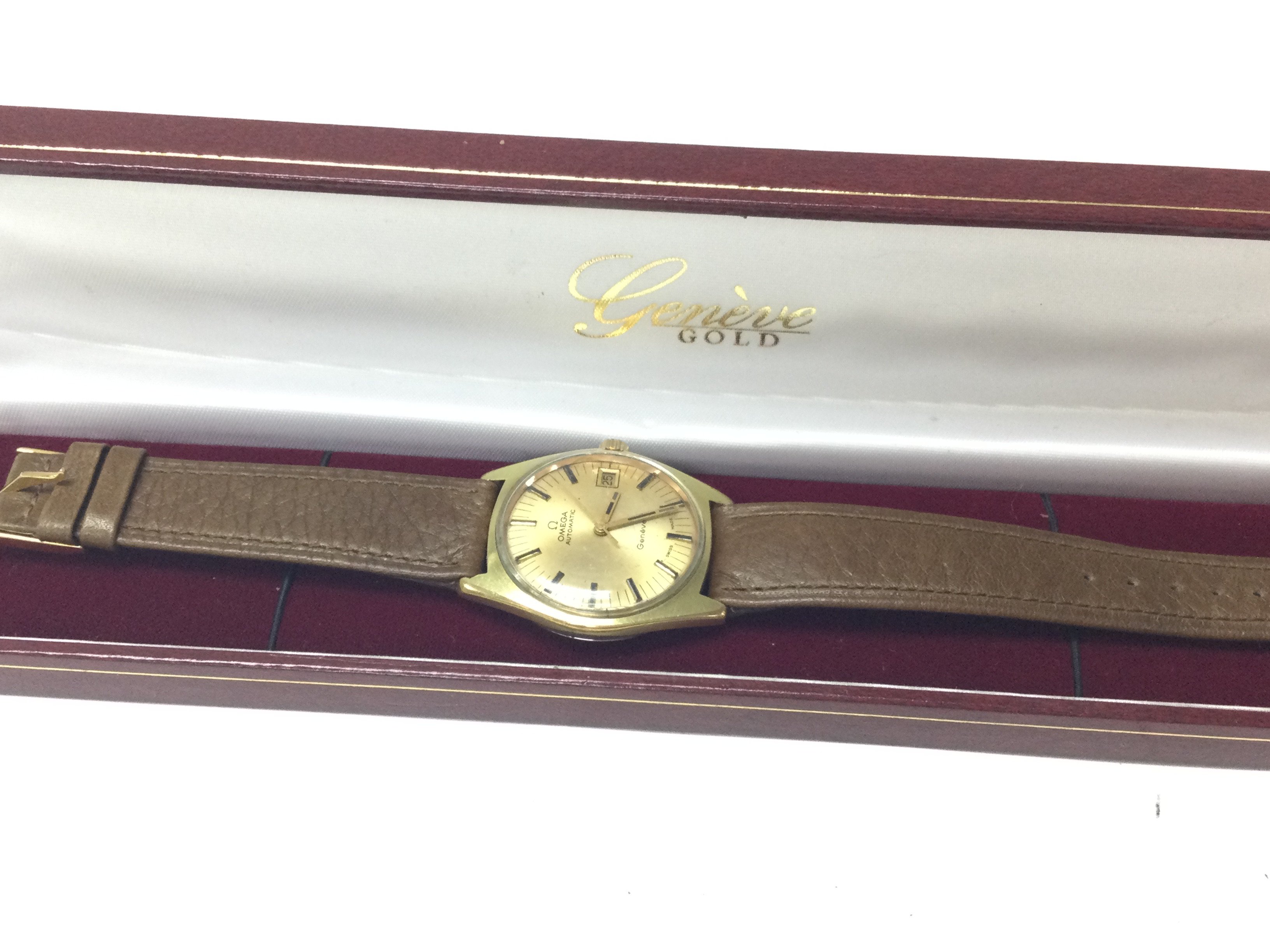 Am Omega Geneve automatic gold plated watch with tan strap and omega buckle. Circa 1971. Comes with box and seen running. Case approx 36mm. 565 cal. Postage B