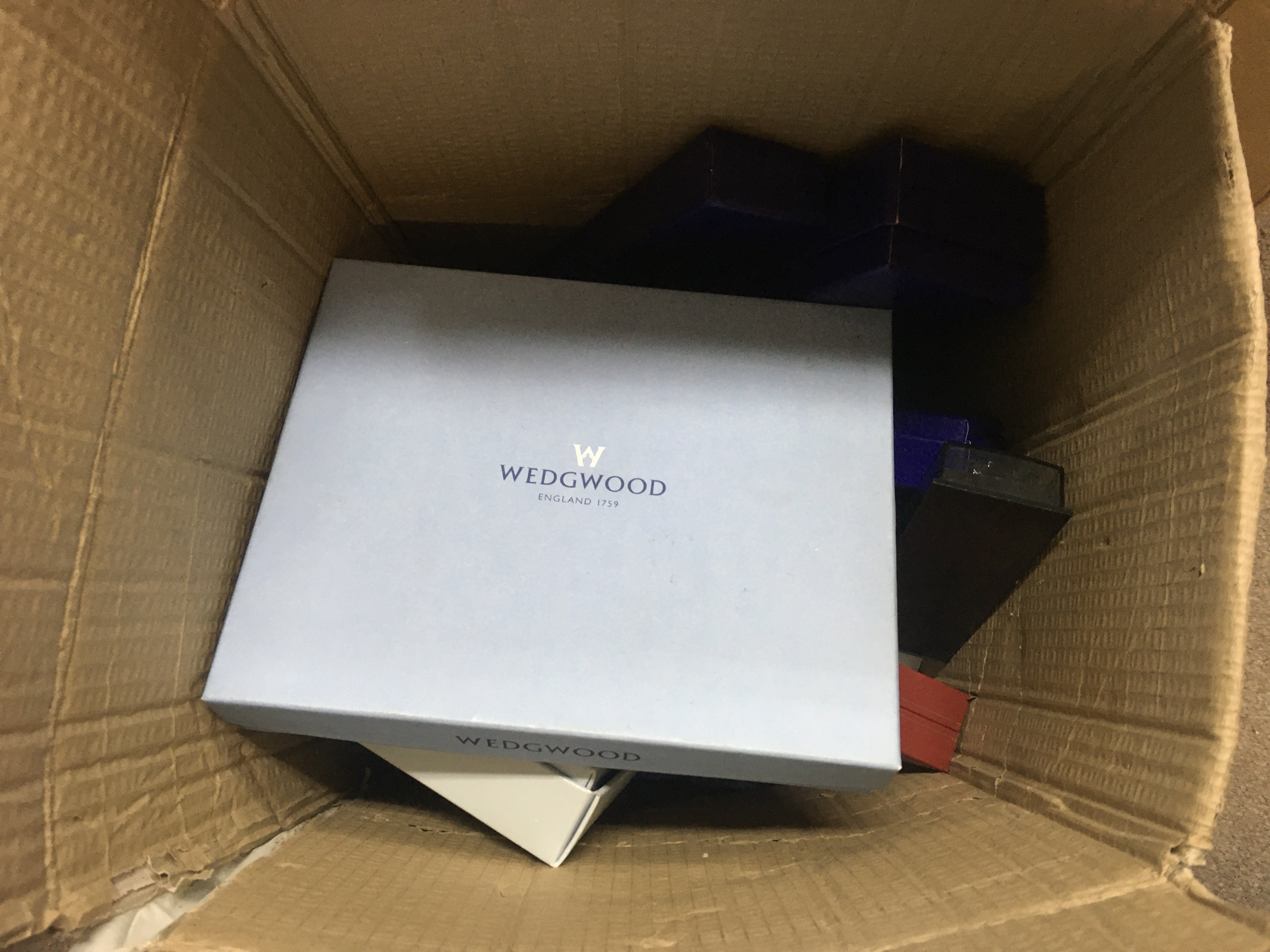 A Collection of pens including Parker, Sheaffer and boxed Edinburgh crystal cake knives, boxed porcelain Wedgwood Atlas dish. This lot cannot be posted