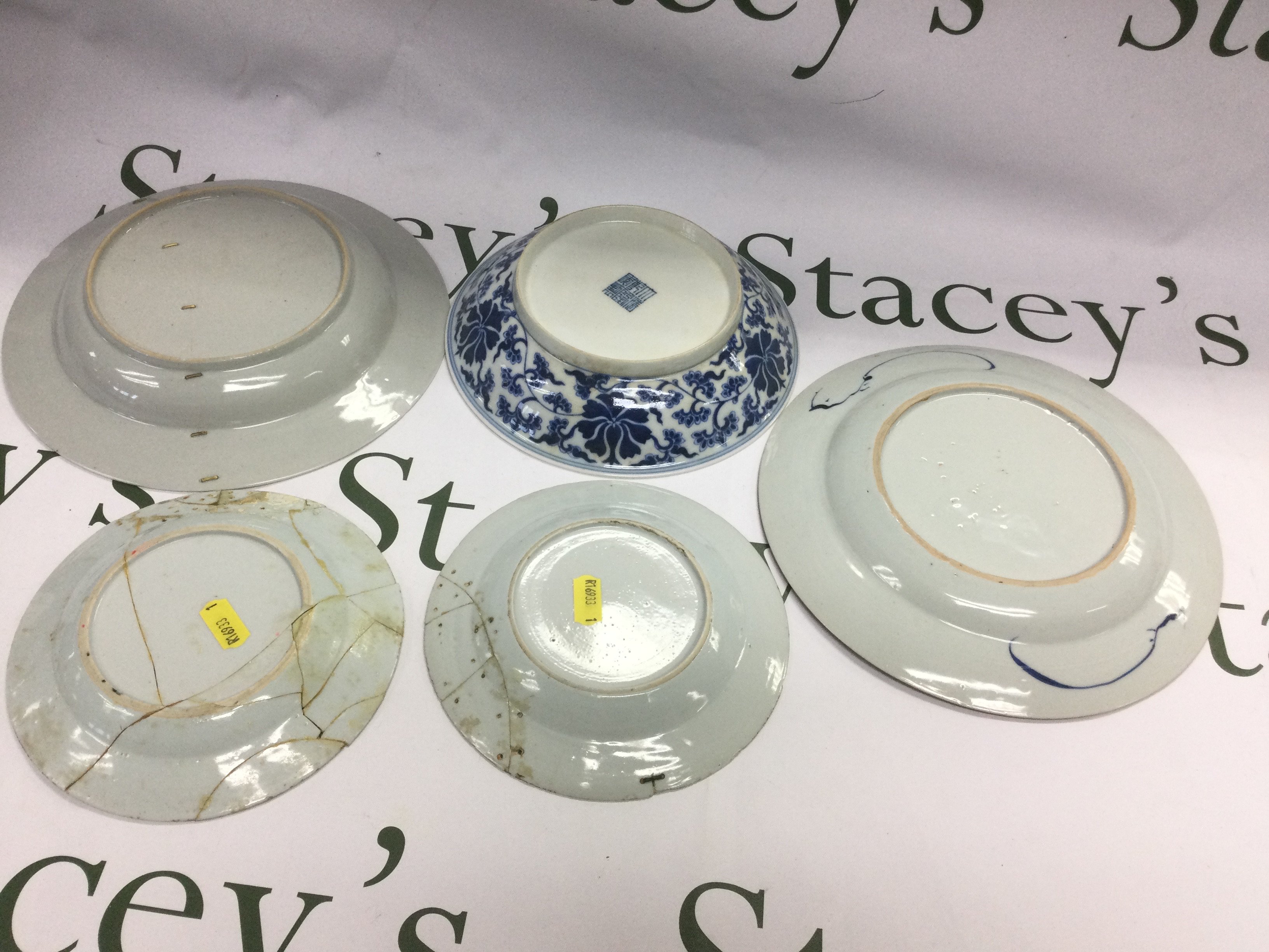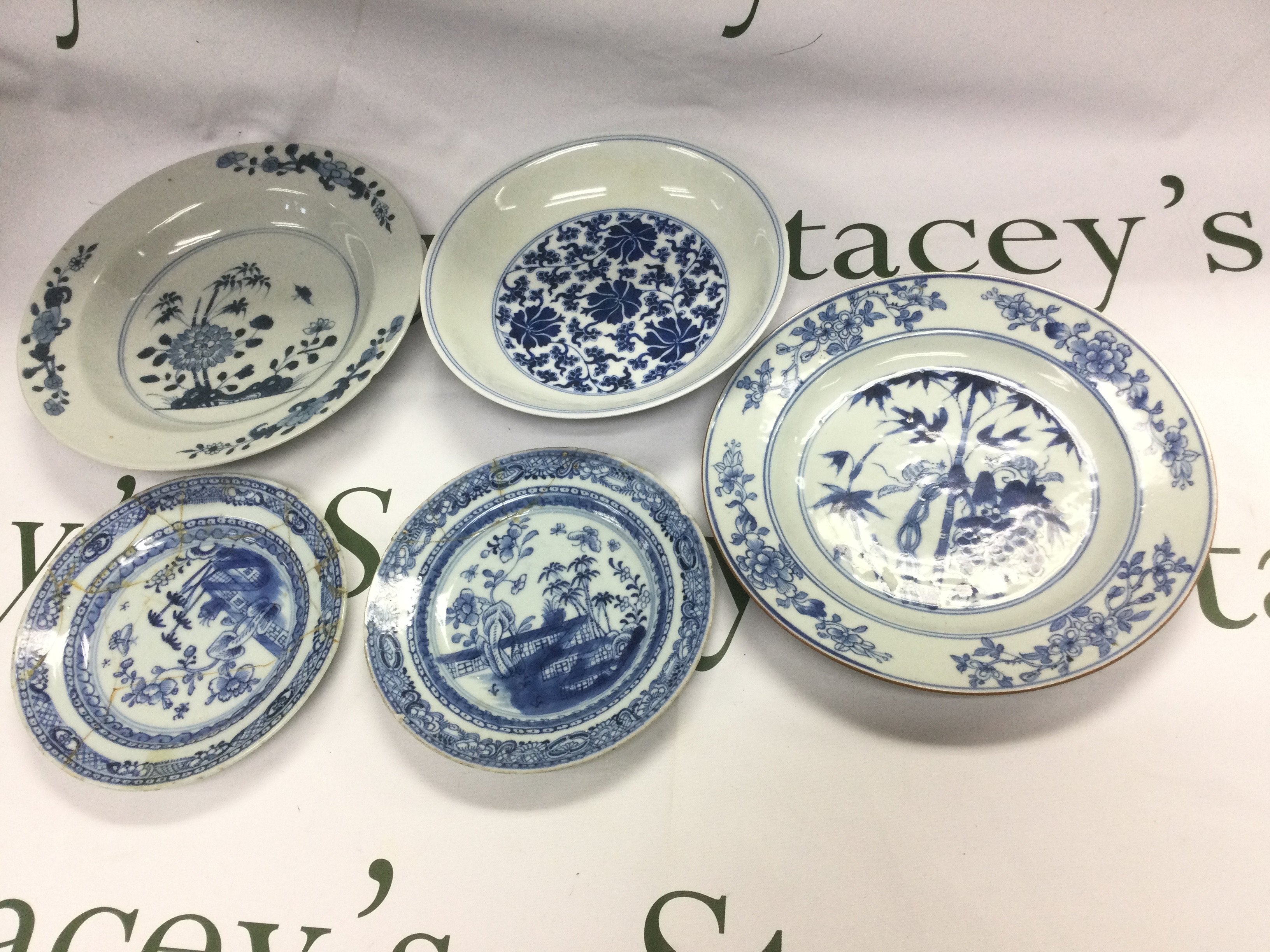 Five blue and white dishes, largest diameter approx 23cm. Some damages. Shipping category D.