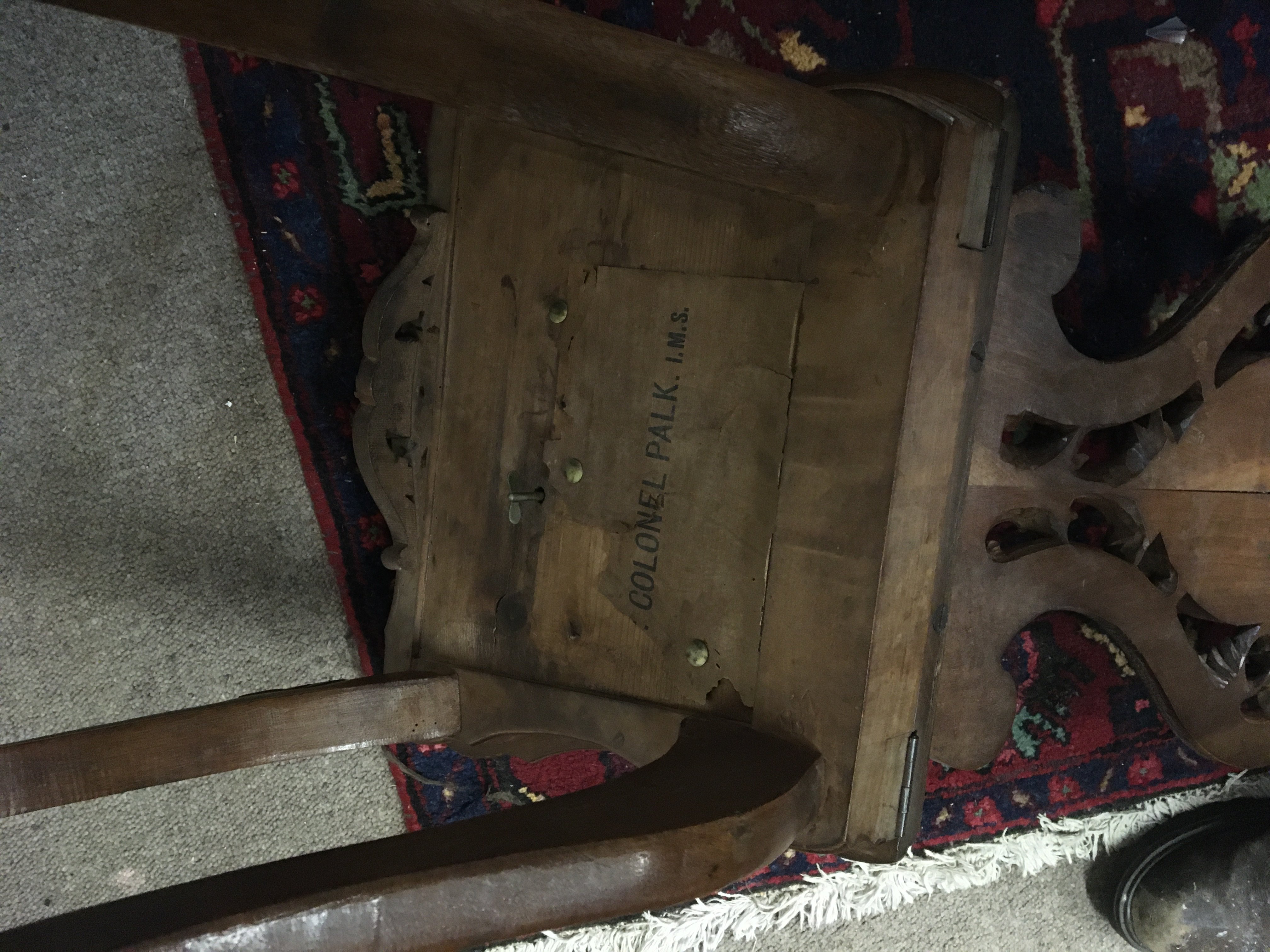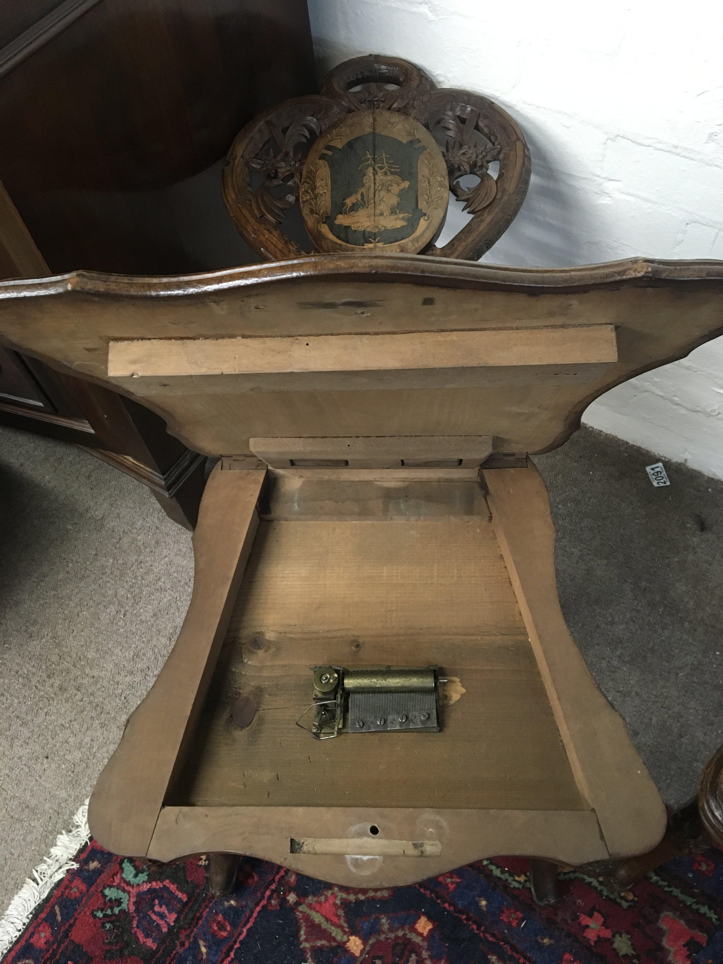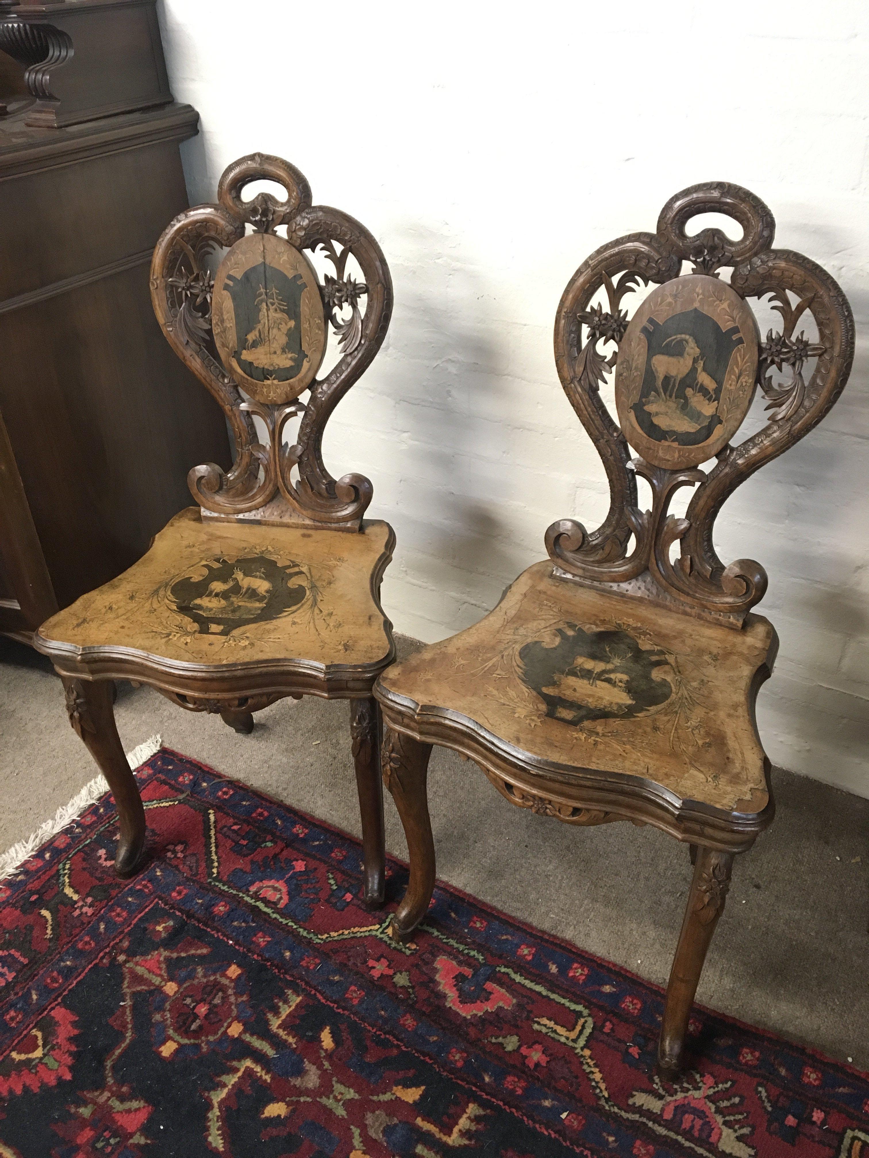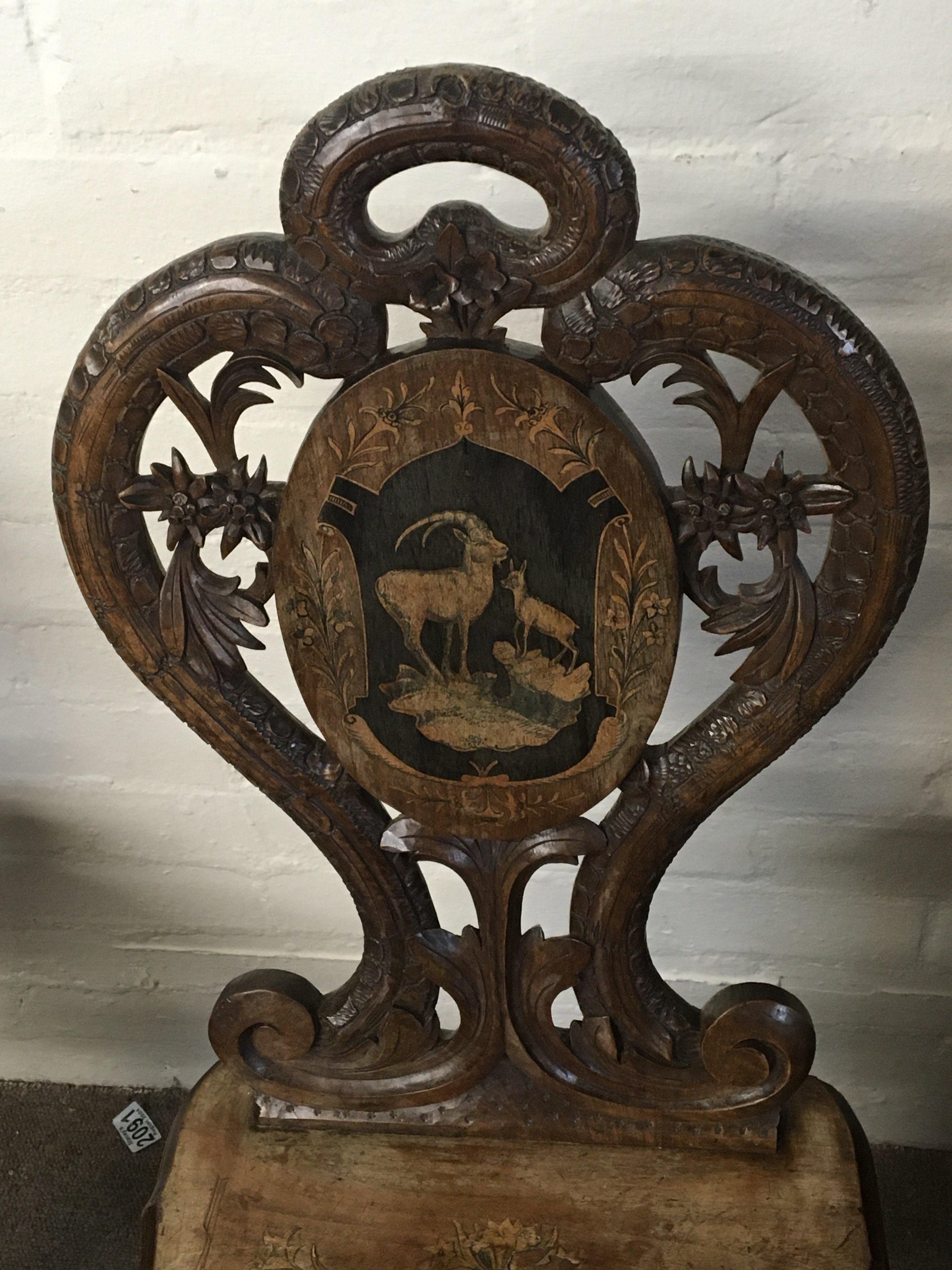 A pair of early 20th Century inlaid and carved Austrian chairs. the backs inlaid with images of Alpine ibex with hinged seats one enclosing a musical box. provenance the chairs with label previously owned by the late Lieutenant Colonel Charles Henry Leet Park MB CM a surgeon with the Indian Medical Service.