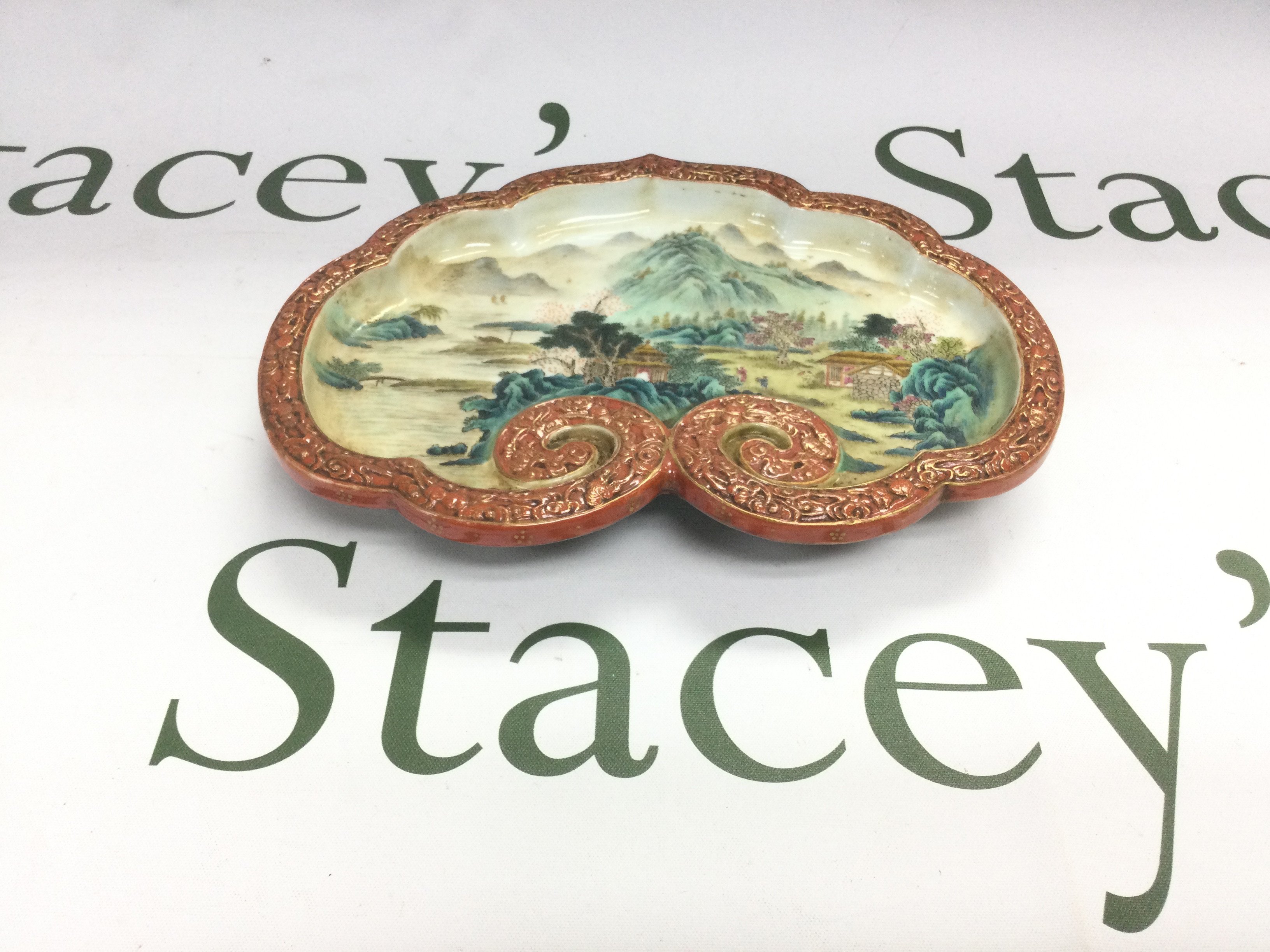An Oriental handpainted shaped dish or brush washer, approx width 20cm. Shipping category D.