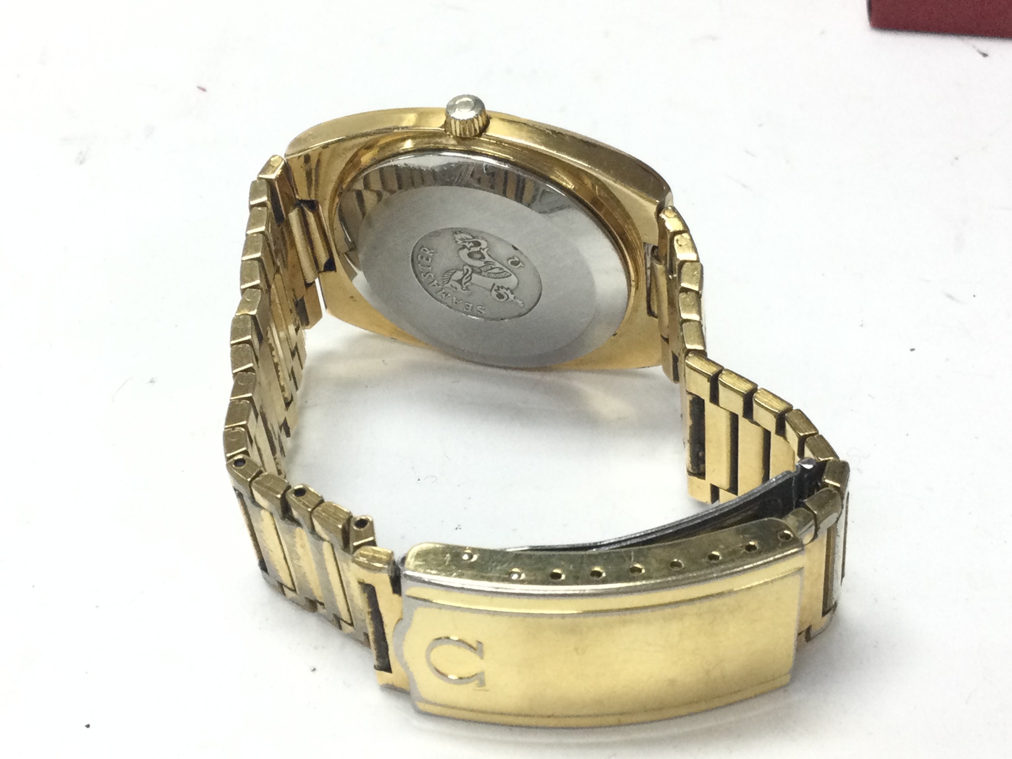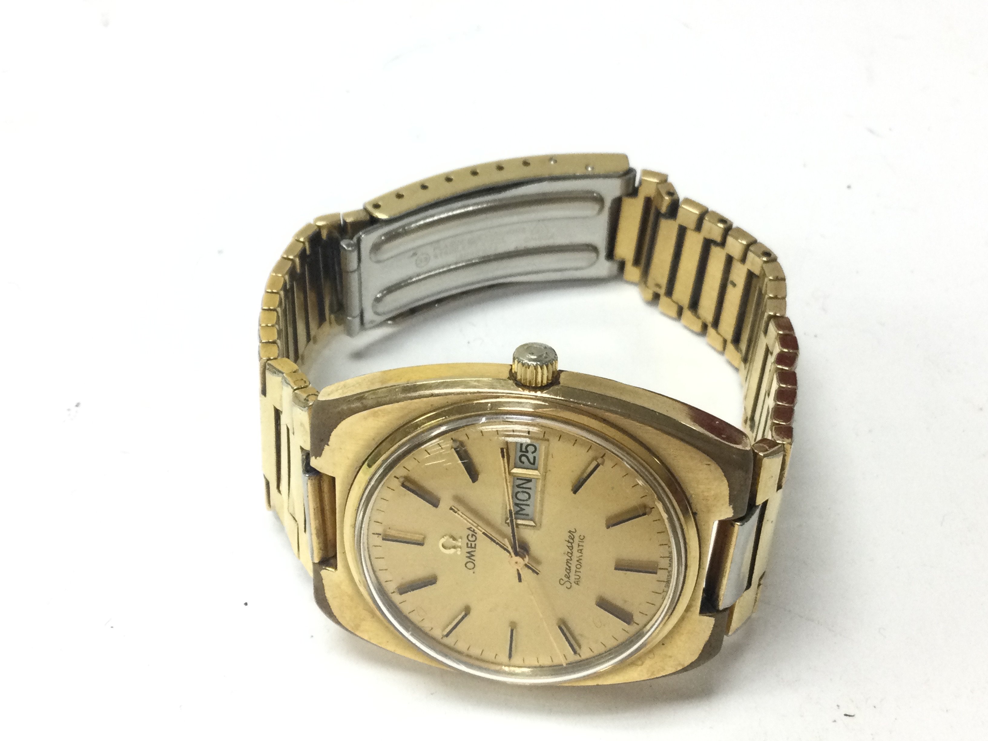 An Omega Seamaster day date automatic wrist watch. Circa 1978 gold plated. Cal 1020. Comes with omega box and outer dust box. Seen running. Postage B