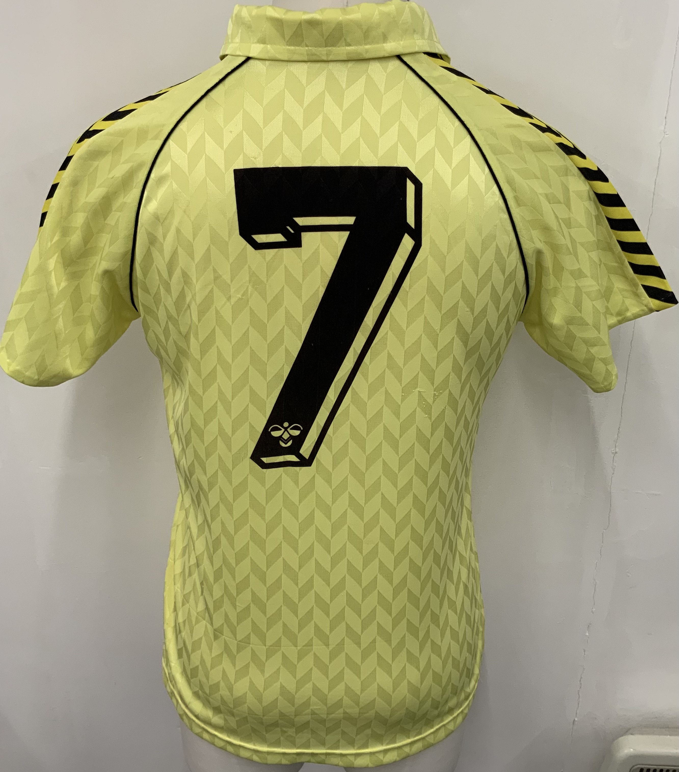 Wales 1987 Match Worn Away Football Kit: Yellow large Hummel short sleeve number 7 with tiny mark and scuff to chest. C/W red shorts from same source but not necessarily worn in same match.