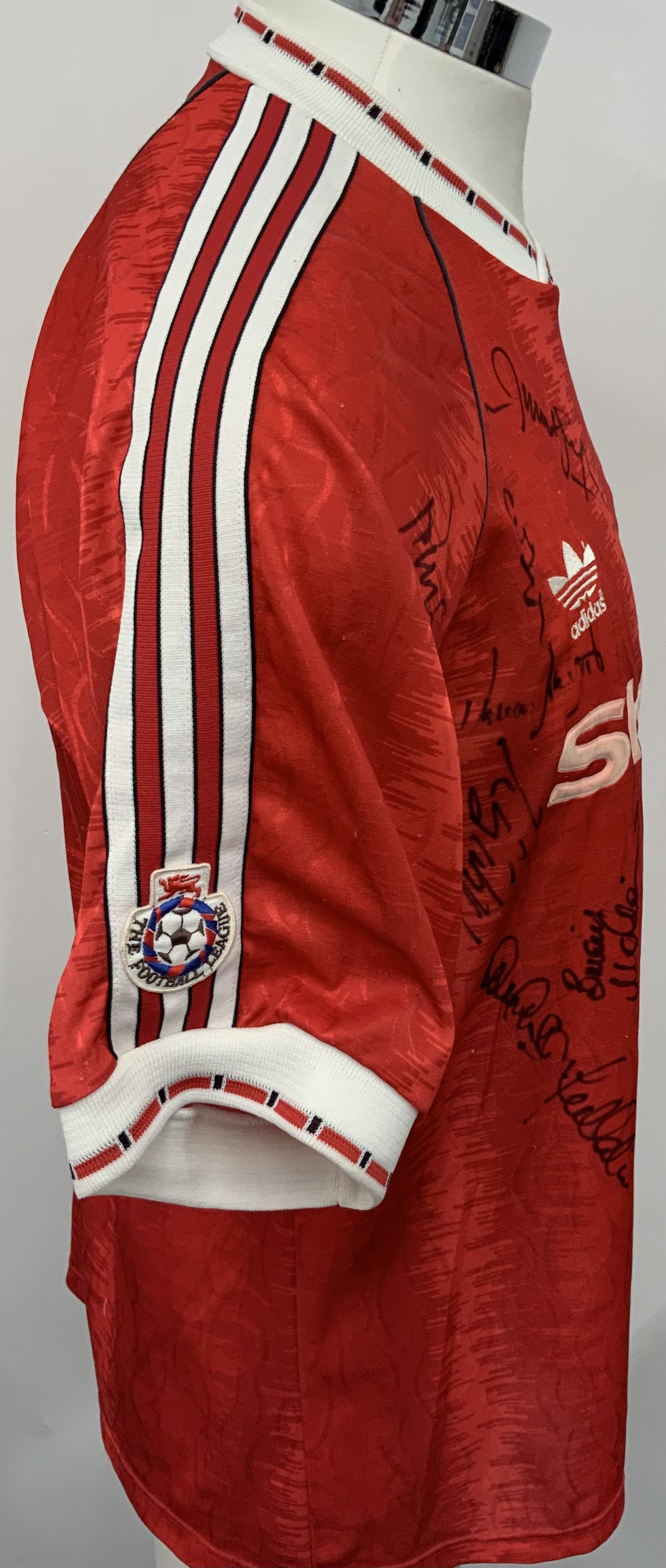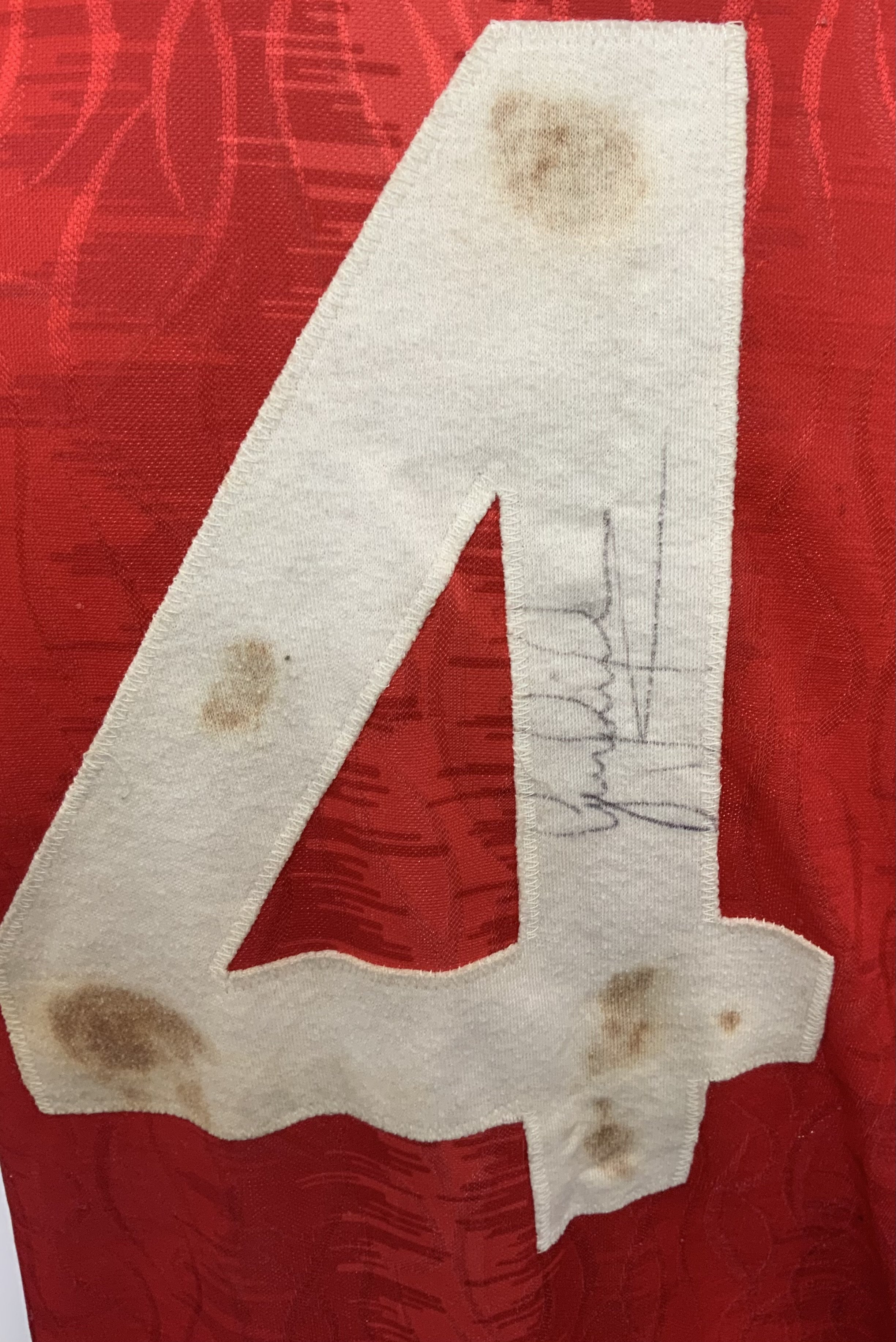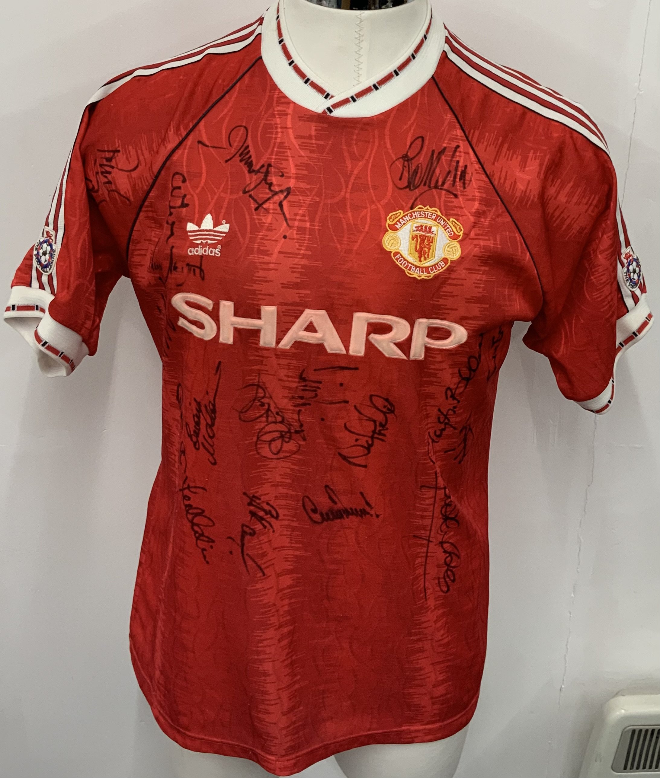 Manchester United 1990 - 1992 Match Worn Bruce Football Shirt: Red short sleeve home Sharp shirt with Football League sleeve badging. Signed to rear dirty number 4 by Pallister and 18 players to front.