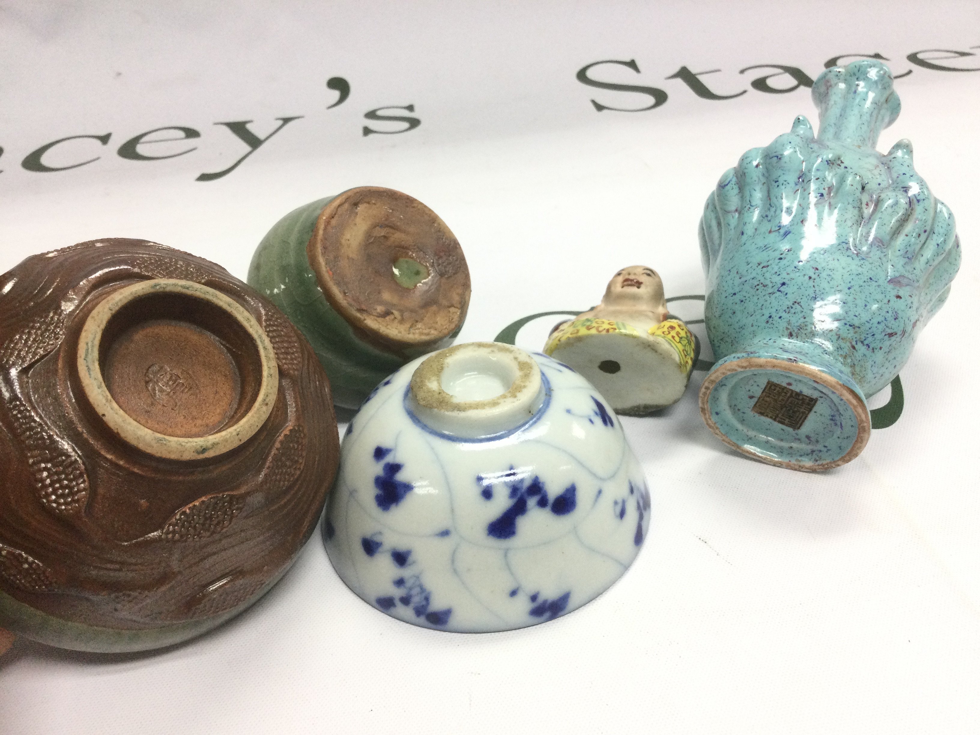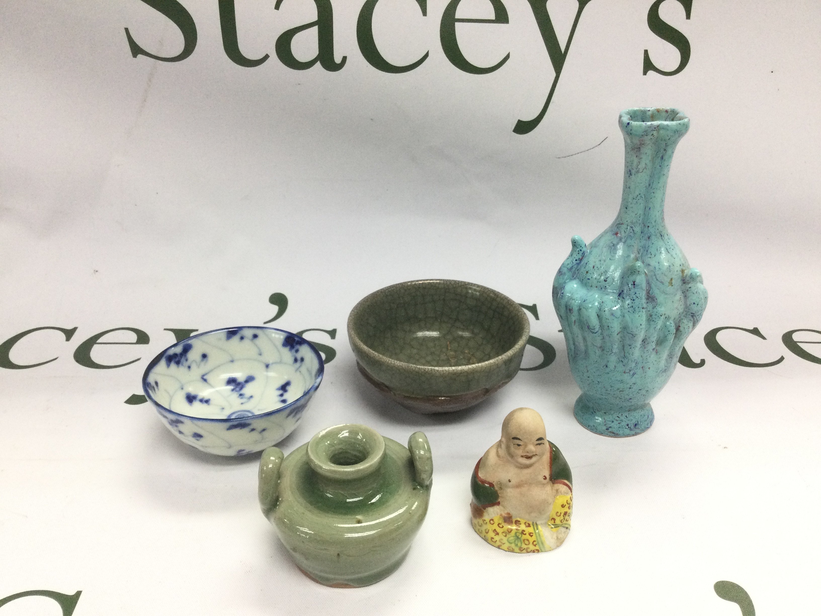Five small Oriental ceramics comprising tea bowls, vases etc. Shipping category D.