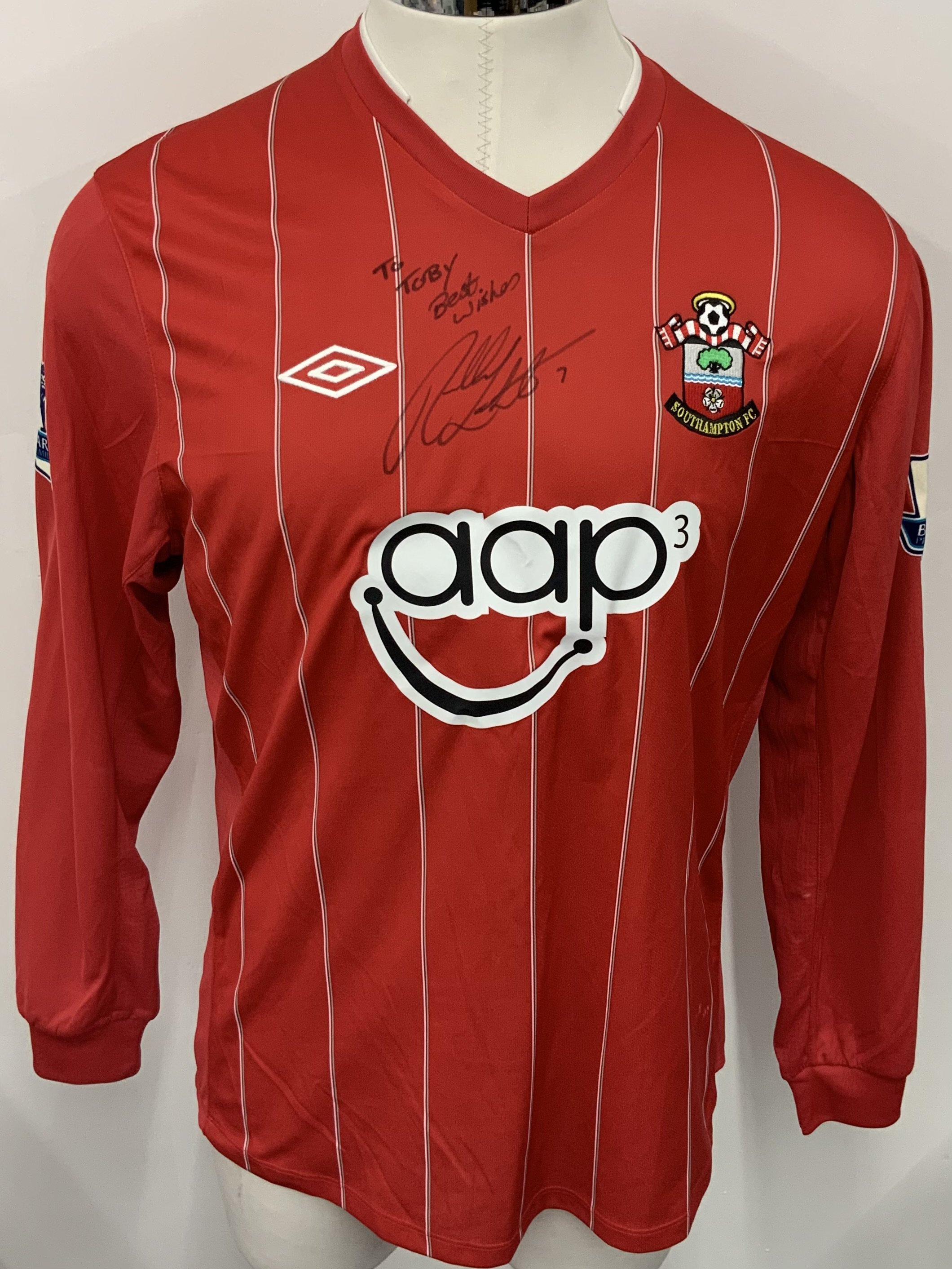Southampton 2012 - 2013 Match Worn Lambert Football Shirt: Red long sleeve home shirt with Premier League sleeve badging. Signed to front and back with dedication. Number 7 Lambert to reverse.
