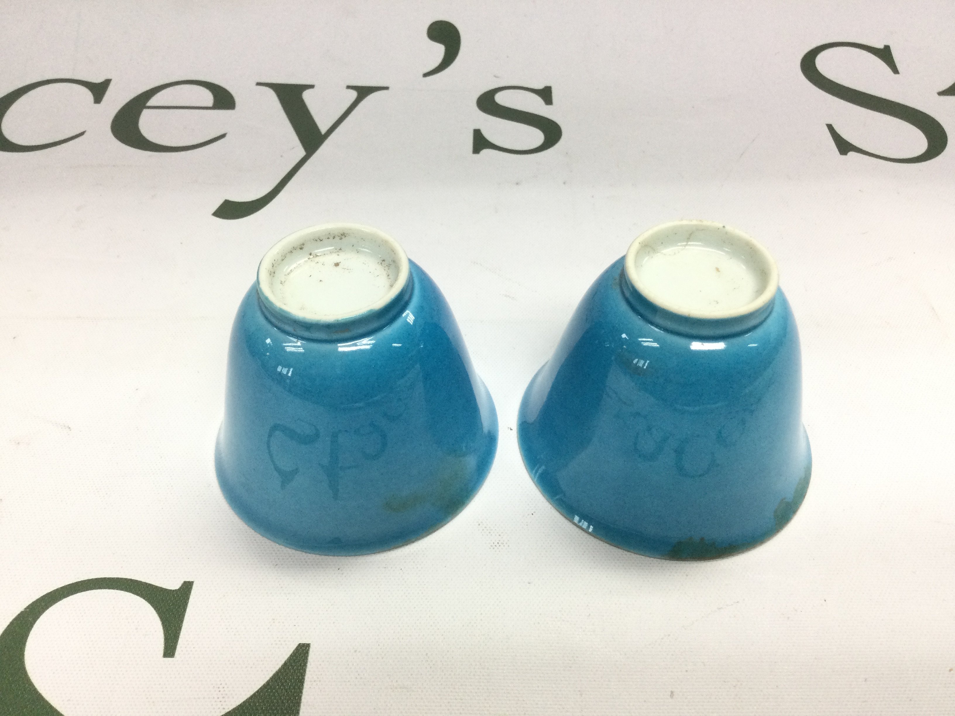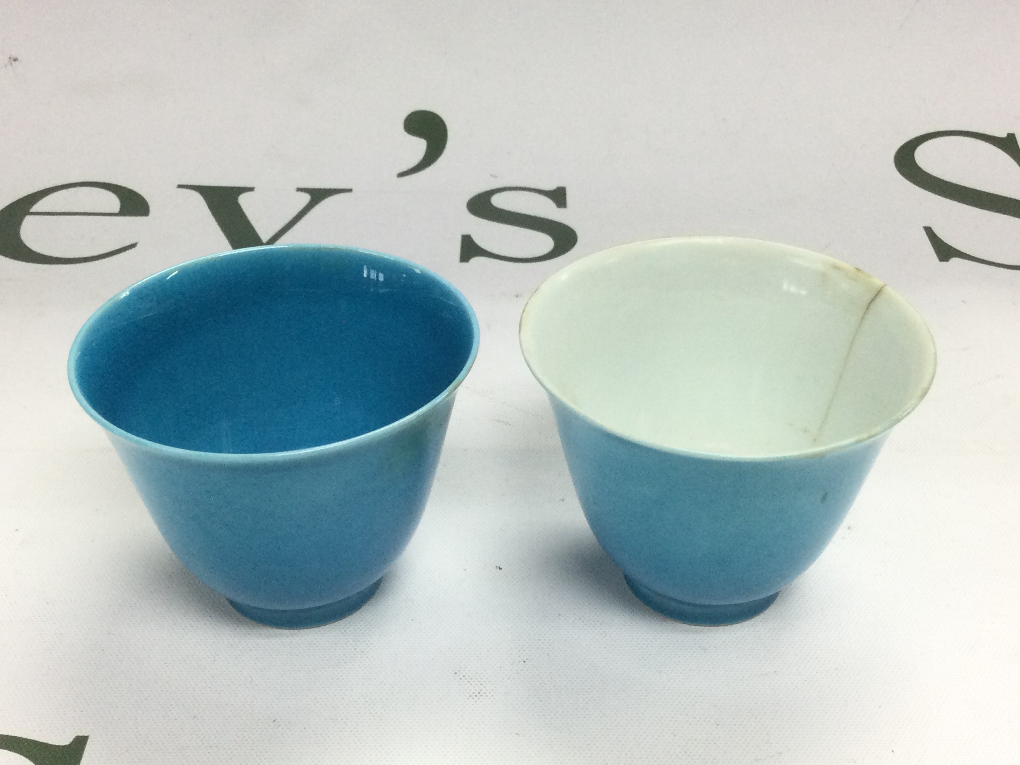 Two rice wine cups in blue, one with a white interior and cracked, approx height 4.5cm. Shipping category D.