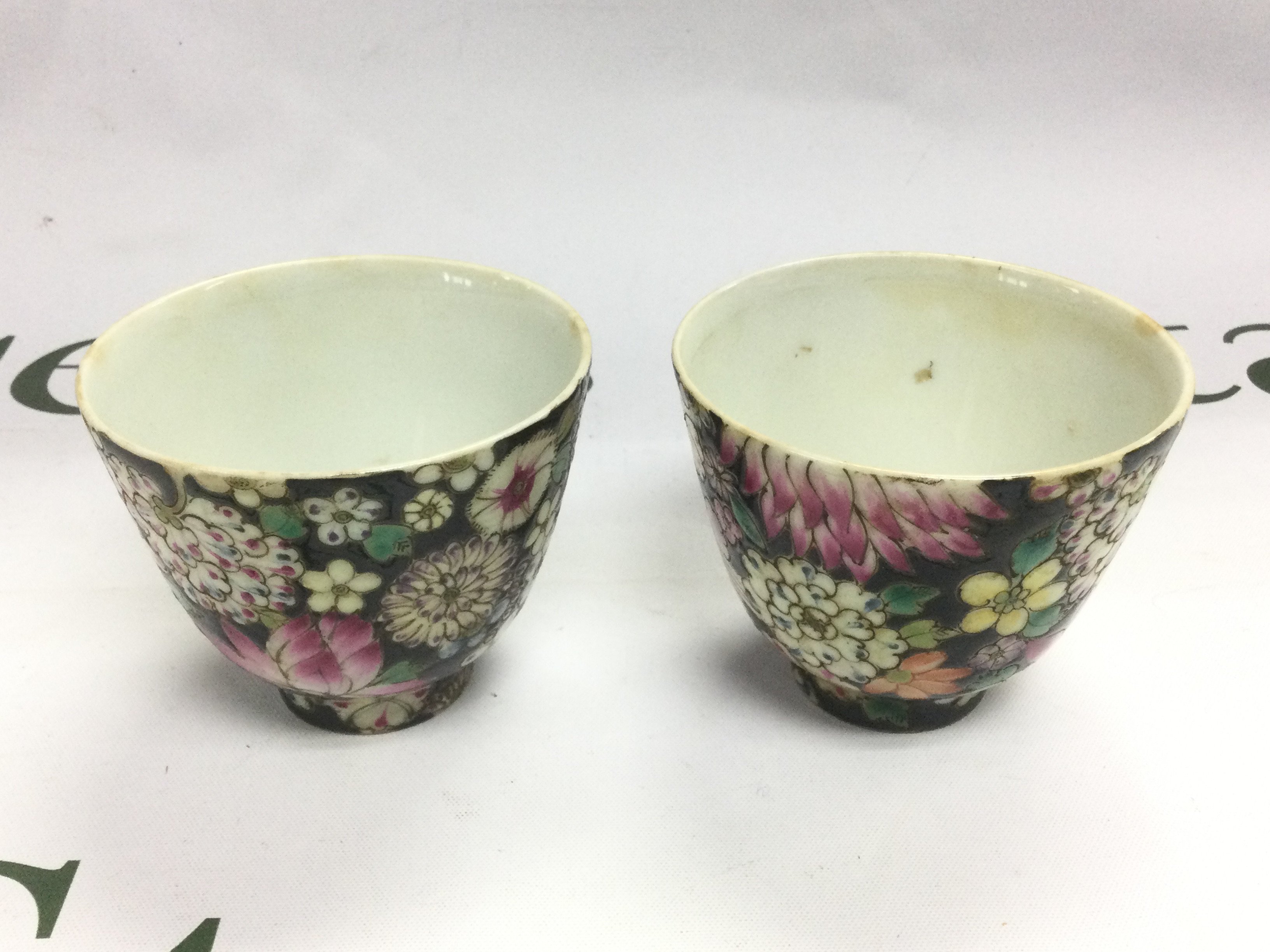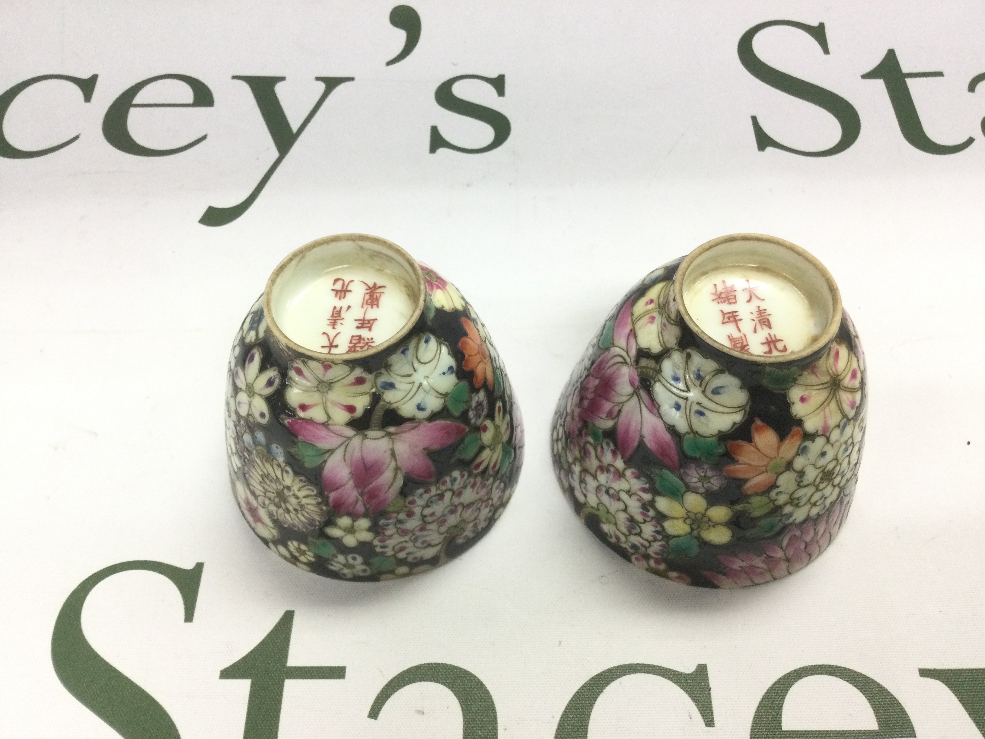 A pair of rice wine cupswith elaborate floral decoration on a black ground, six character marks to base, approx height 6.5cm. Shipping category D.