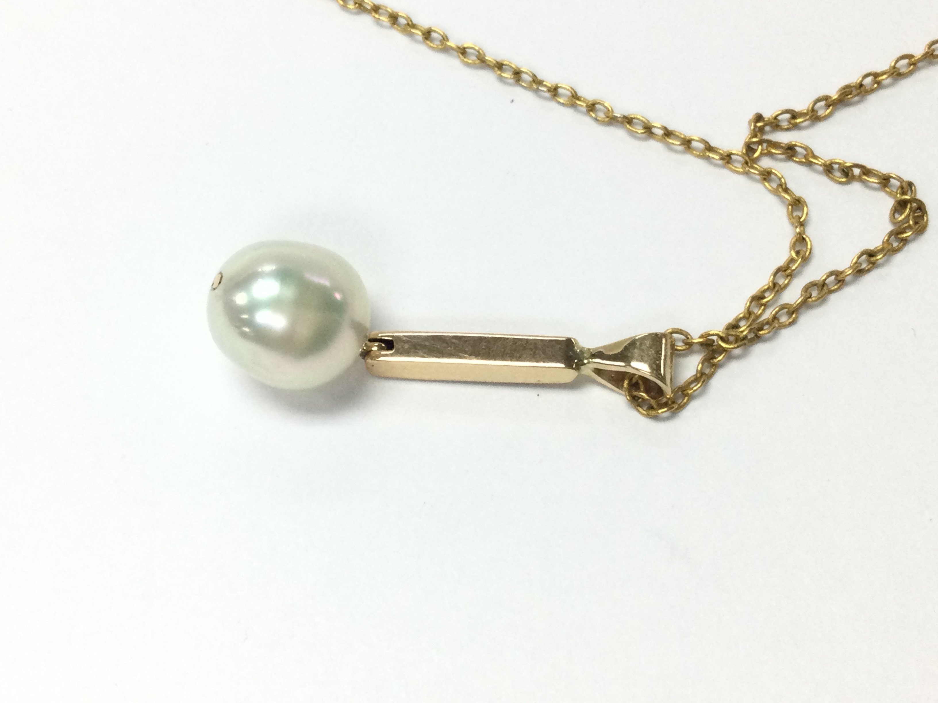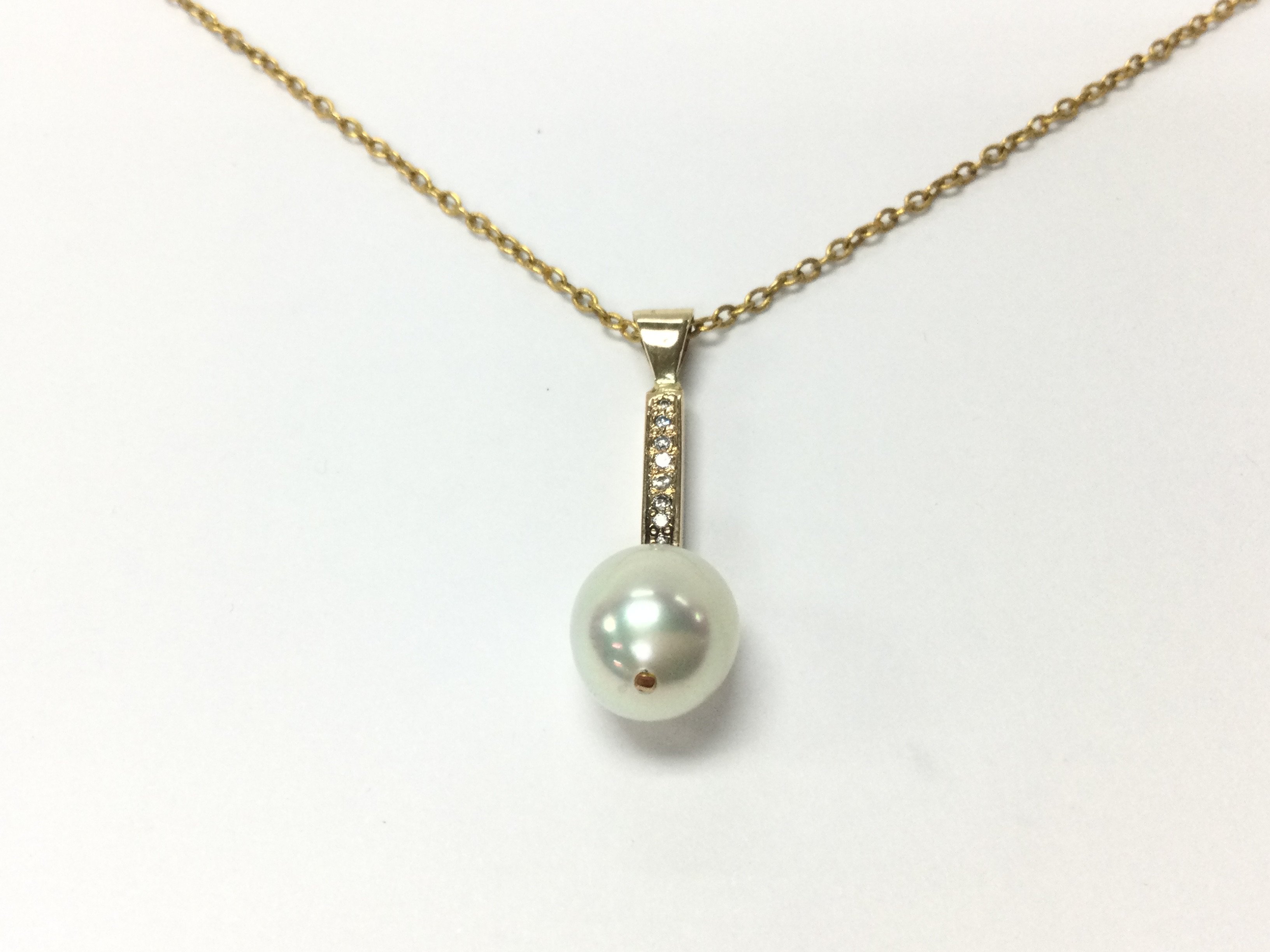 A pearl pendant set in gold with small diamonds. Comes with a chain which is not gold. Postage B