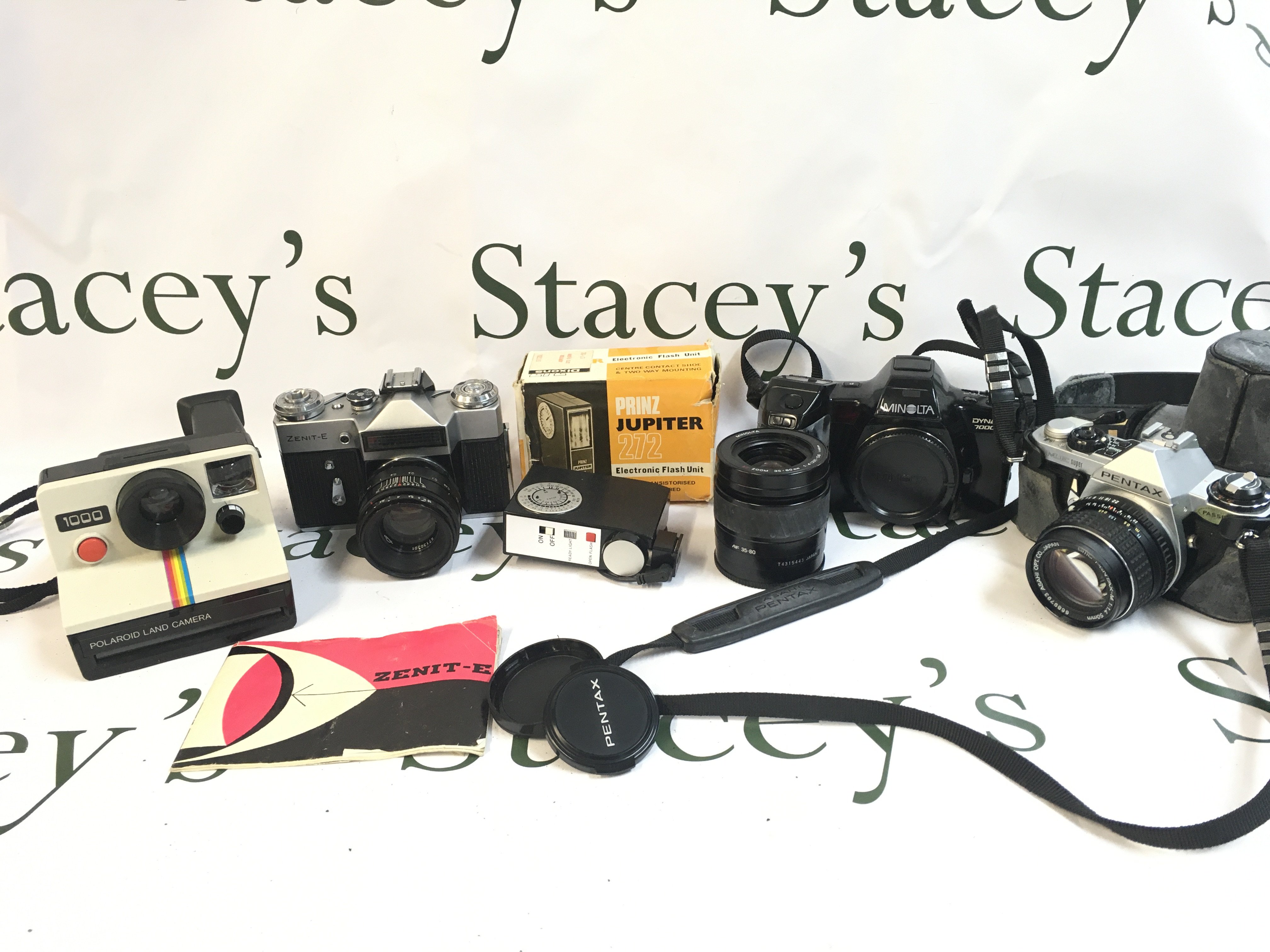 A Collection of vintage cameras Polaroid Land Camera, Zenit-E, Minolta Dynax 7000i, Pentax. Postage category C
