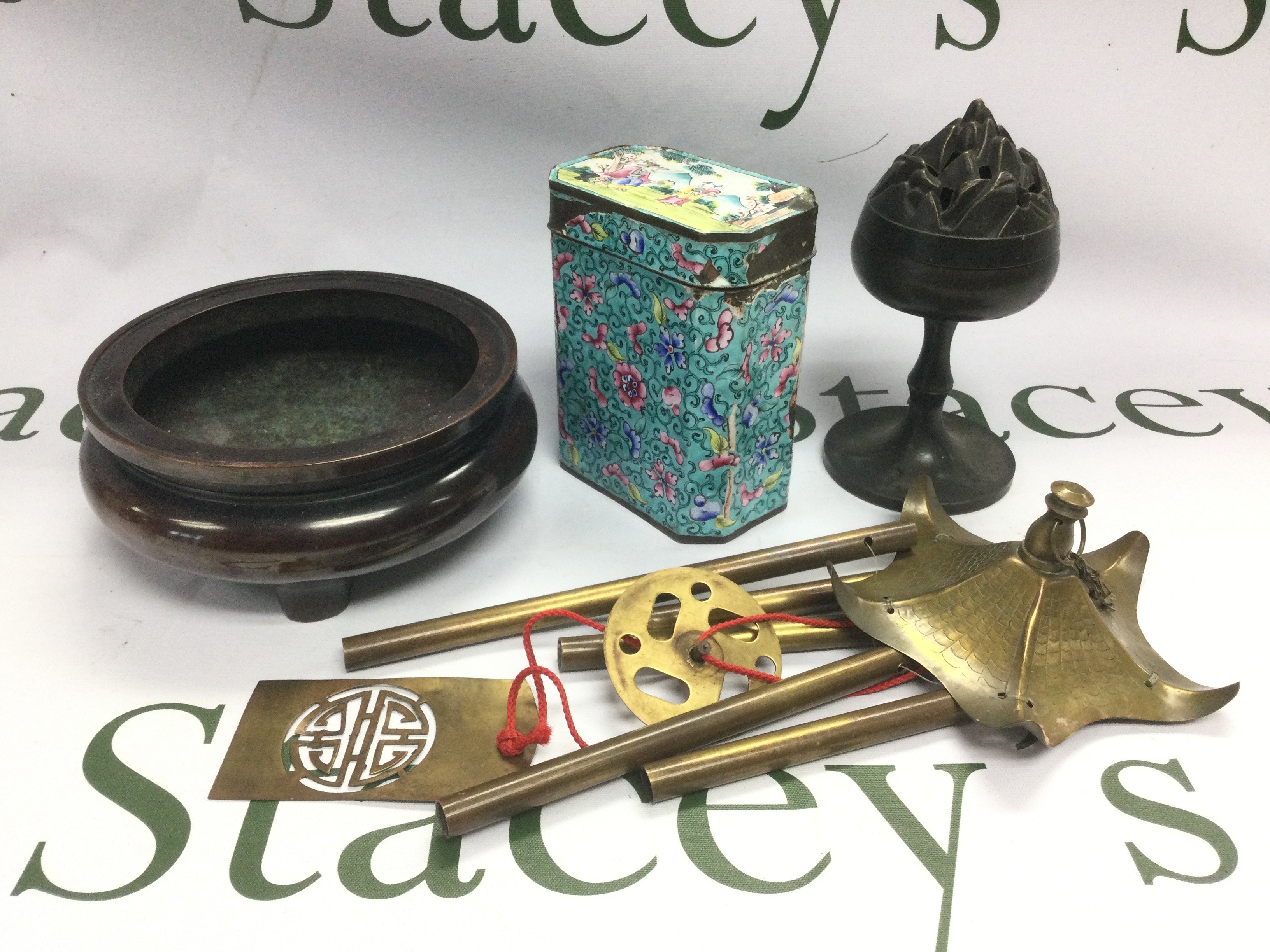 A small box of items comprising a heavy bronzed bowl, enamel container, wind chimes etc. Shipping category D.