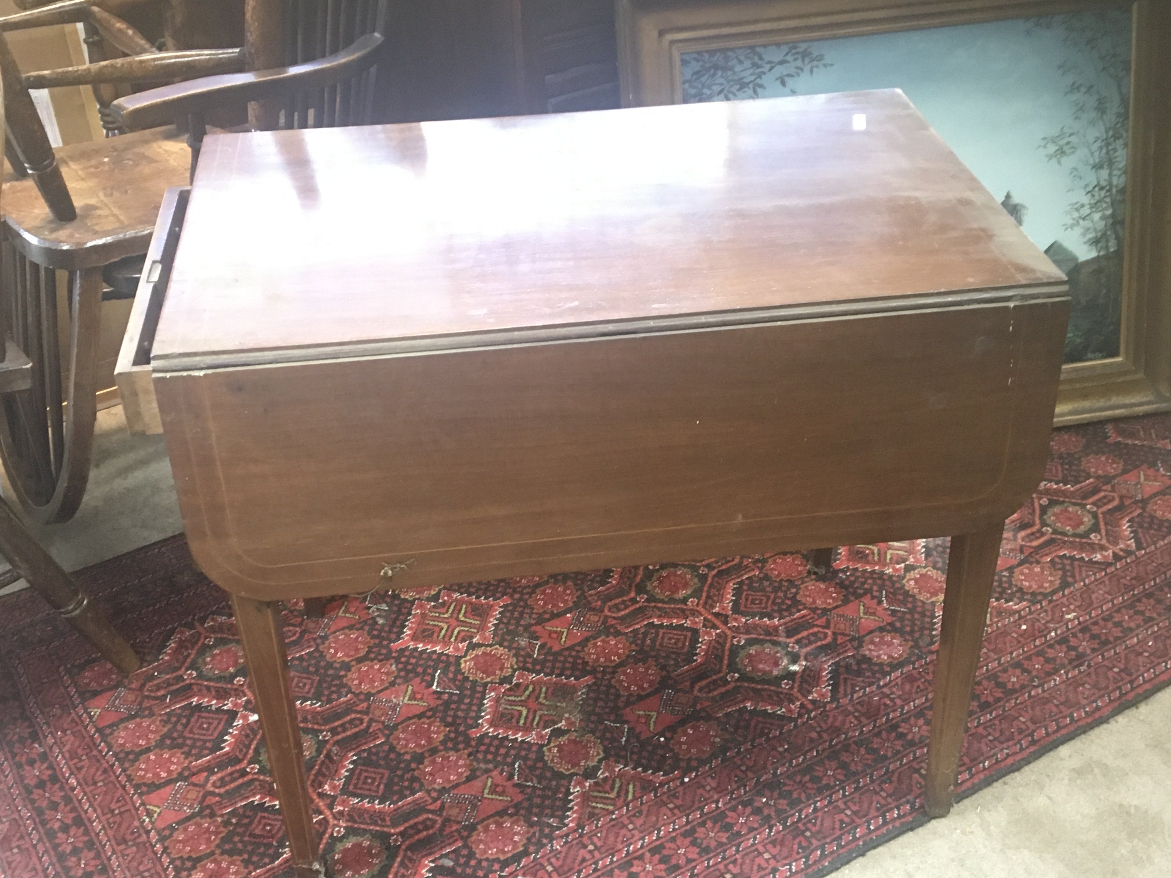 A Mahogany Pembroke table the twin flap top with boxwood banding fitted with an oak lined drawer.