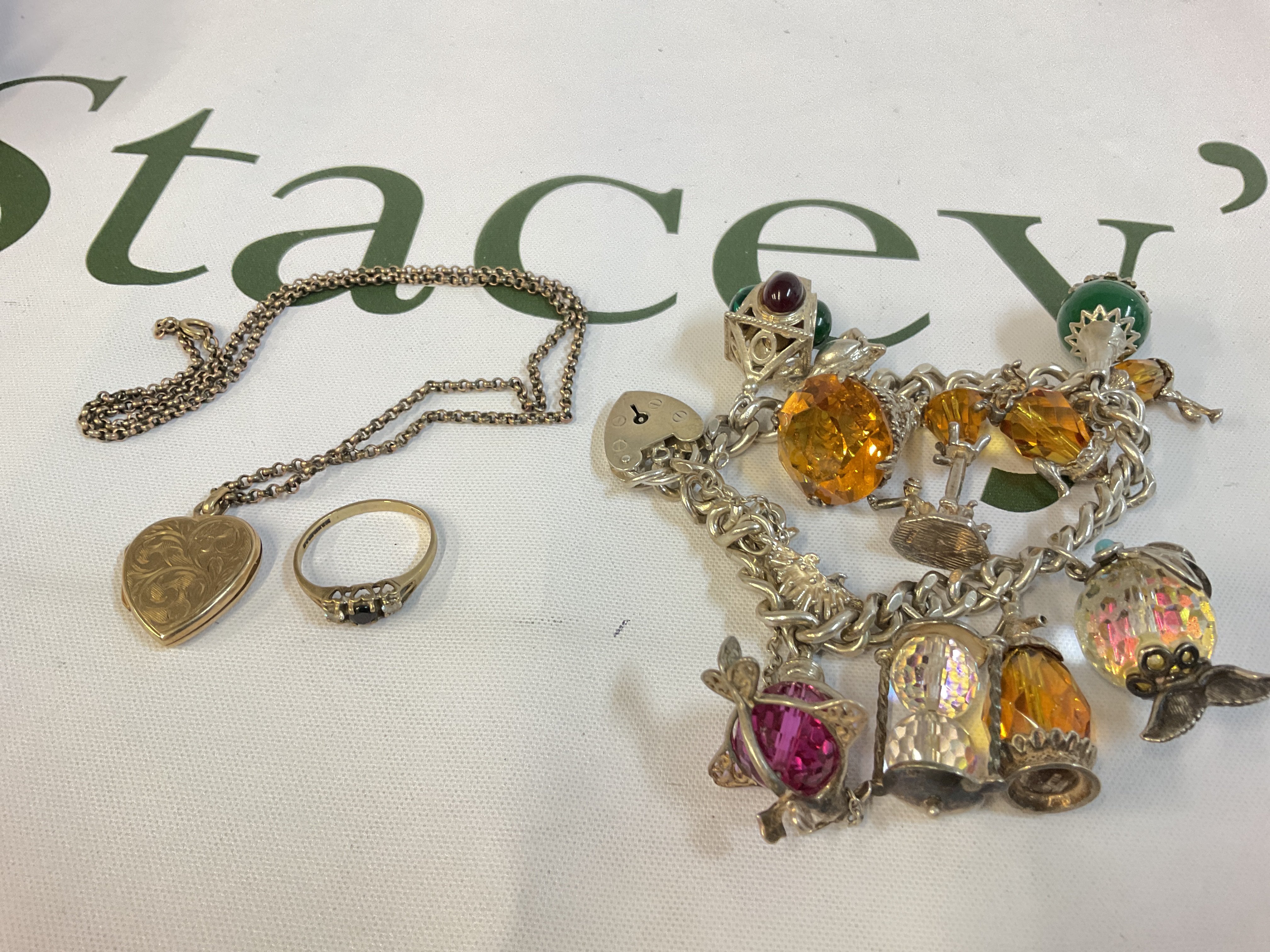 A collection of jewellery including a 9ct gold ring, a silver charm bracelet, a 9ct gold locket heart pendant and other jewellery. Postage category A