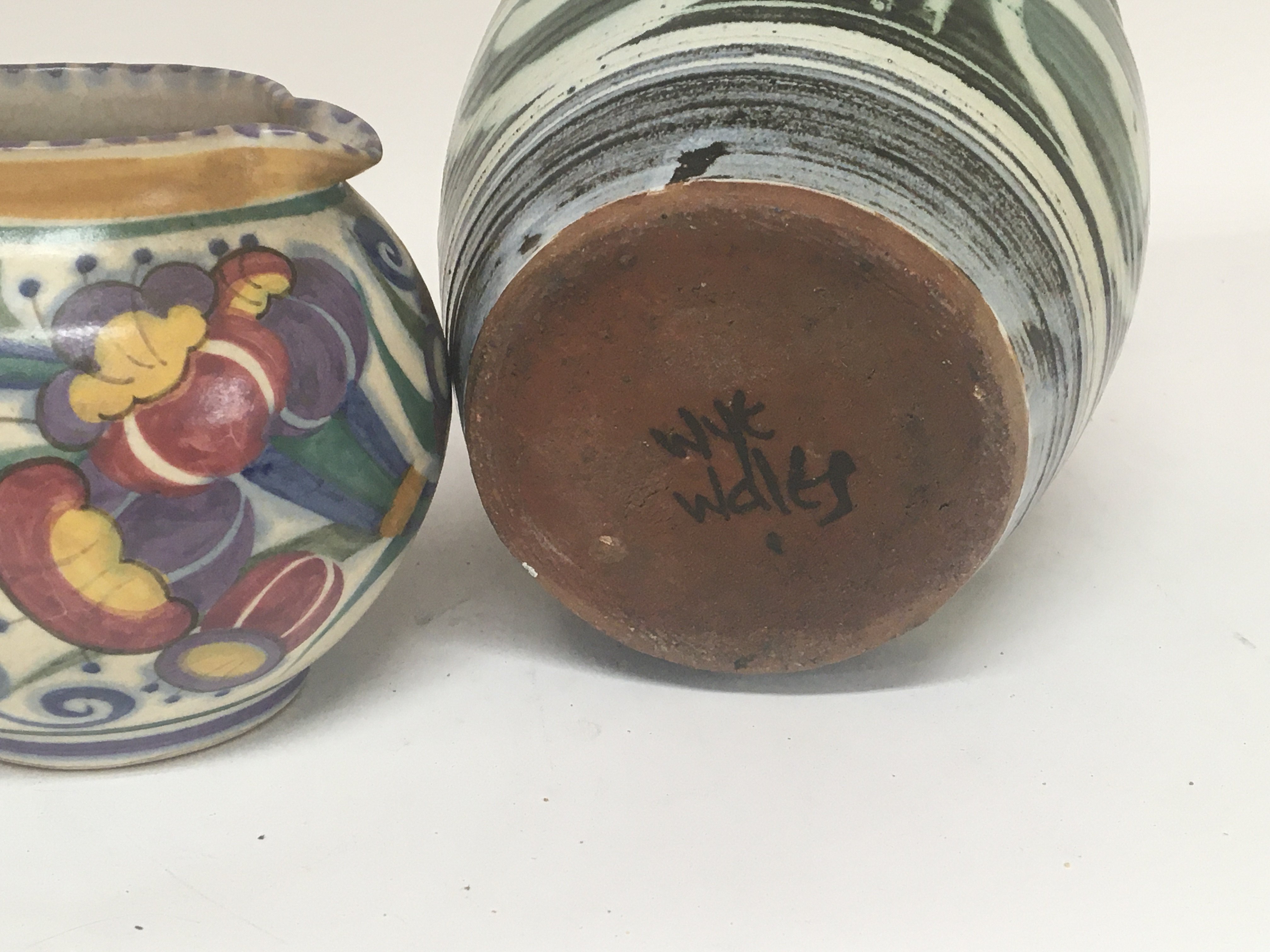 A hand painted Crown Devon jug a Poole pottery jug and a contemporary ceramic vase with marks to the base. (3)