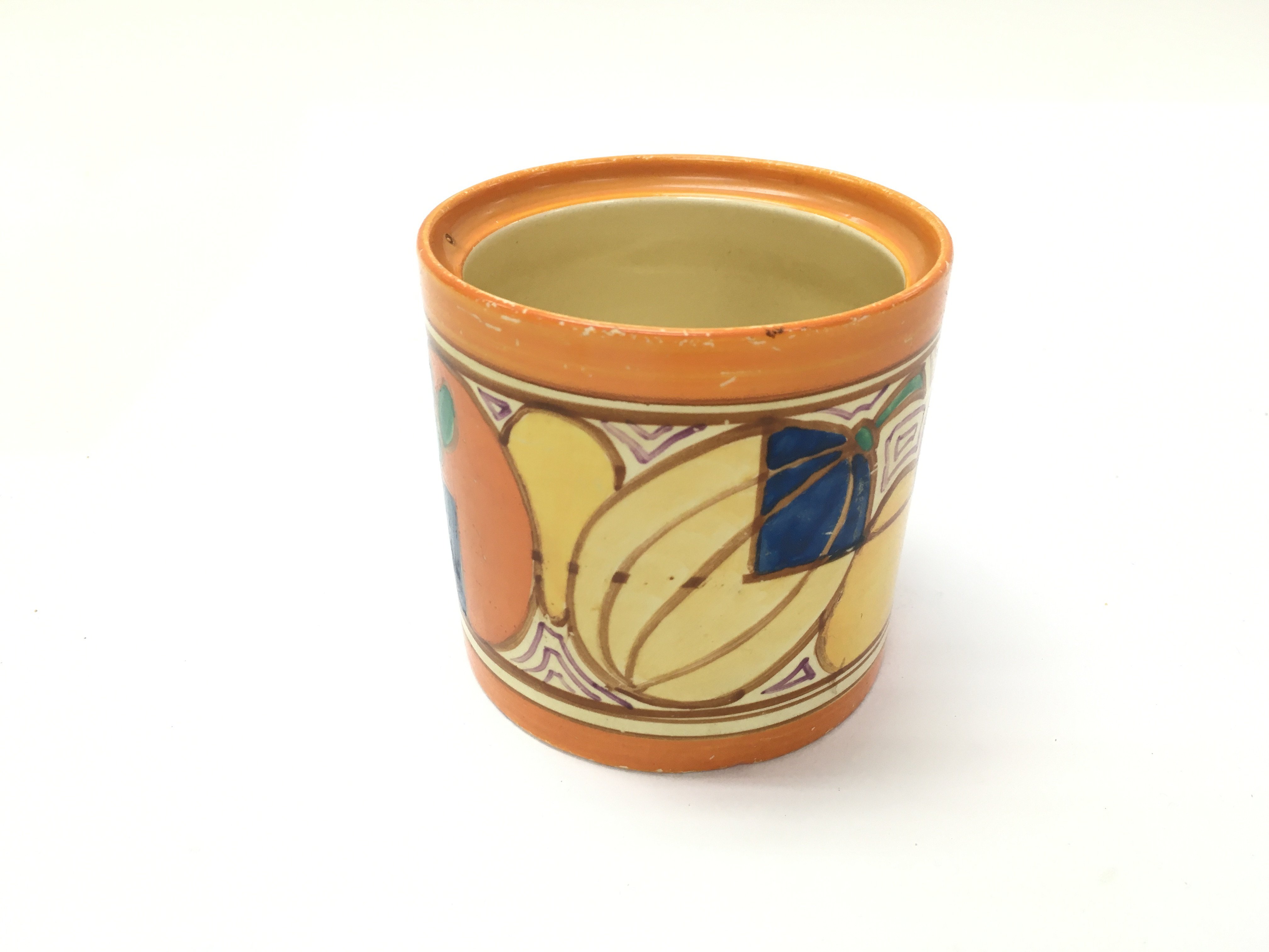 A Clarice cliff ham jar with no lit. 8cm diameter.