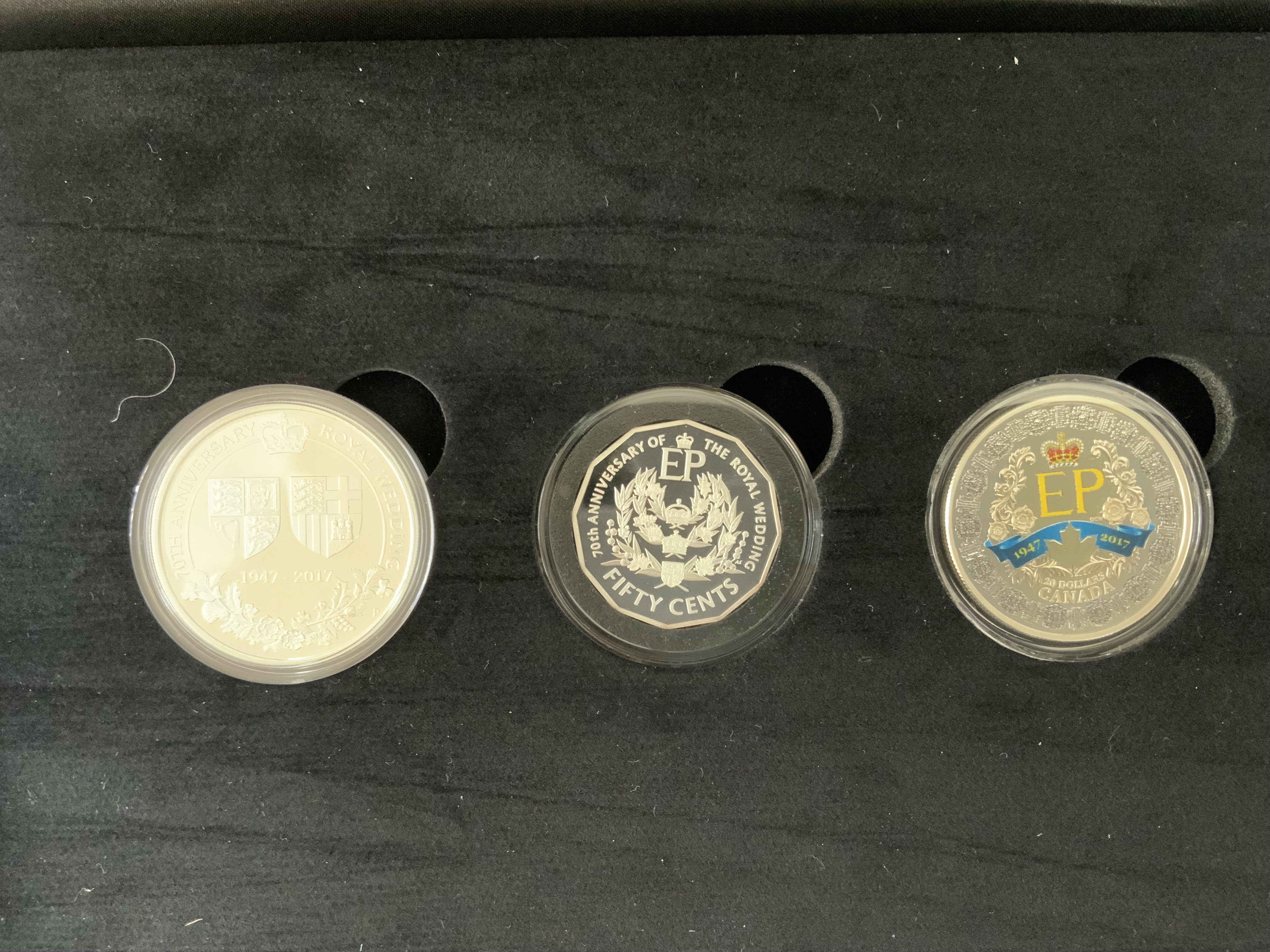 A Penny Black Anniversary Silver coin together with 5 additional commemorative coins, cased set of 3 sterling silver coins (A)