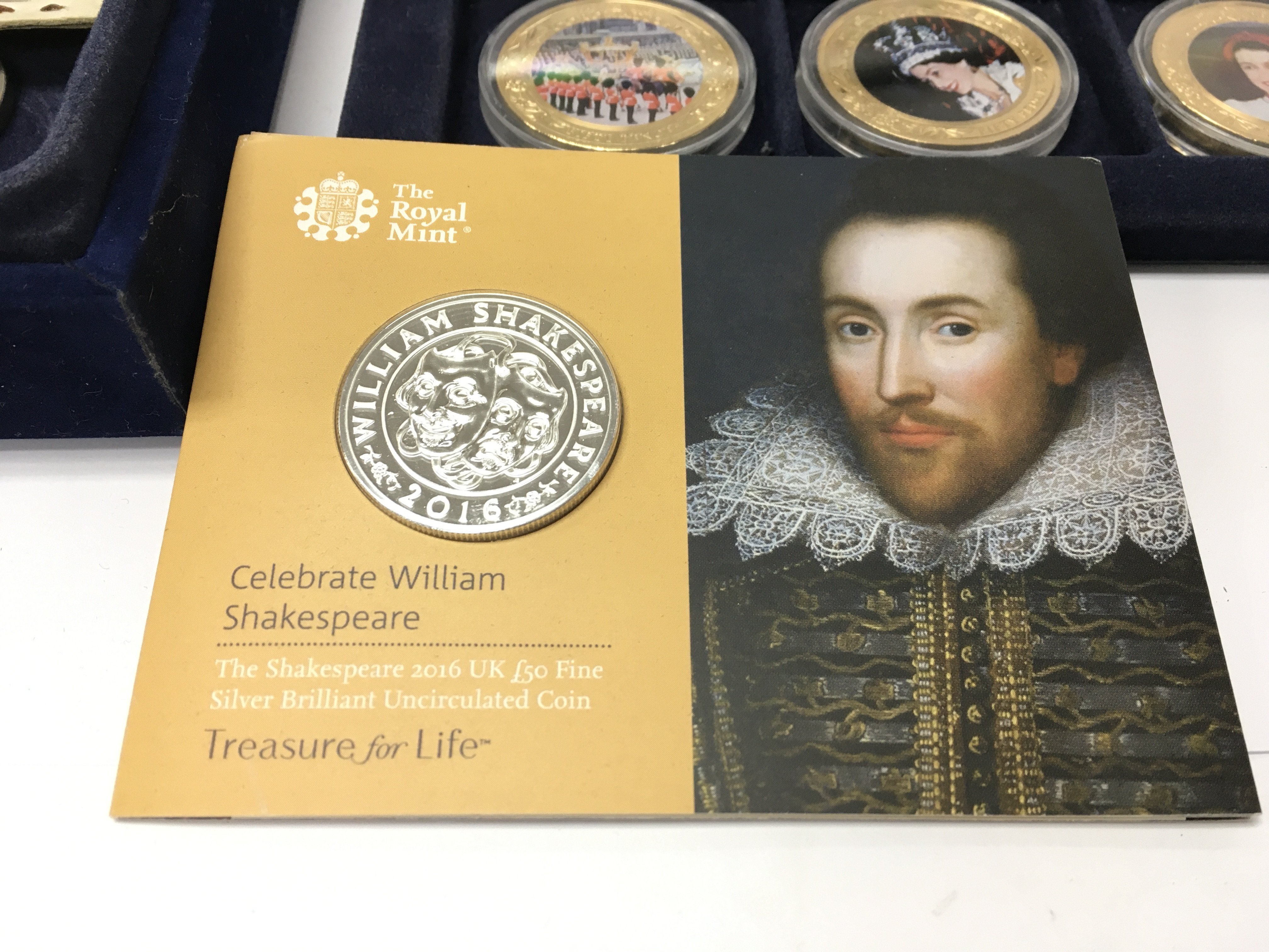 A silver £50 brilliant uncirculated coin and other commemorative coins. Postage B