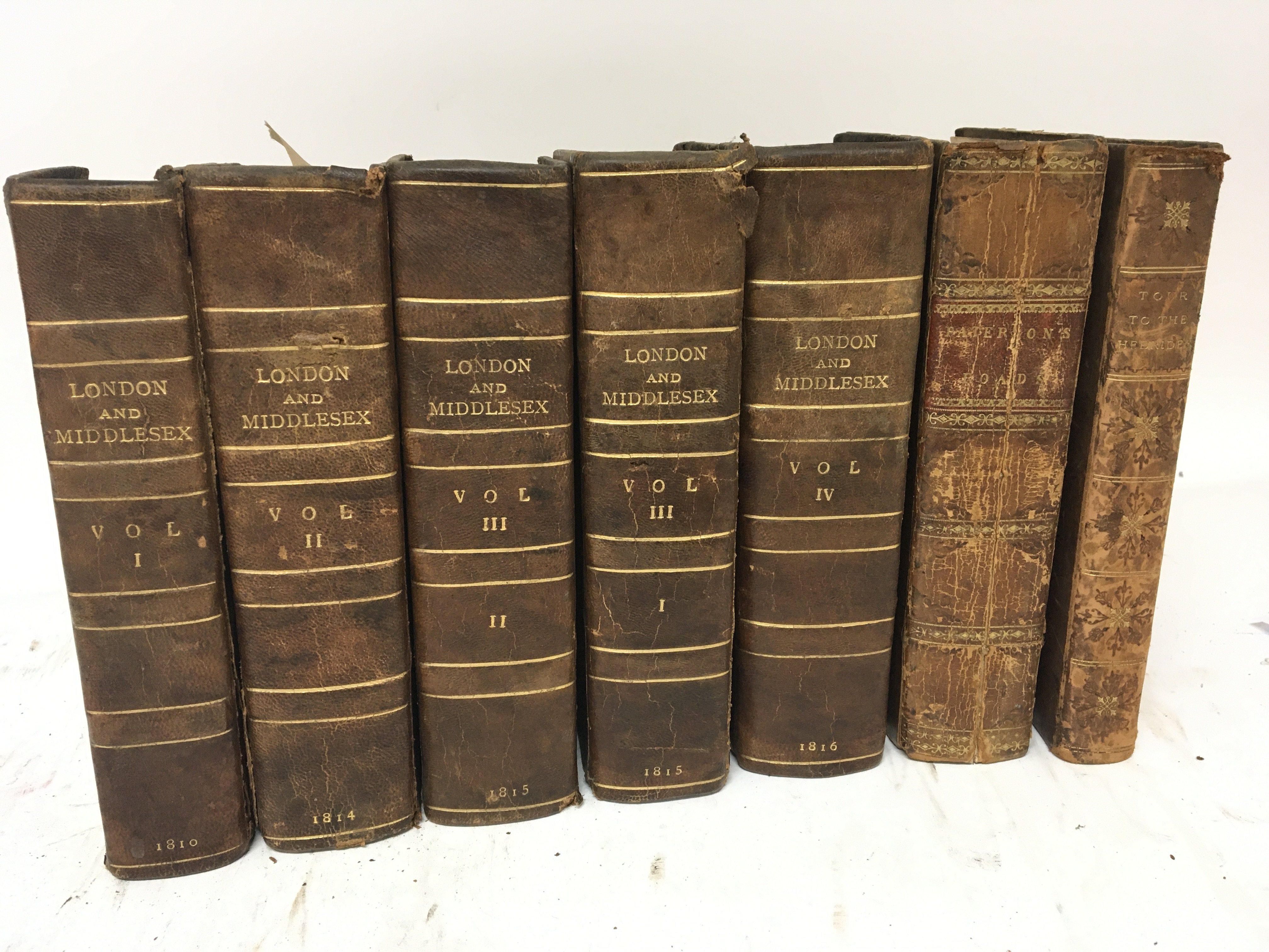 Five volumes of books London and Middlesex 1810-1816 by Edward Wedlake Brayley and Tour to the Hebrides by Samuel Johnson 1813 also Patersons Roads 1826 with attached map.