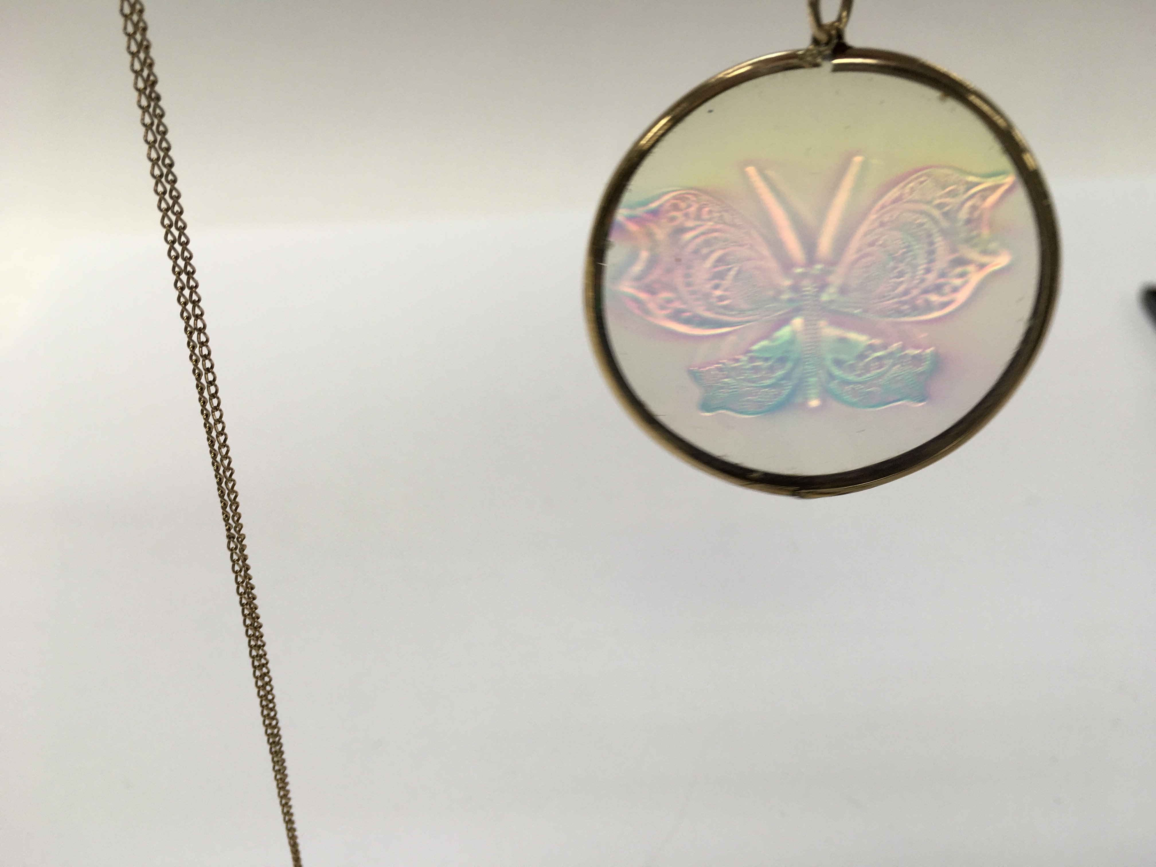 A 9ct gold chain with a butterfly hologram pendant. 8.6g total
