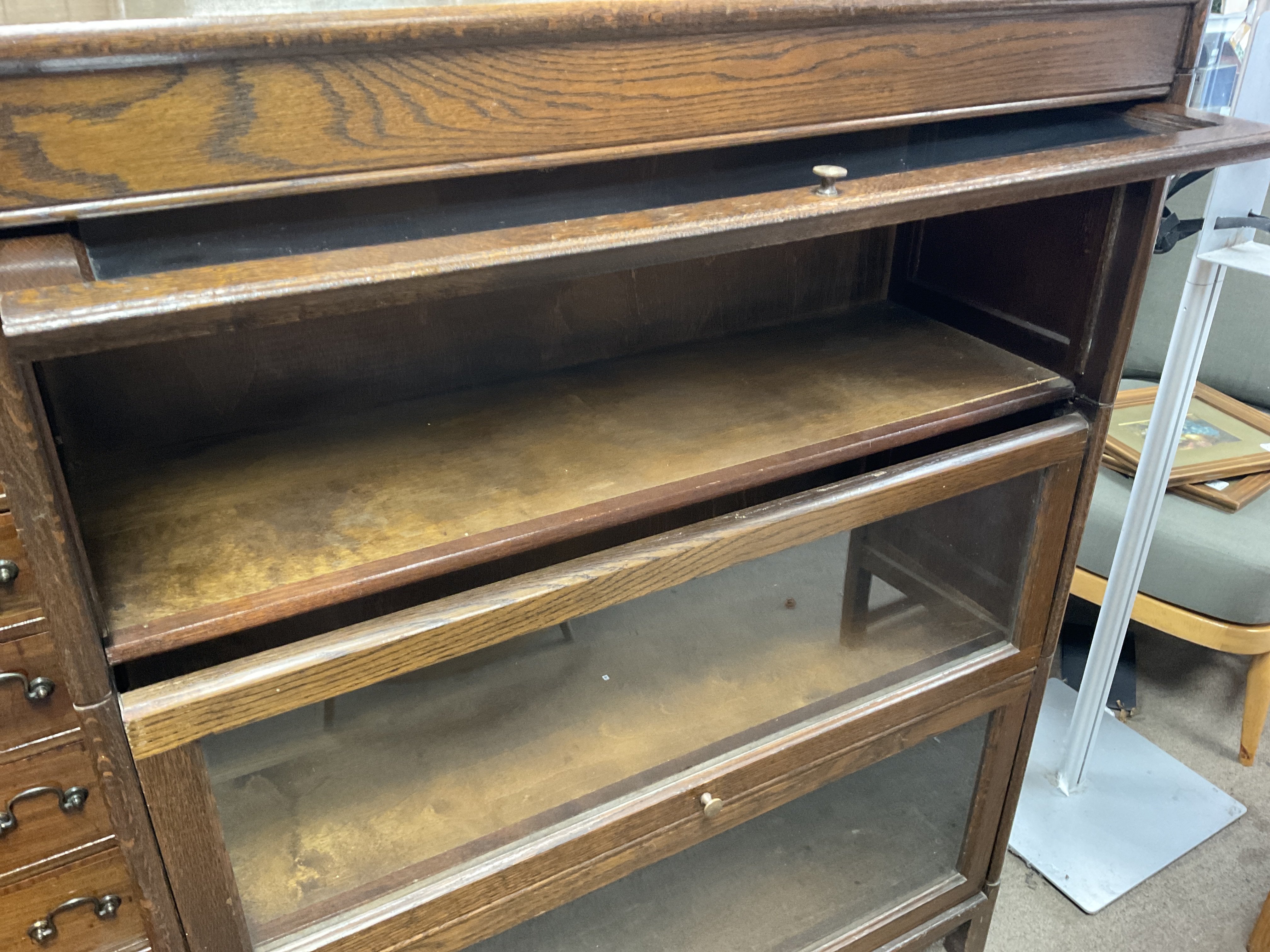 An oak three tier Globe Wernicke style bookcase by Angus , dimensions 31x87x123cm